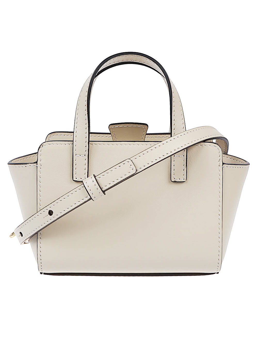 Pouch set inside one of the handles that blends perfectly with the structure of the bag, magnetic closure, adjustable and removable shoulder strap, flat bottom, gold-plated metal hardware, internal pockets and fully lined in cotton.