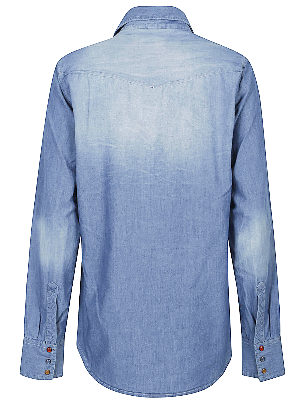Denim shirt, oversized, snap button closure, colored embroidered details.