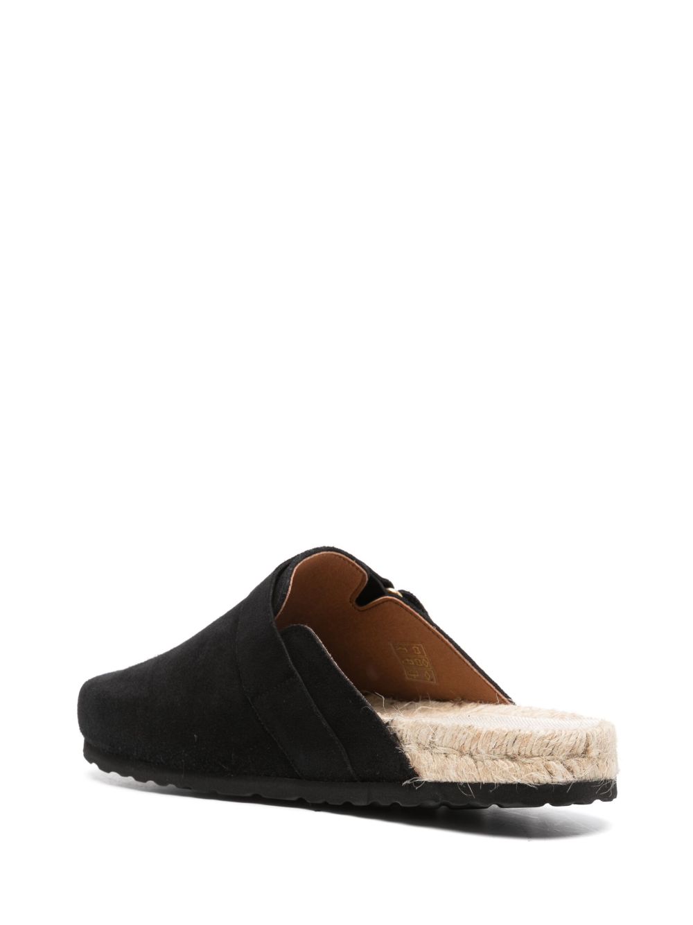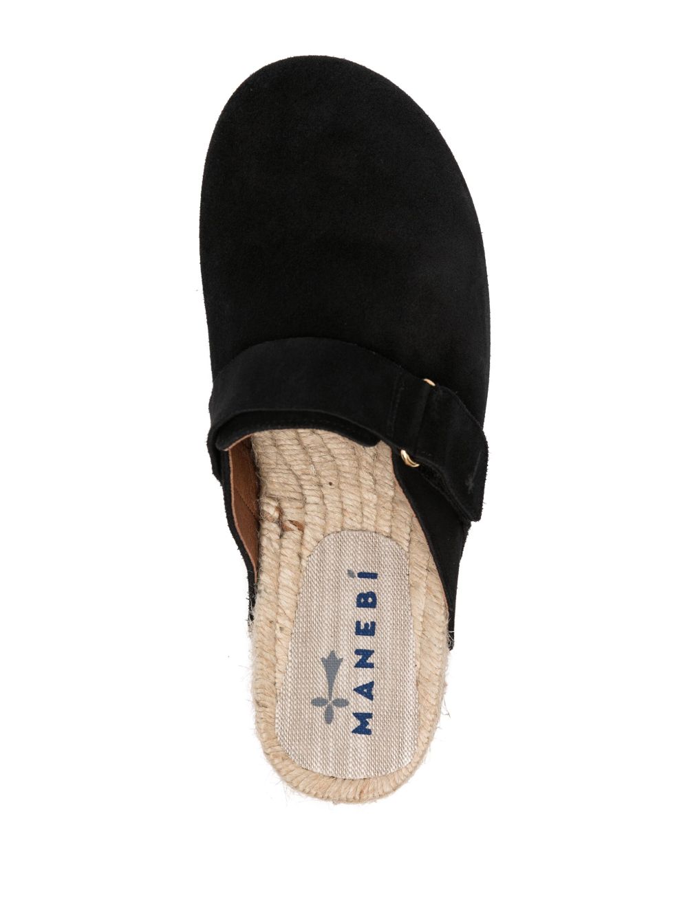 Black, calfskin, leather insole with logo, round toe, slip-on design, woven raffia sole and flat rubber sole. | Manebi