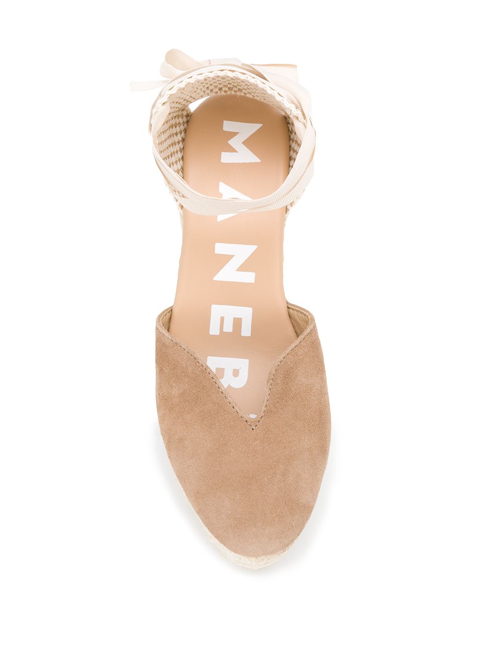 Brown, beige, leather, cotton, woven raffia wedge, round toe, ankle knot closure and flat rubber sole. | Manebi