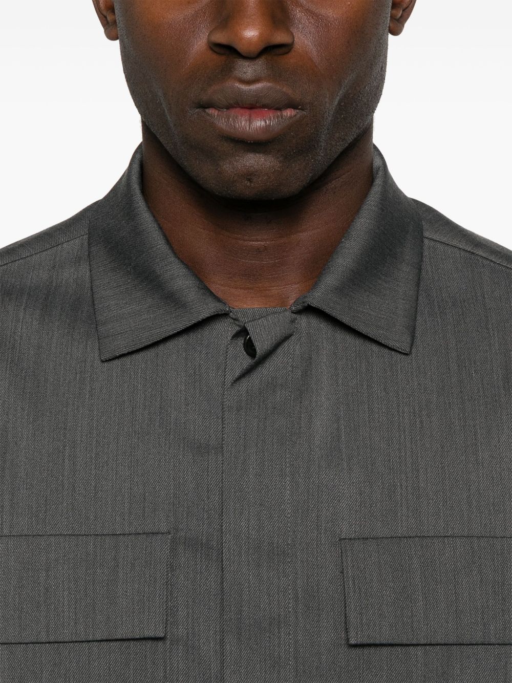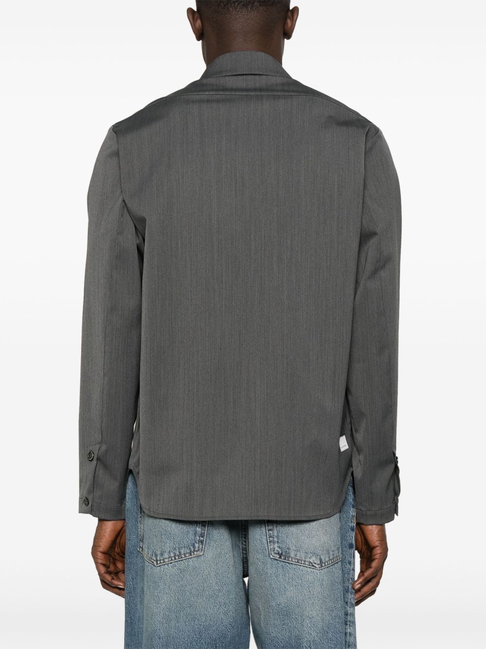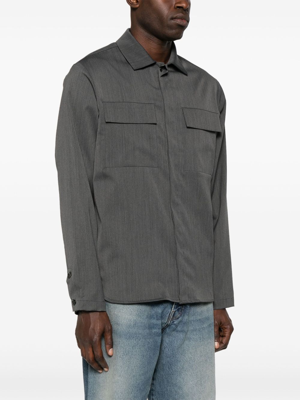 front closure with hidden buttons in anthracite gray color two flap pockets on the chest two side welt pockets sleeves with buttoned cuffs