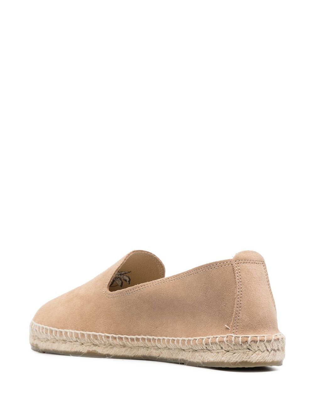 Sand, calf suede, calfskin, embroidery pattern, round toe, slip-on design, logo insole and woven raffia outsole. | Manebi