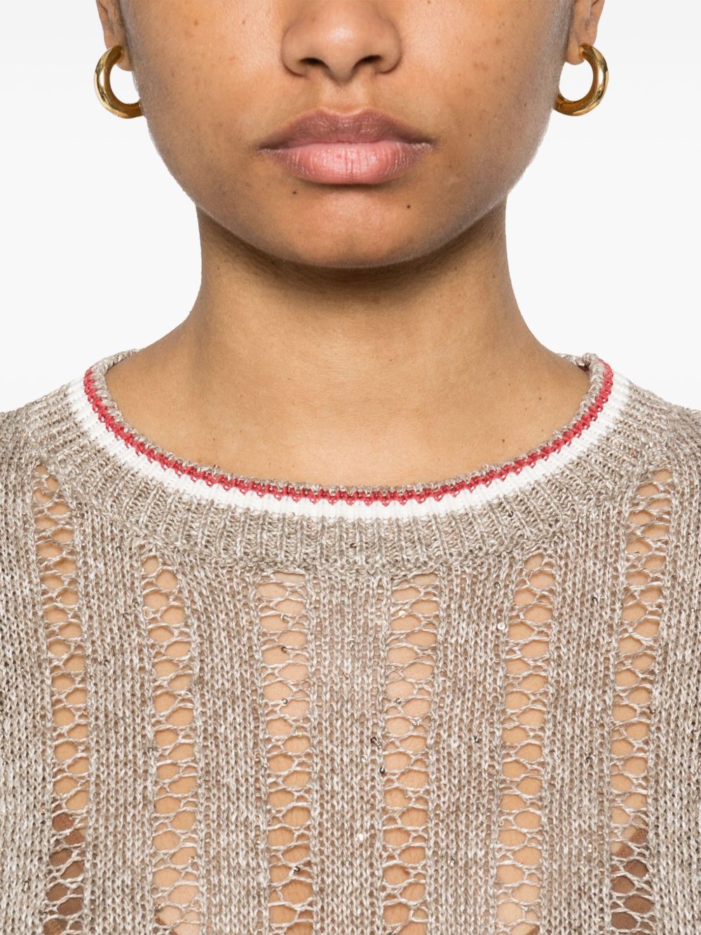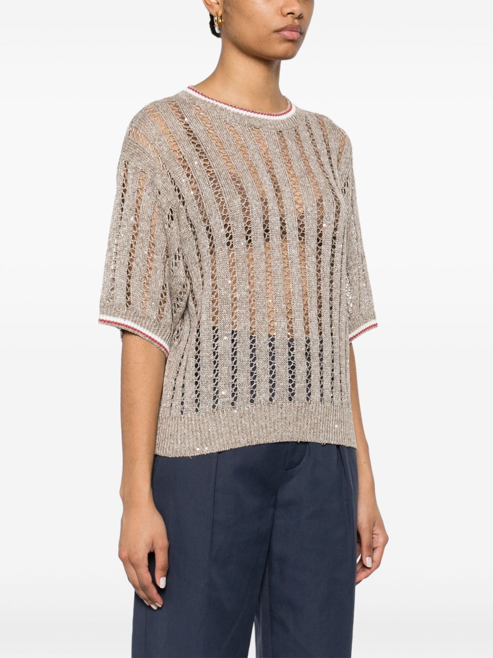 Cenere GB chose this garment for its high stylistic content and eco-sustainability. Brunello Cucinelli Knitted T-shirt Origin: Italy Features beige sesame crew neck short sleeves striped detail sequin decoration Composition linen 94%, nylon 6% | Brunello Cucinelli Knitted T-shirt Alfabetica