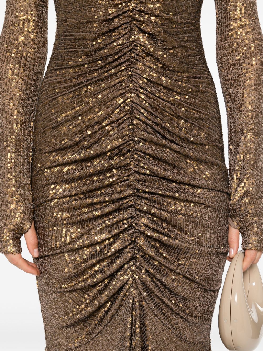 Cenere GB has selected this article for its winning features: Norma Kamali Long sleeve evening dress Characteristics gold colour stretch design long sleeves mermaid design Hidden back zip closure sequin decoration V-neck ruched detail unlined design curved hem floor length Composition 95% polyester, 5% spandex/elastane Washing instructions Hand wash | Norma Kamali Long sleeve evening dress Alfabetica