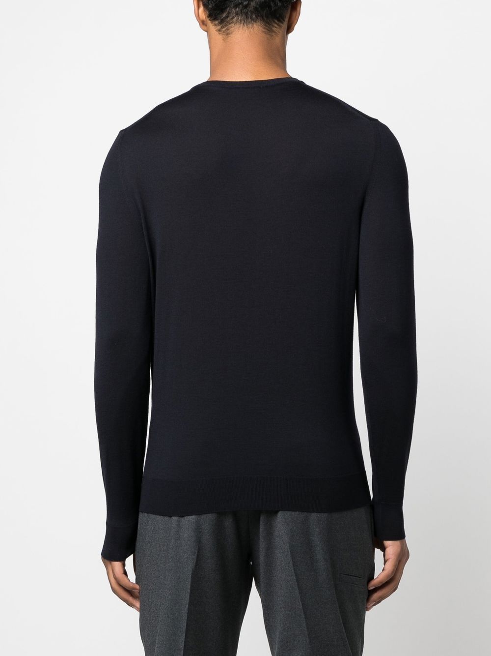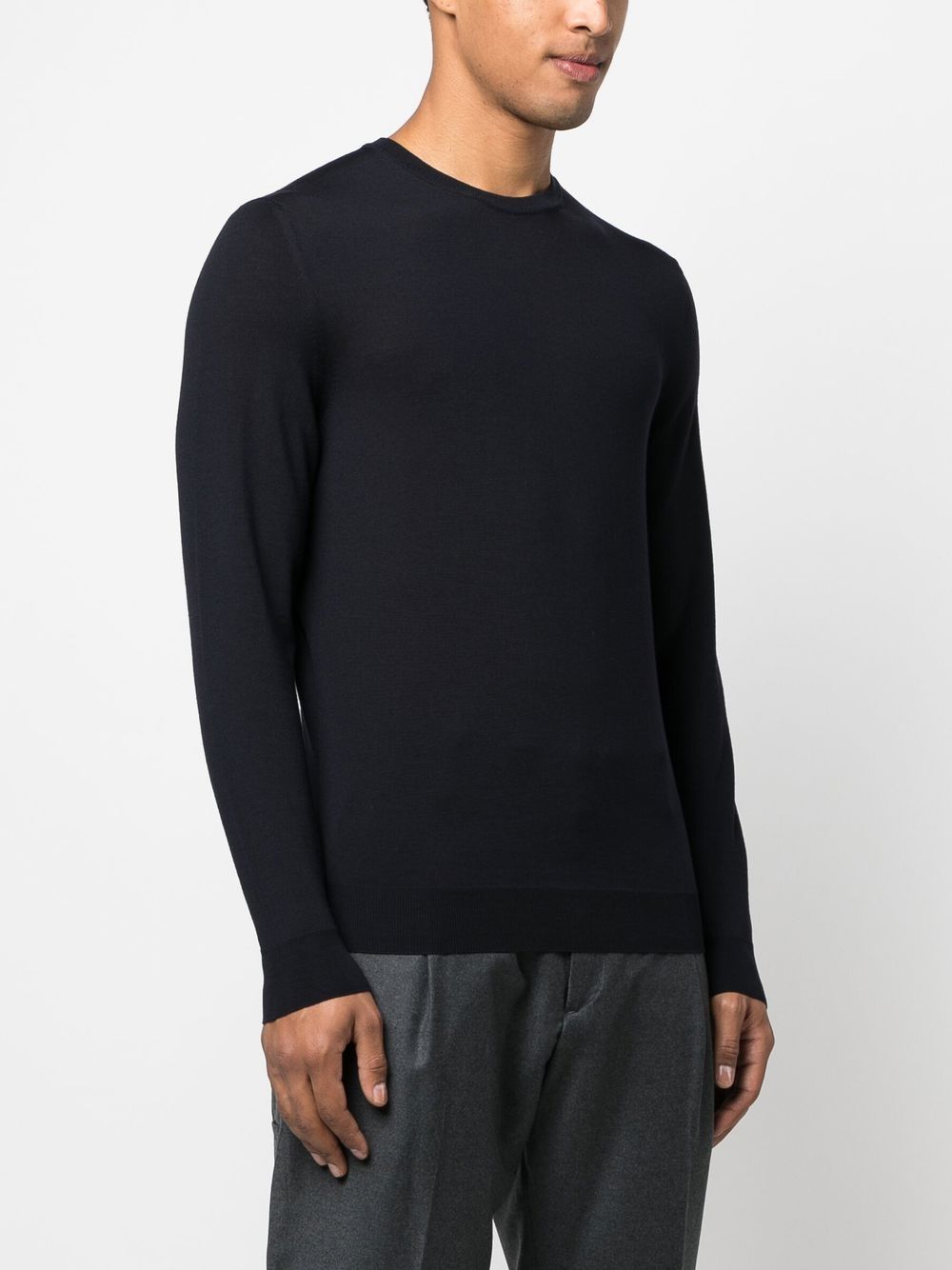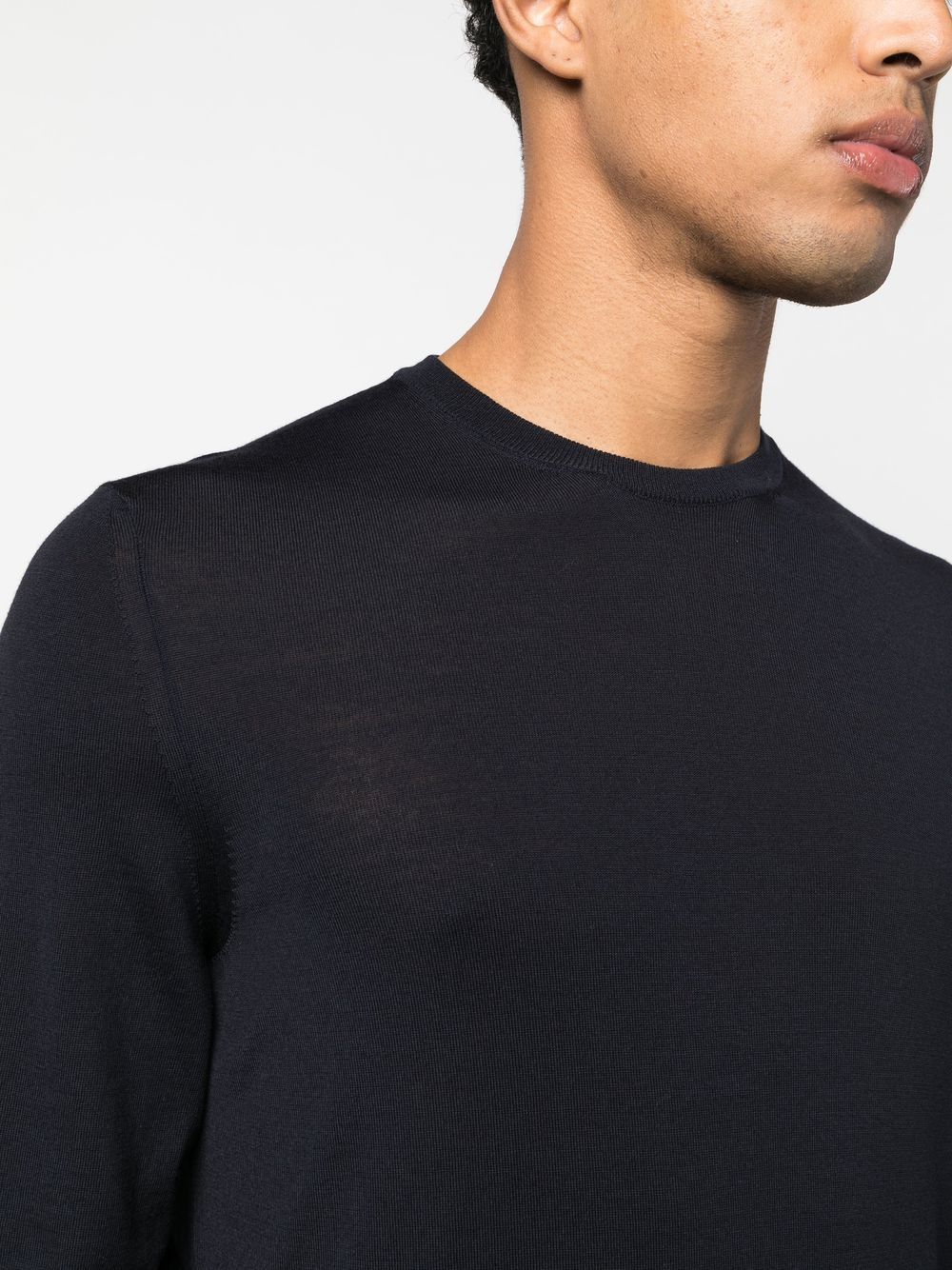 Blue merino wool crew neck sweater from Drumohr with long sleeves, fine knit and ribbed hem and cuffs. Made in Italy.