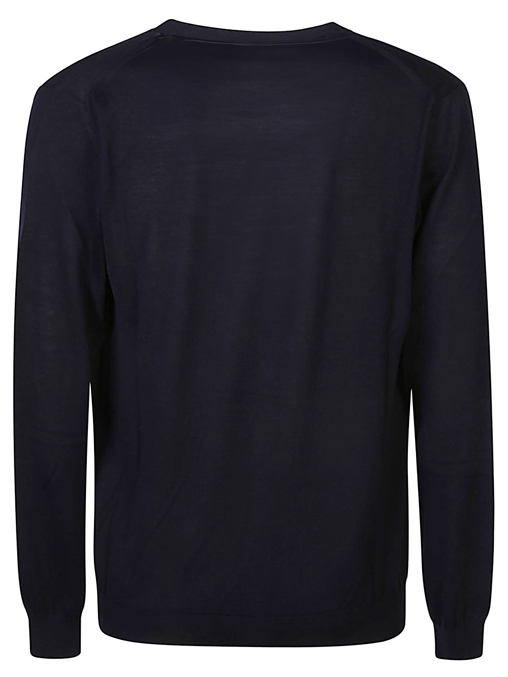 Cardigan con scollo a V, chiuso con bottoni in tono. Bordi rifiniti a costine. Realizzato in filato di lana leggera color blu oltremare. Rifinito con dettaglio FF a rilievo sul fondo.