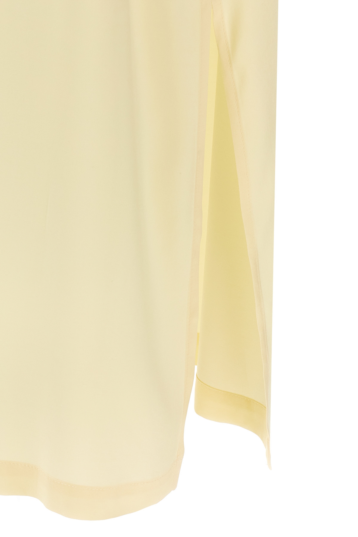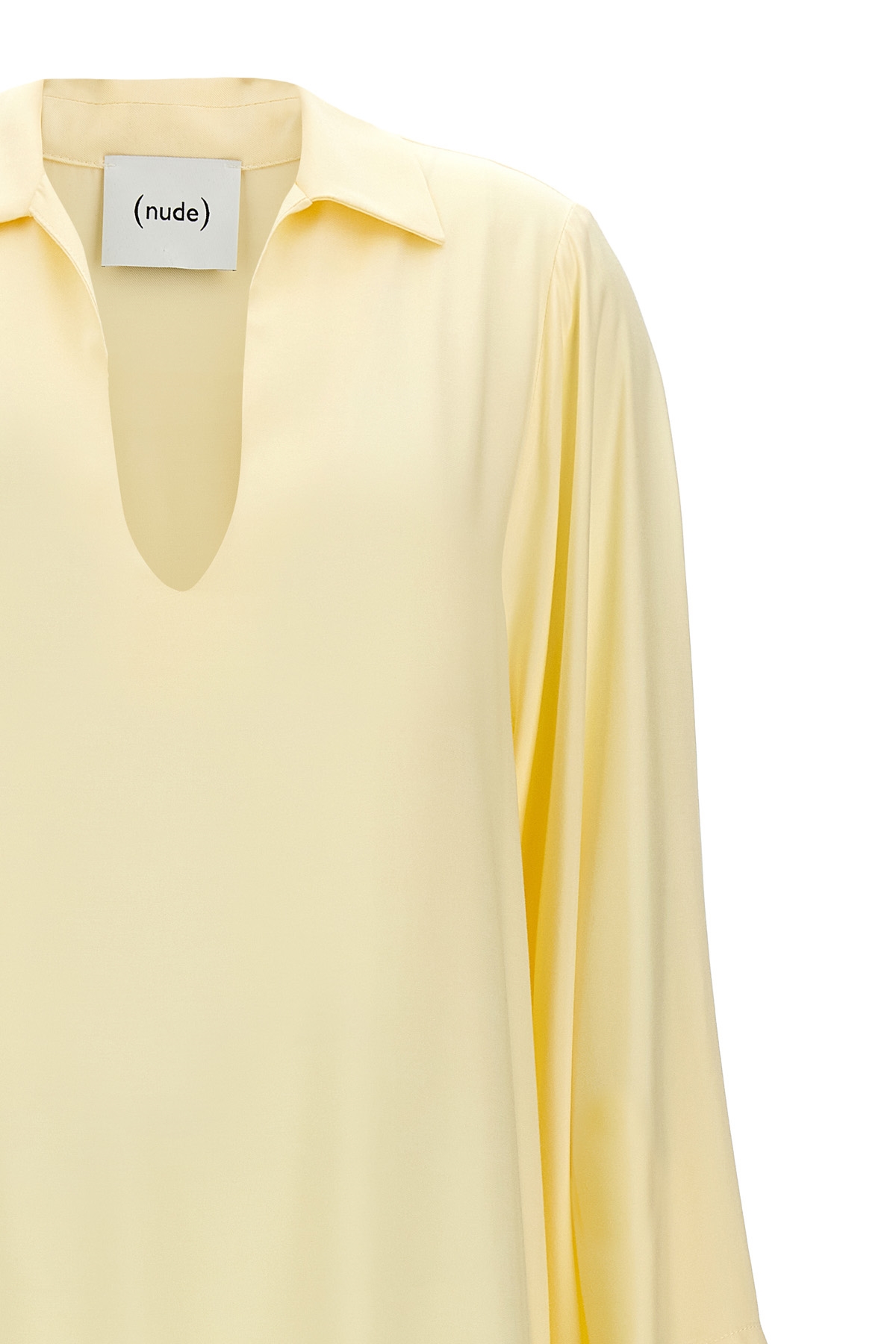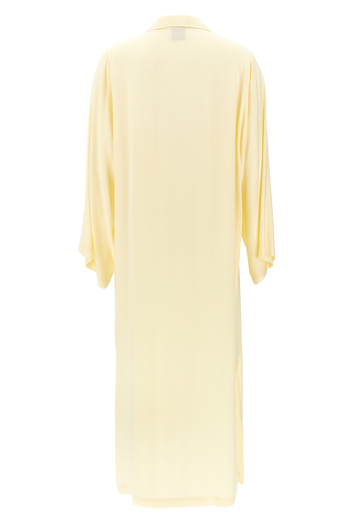 Long viscose dress, V-neck, slightly wide long sleeves, shirt collar, side slits.