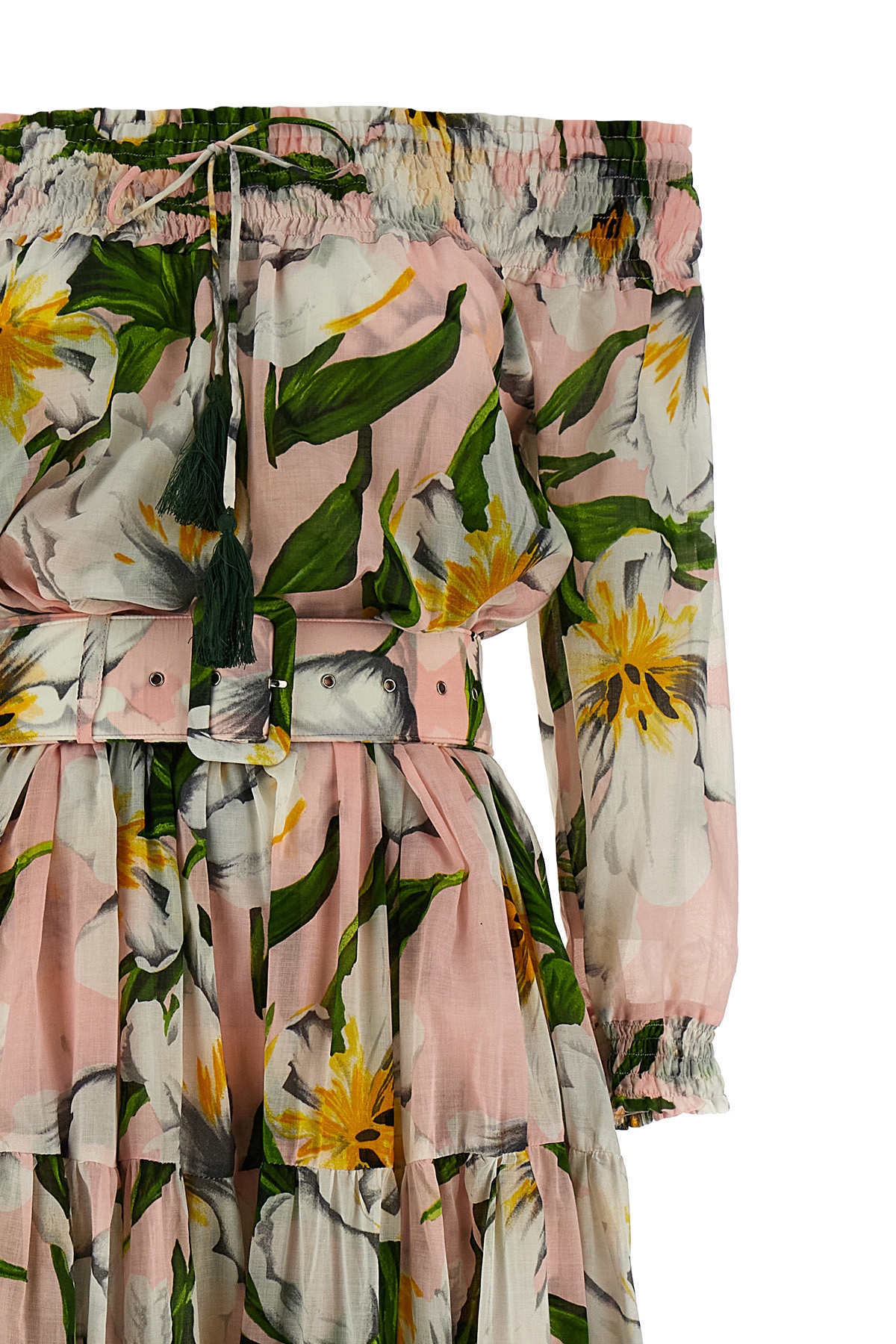 Long 'Eden' dress in all-over print cotton muslin, off-the-shoulder style with smock stitch and drawstring, wide skirt, underskirt, 3/4 sleeves with smock stitch on the sleeve bottom, removable matching belt and sash.