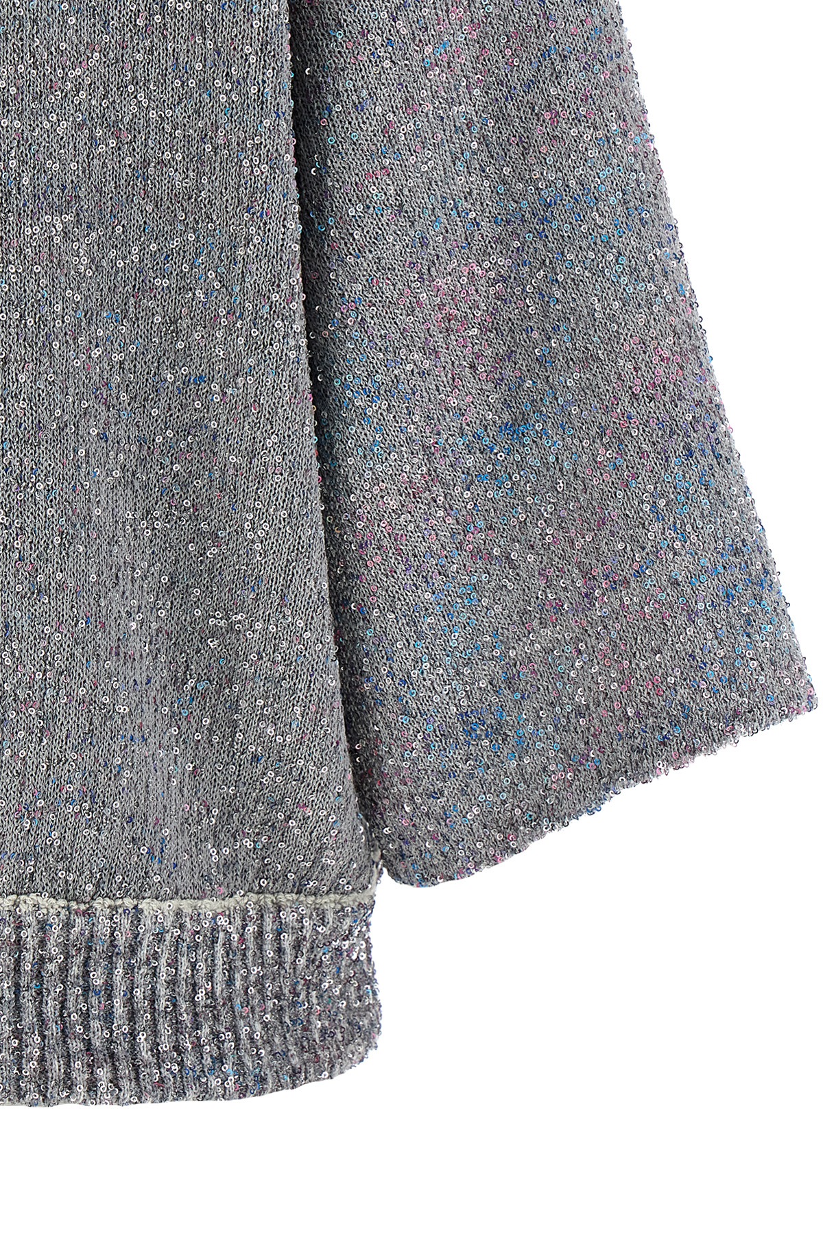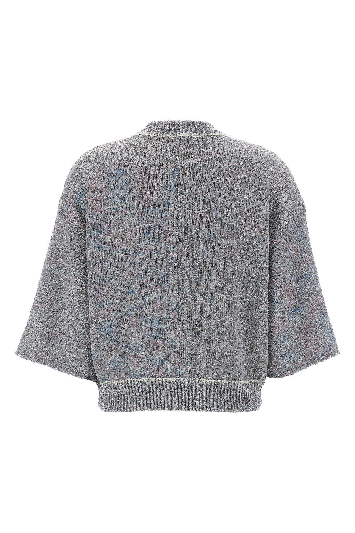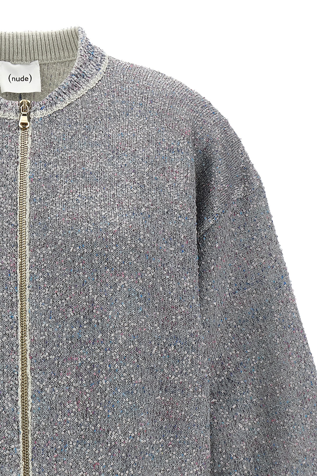 Stretch cotton blend cardigan with all-over sequin applique, crop style, crew neck, front zip closure, short sleeves with dropped shoulders.