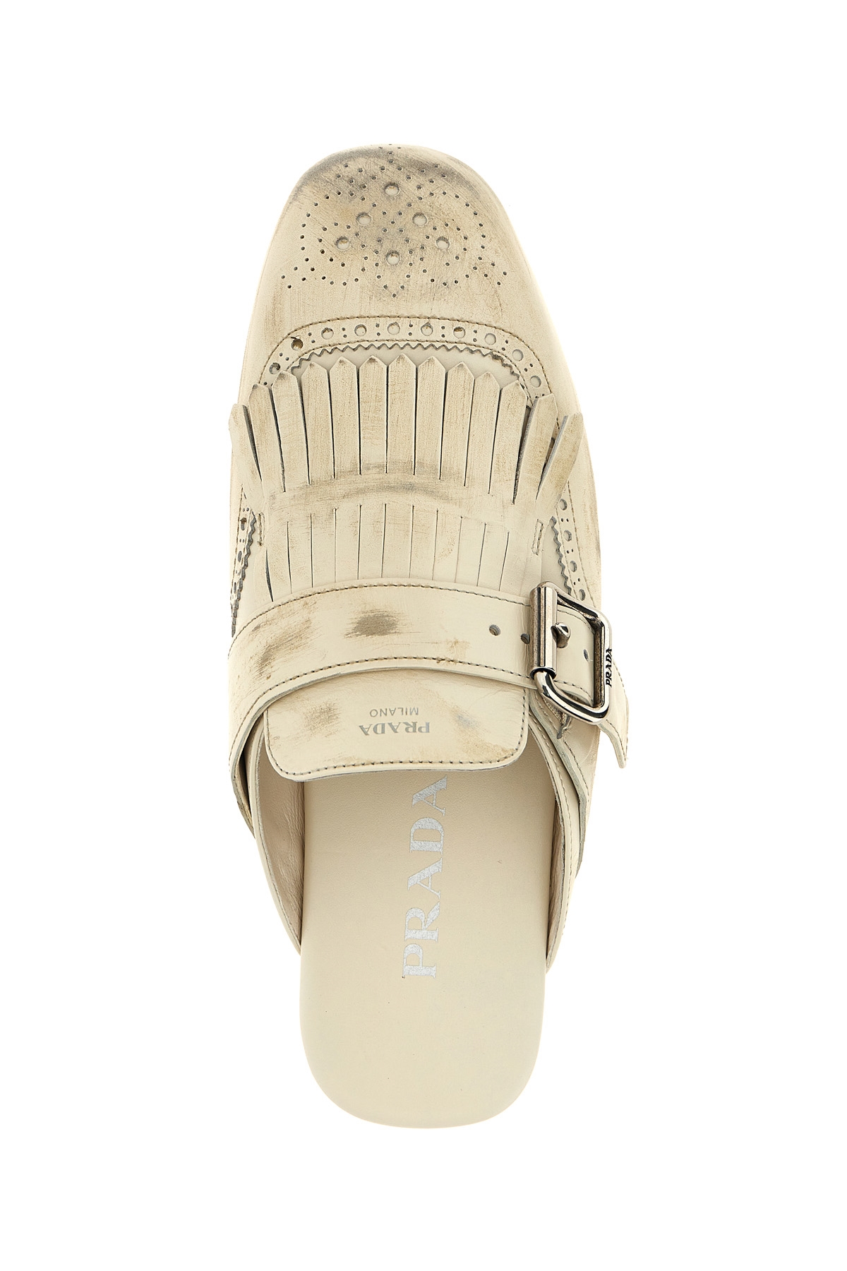'Shuffle' leather sabots with vintage finish, Bogue perforated finish, front fringes and adjustable strap with metal buckle, front embossed logo, rubber sole.