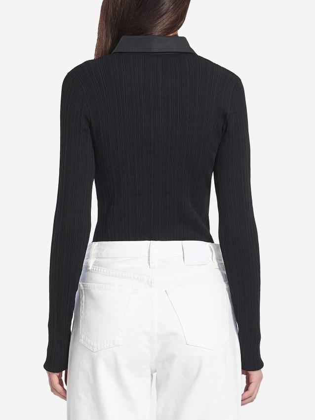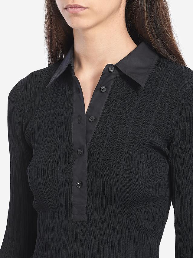 Black ribbed long-sleeve polo. It features a classic collar and a five-button placket in poplin, gathered hems, and side slits at the bottom. Slim