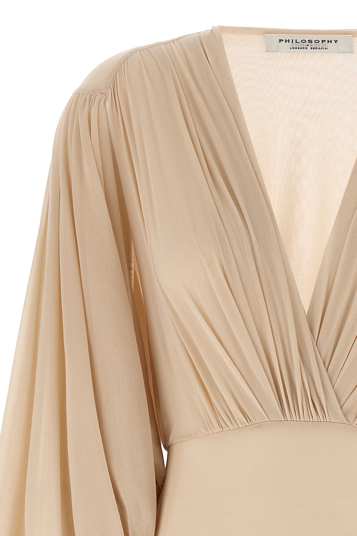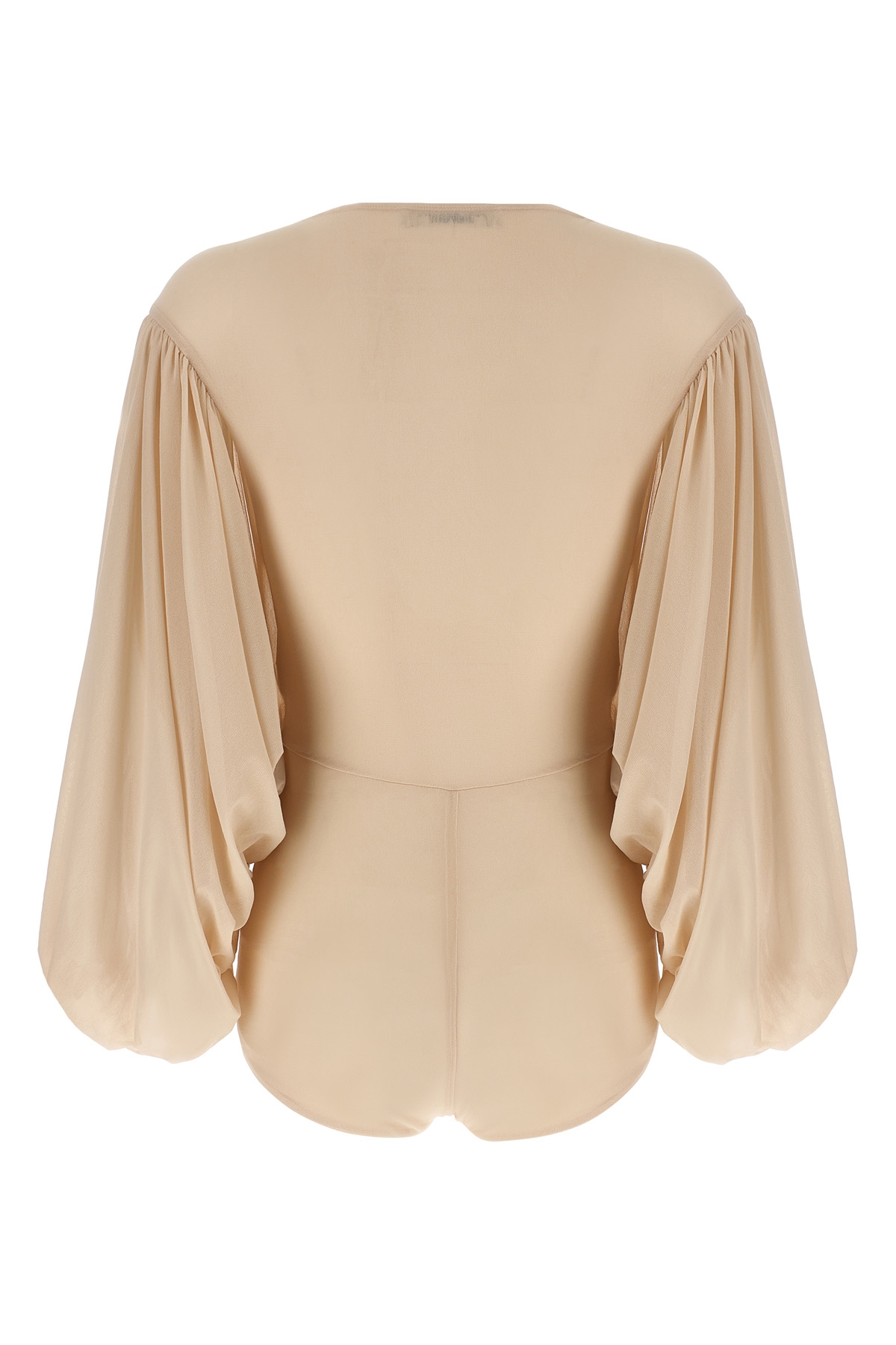 Stretch tulle bodysuit with deep front V-neck, hook closure, wide long sleeves curled with cut-out detail under the armpit.