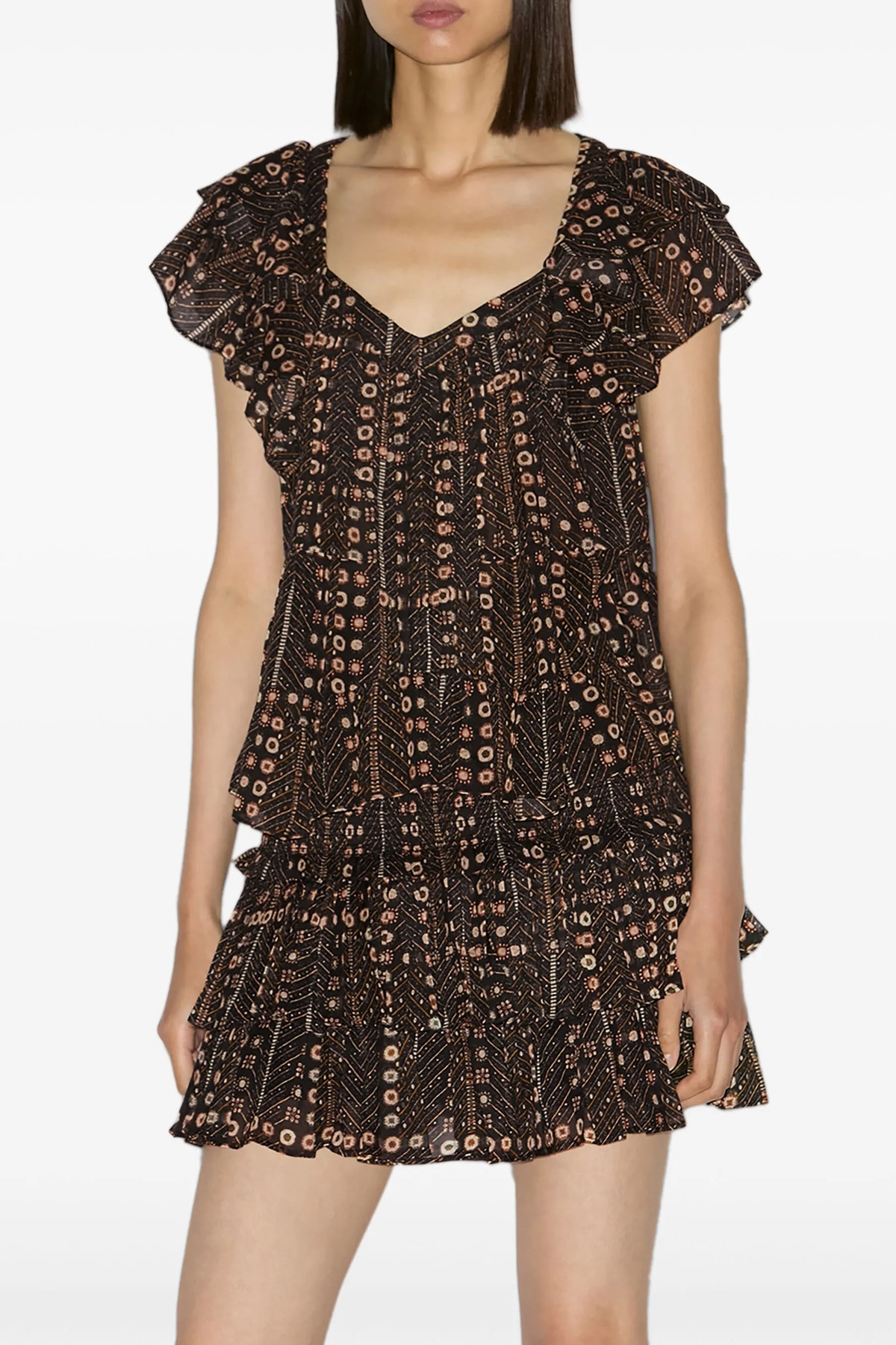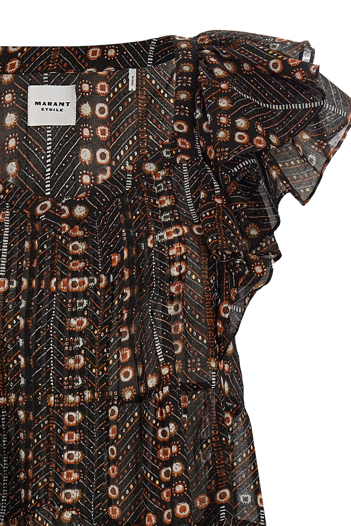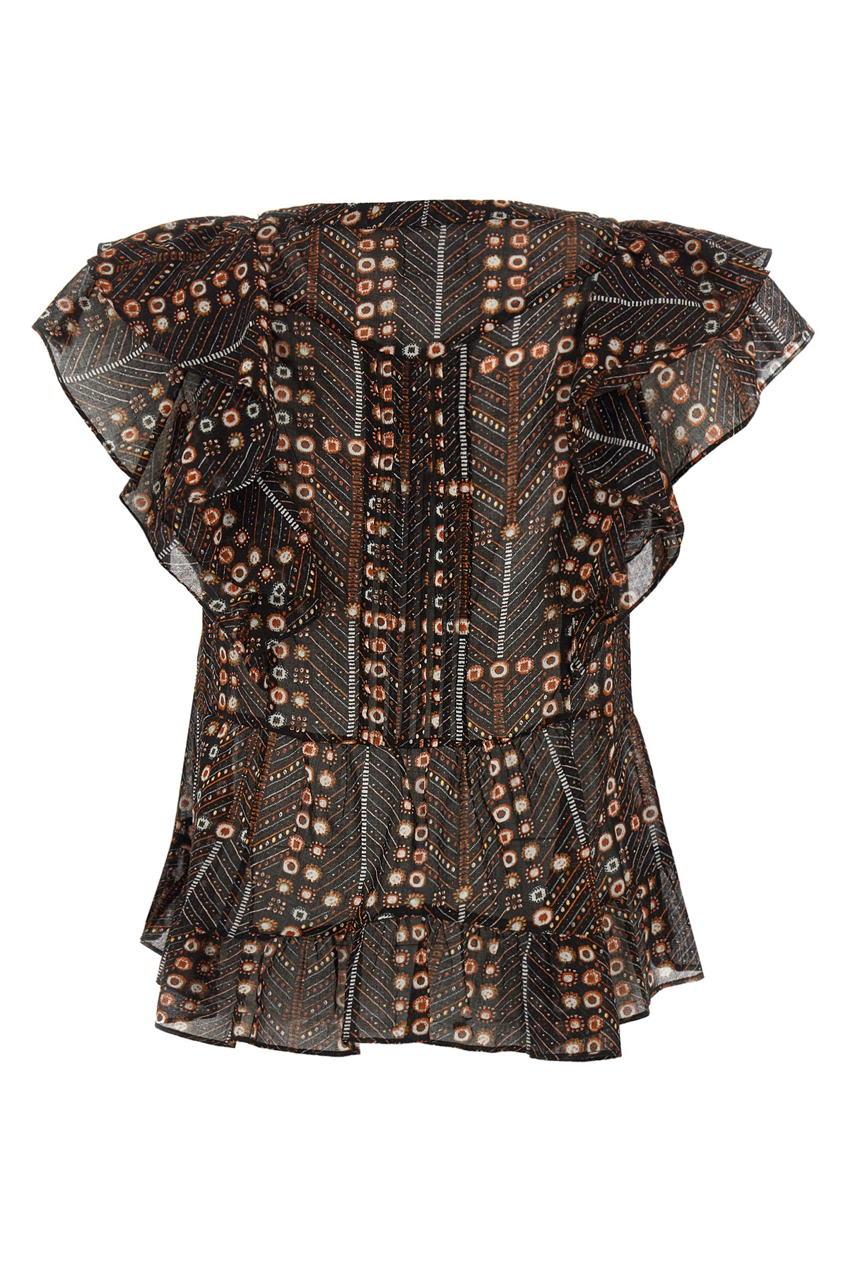 'Madrana' printed cotton voile top with pleated and ruffle details, V-neck, double short sleeves with ruffles.