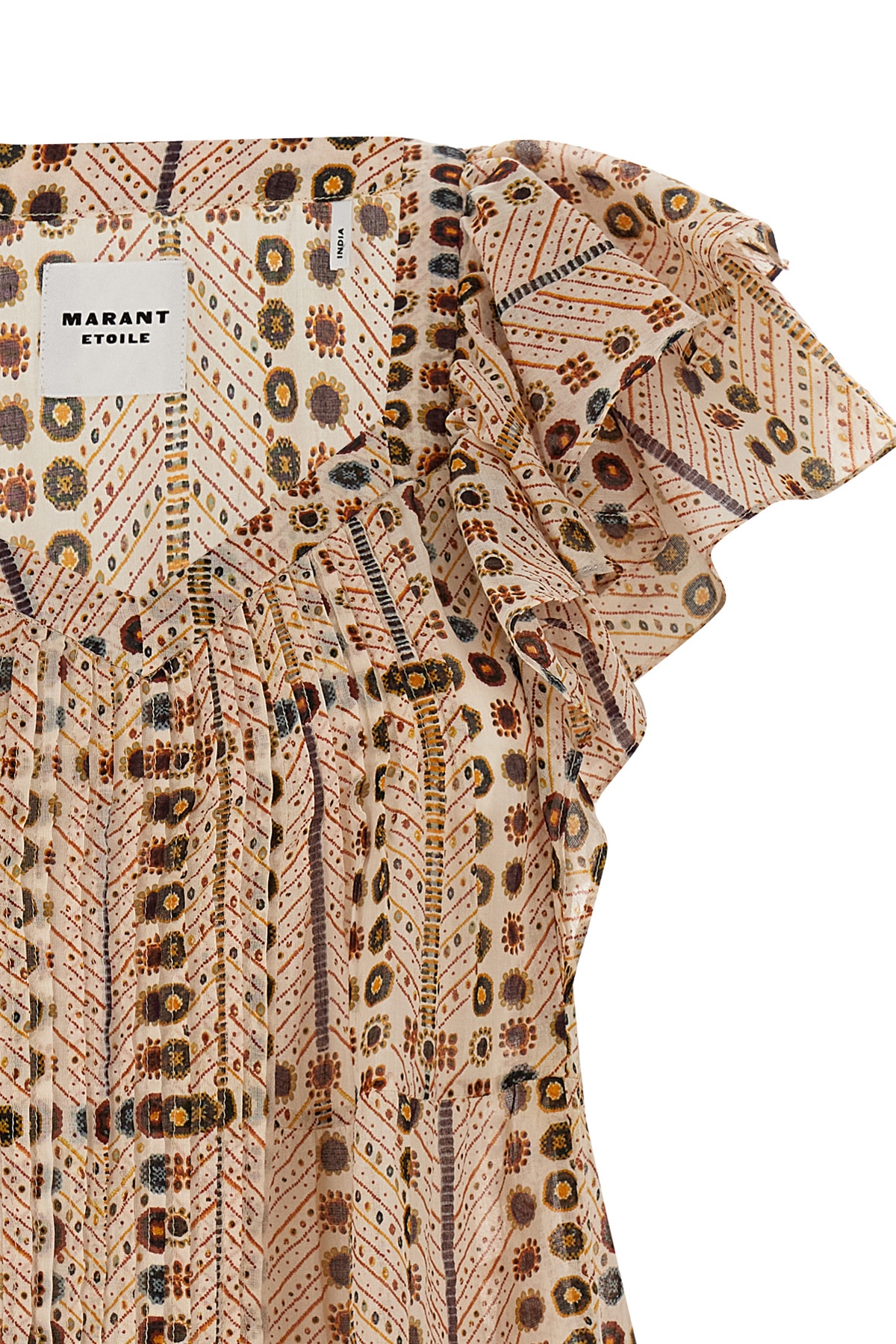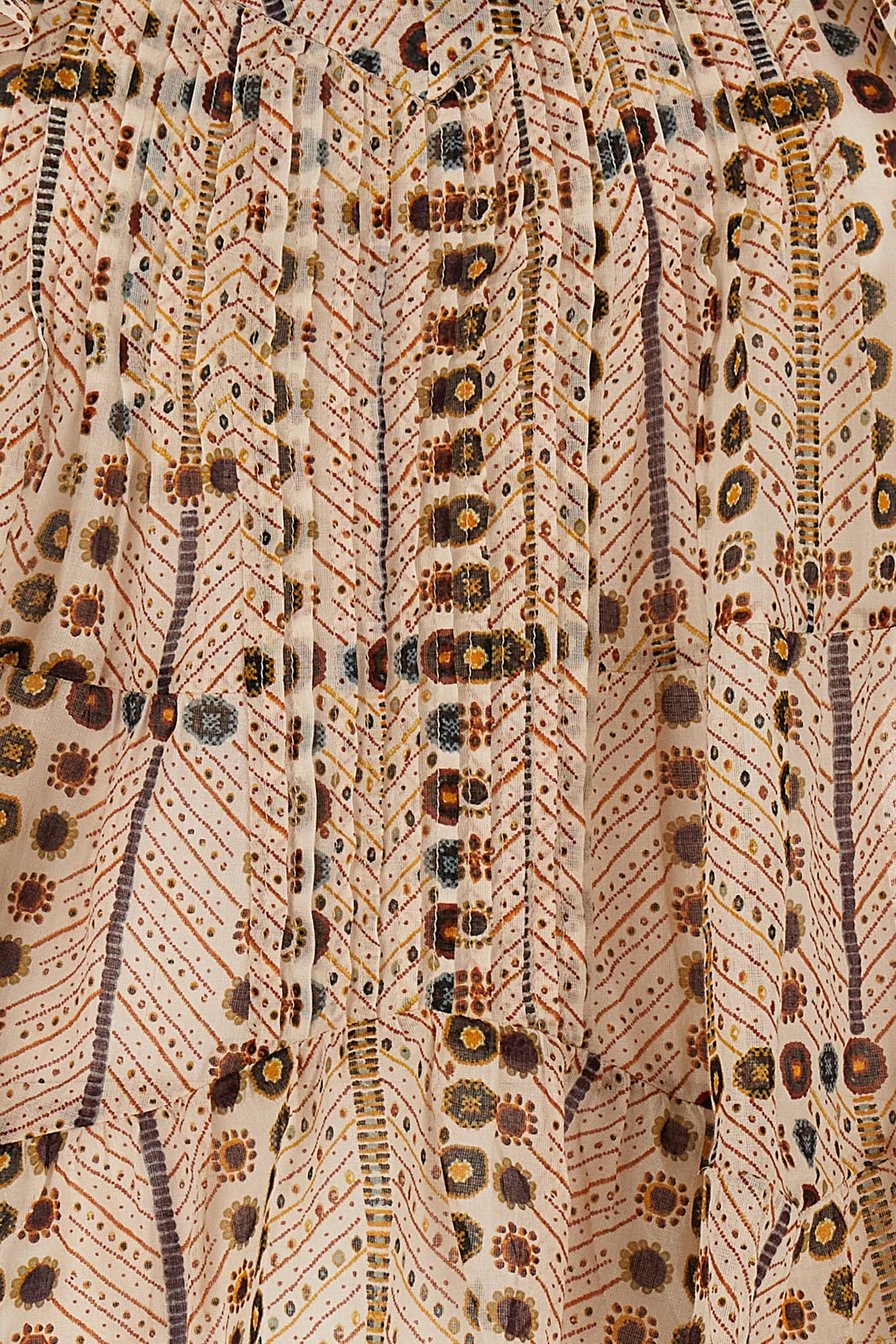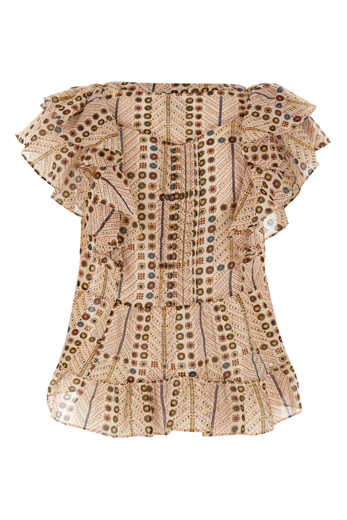 'Madrana' printed cotton voile top with pleated and ruffle details, V-neck, double short sleeves with ruffles.