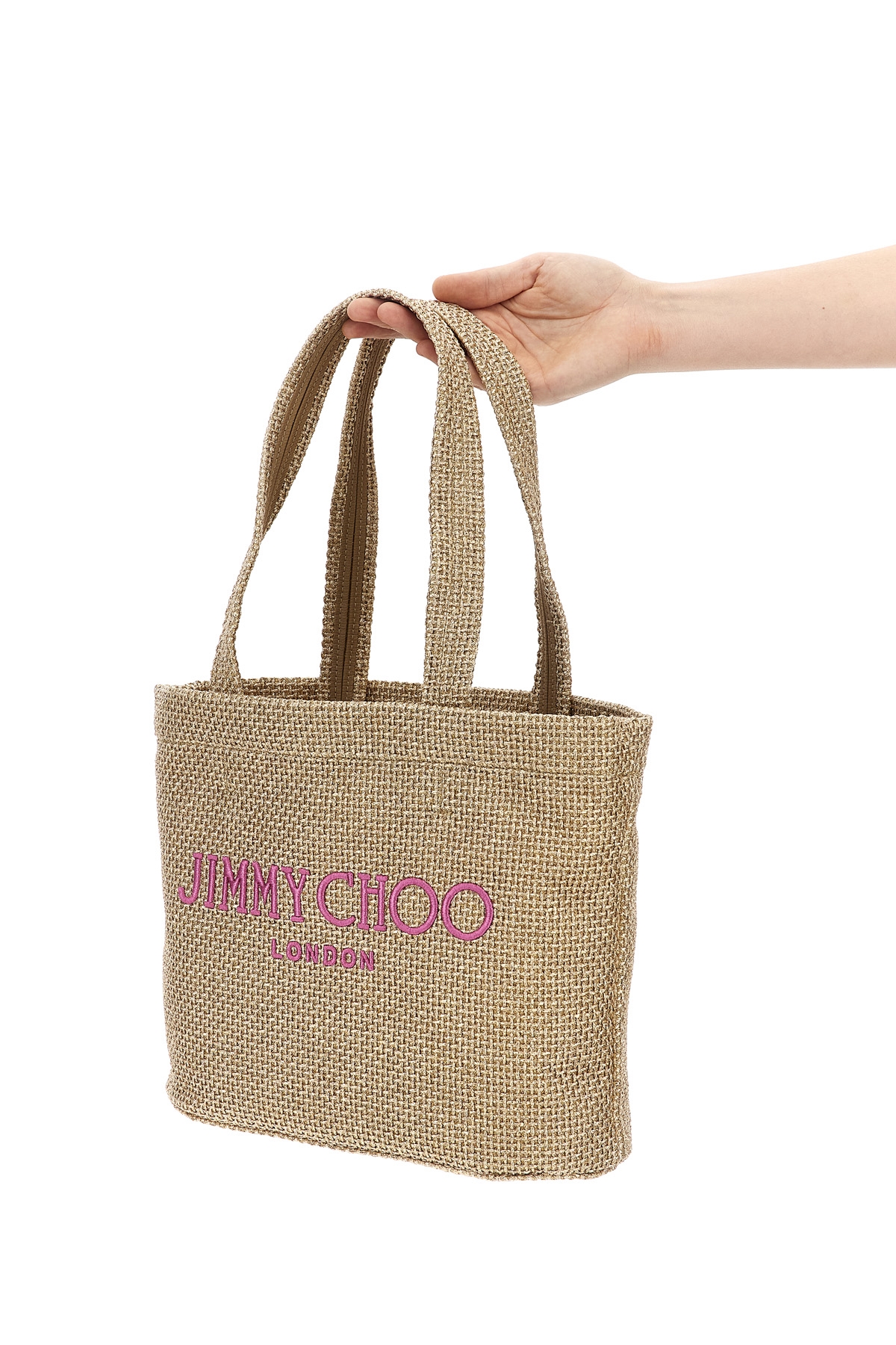 'Beach Tote East-West' shopping bag in woven metallic raffia with front logo embroidery, double fixed handle.