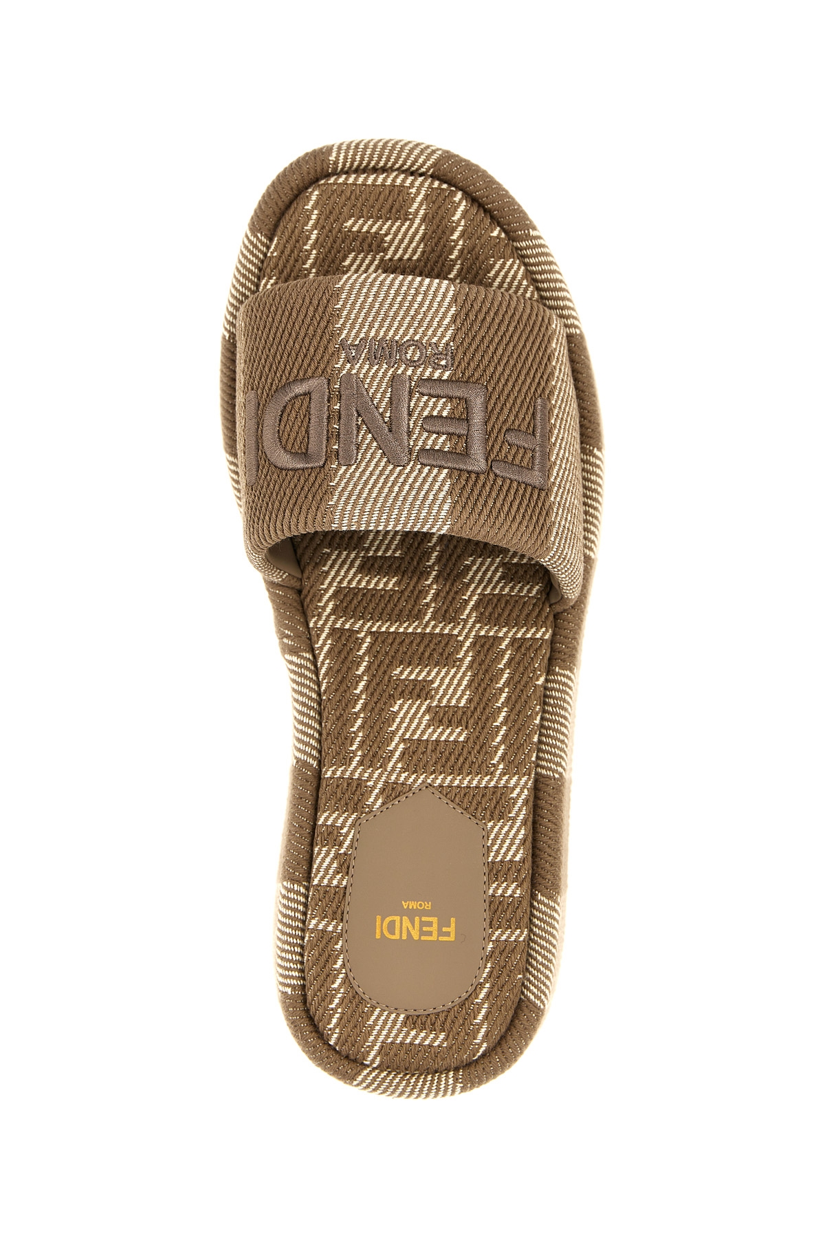 Fendi Sunshine' denim-effect jacquard slides with Pecin stripes, front logo embroidery, jacquard denim insole with iconic tone-on-tone FF pattern, and platform sole.