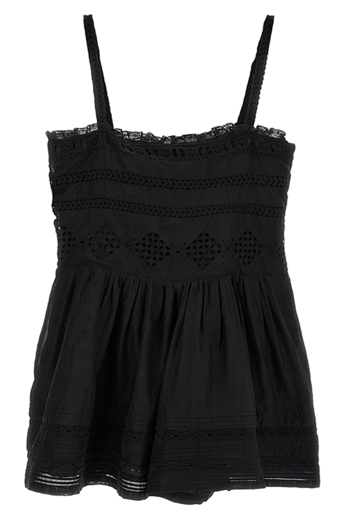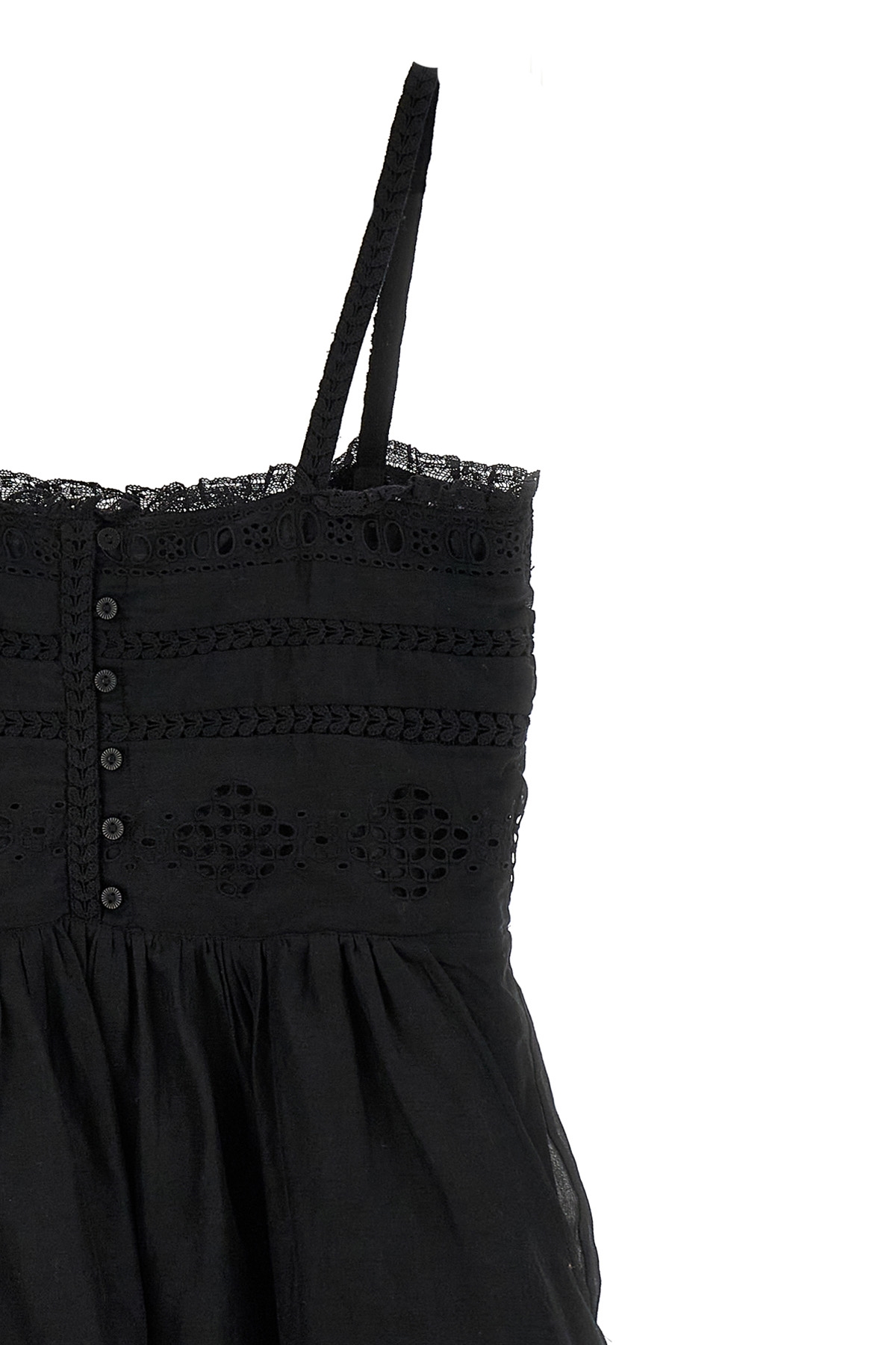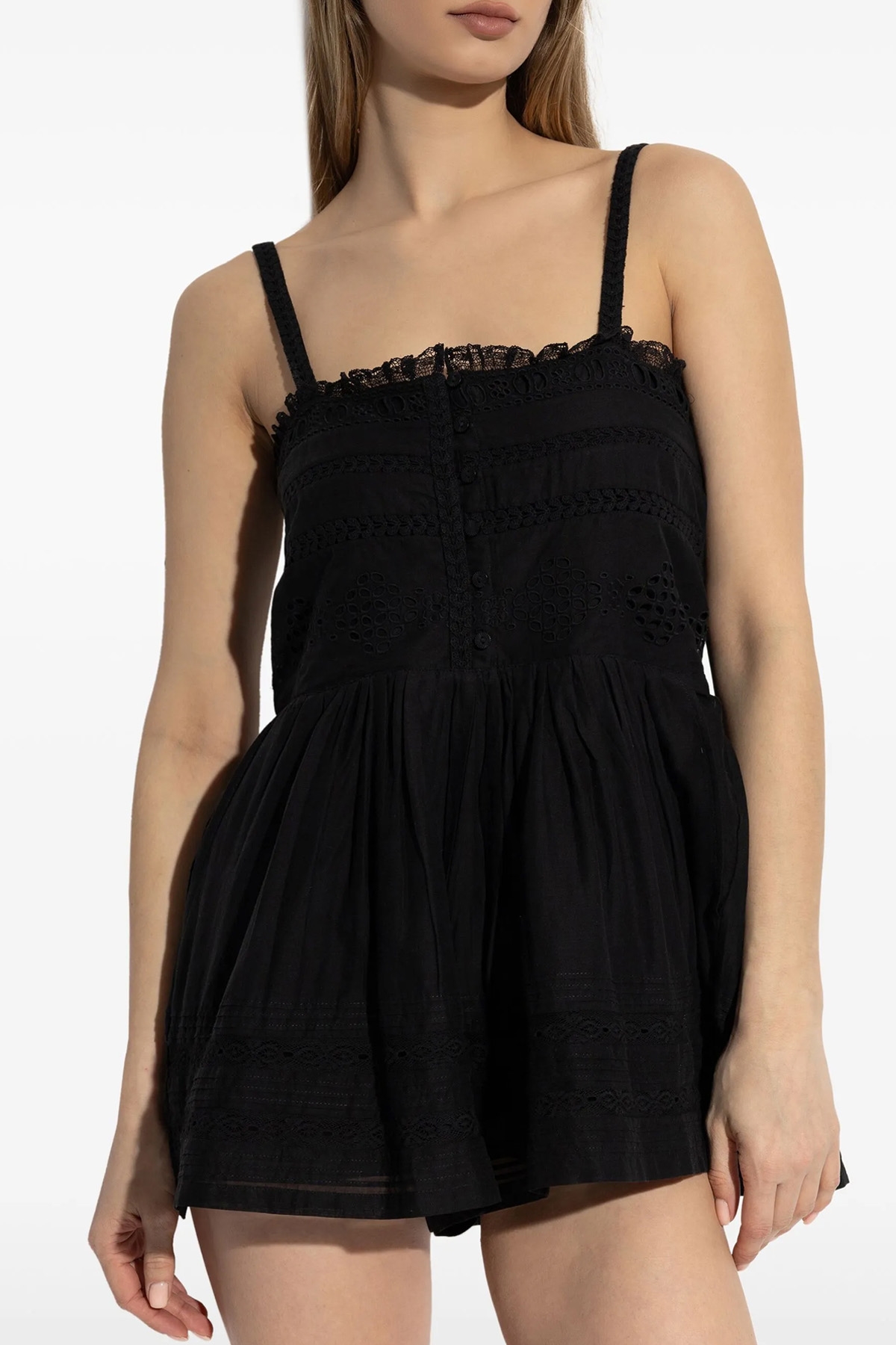 'Dylan' jumpsuit in perforated cotton voile, perforated sangallo lace details, pleats and curls, sleeveless with thin lace straps, front button closure, pockets, square neckline.