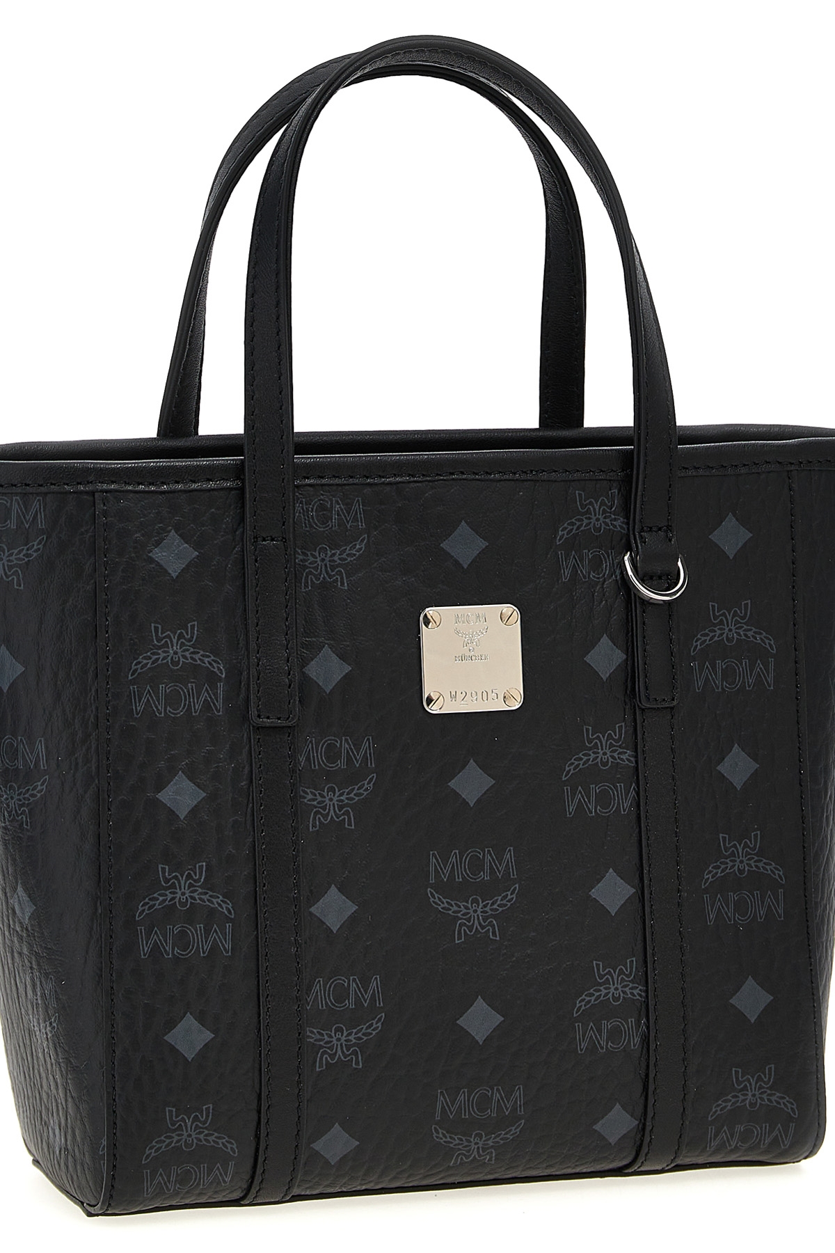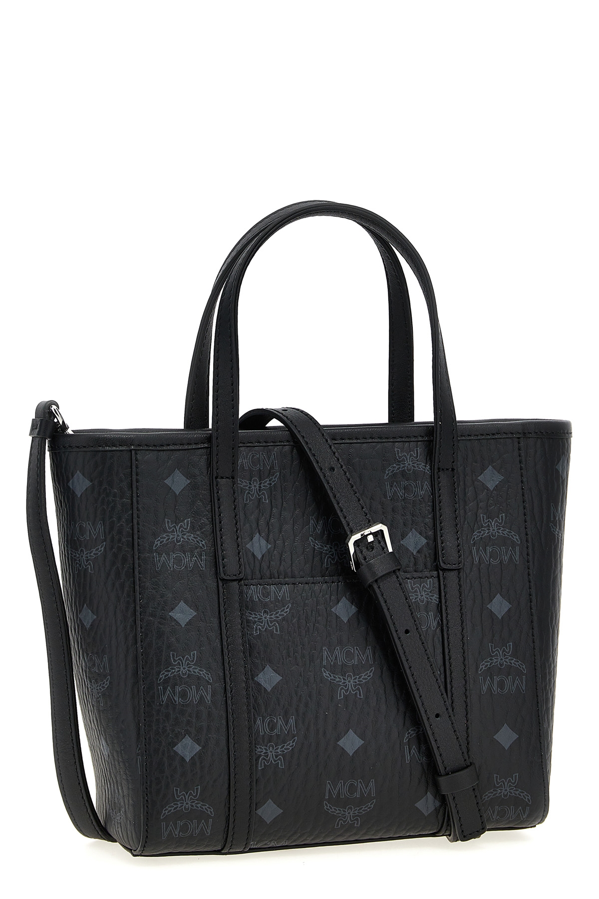 'Toni' mini shopping bag in Visetos canvas and nappa leather with all-over logo print, front metal logo patch, double handle, zip closure, metal details, outer back pocket, adjustable and removable shoulder strap.