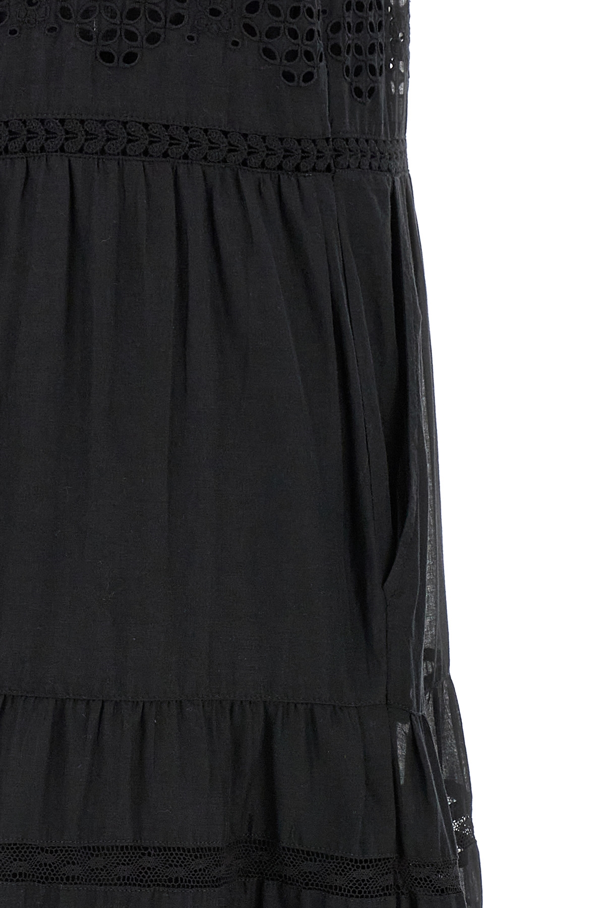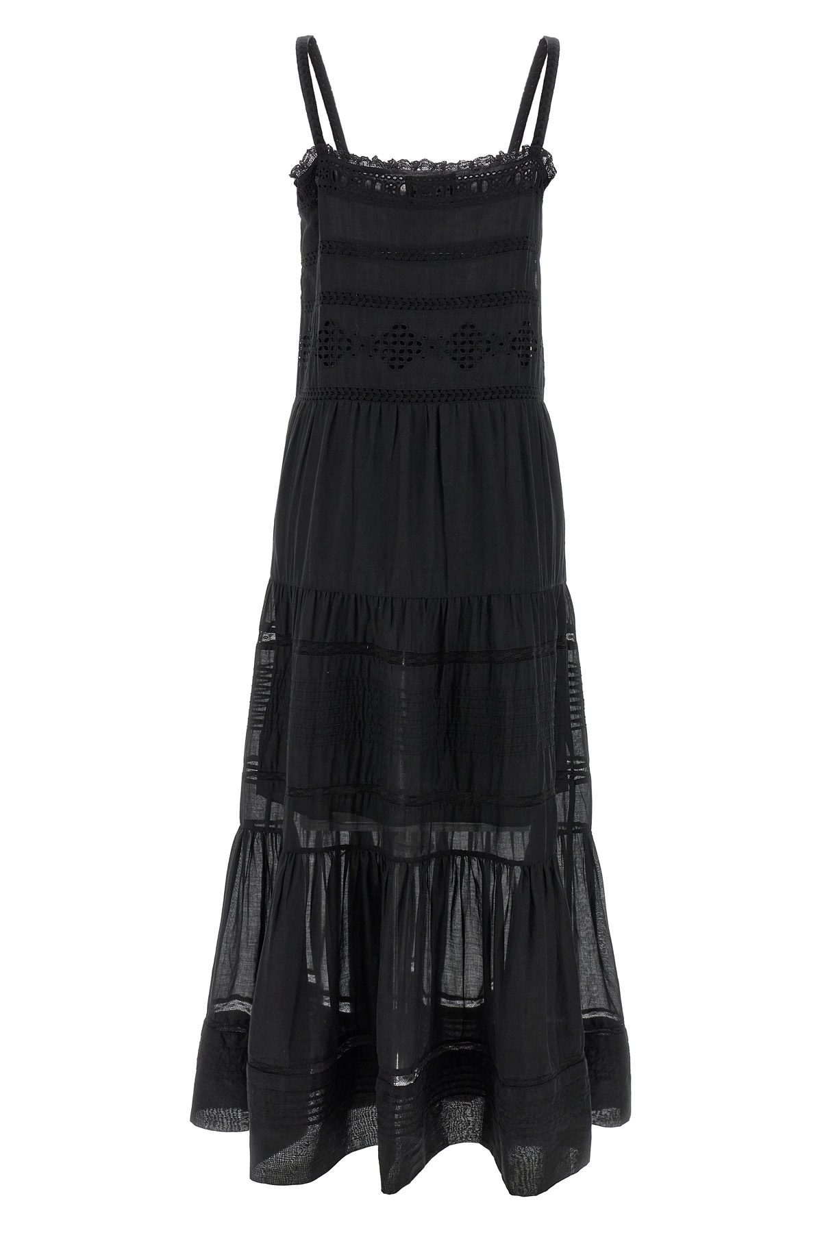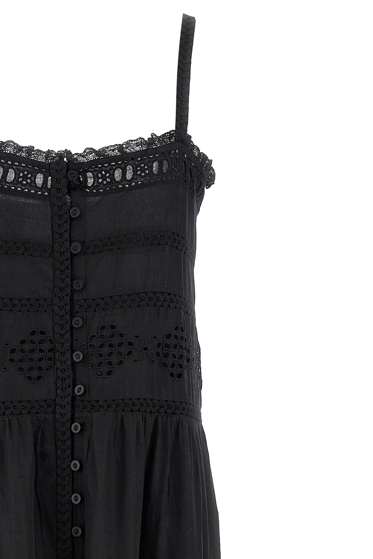 Long 'Divine' dress in perforated cotton voile, perforated sangallo lace details, pleats and curls, flared, sleeveless with thin lace straps, front button closure, pockets, square neckline.