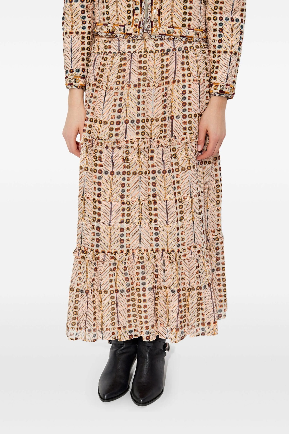 'Diya' long skirt in printed cotton voile with pleated and ruffle details, flared model, elastic waistband, underskirt.