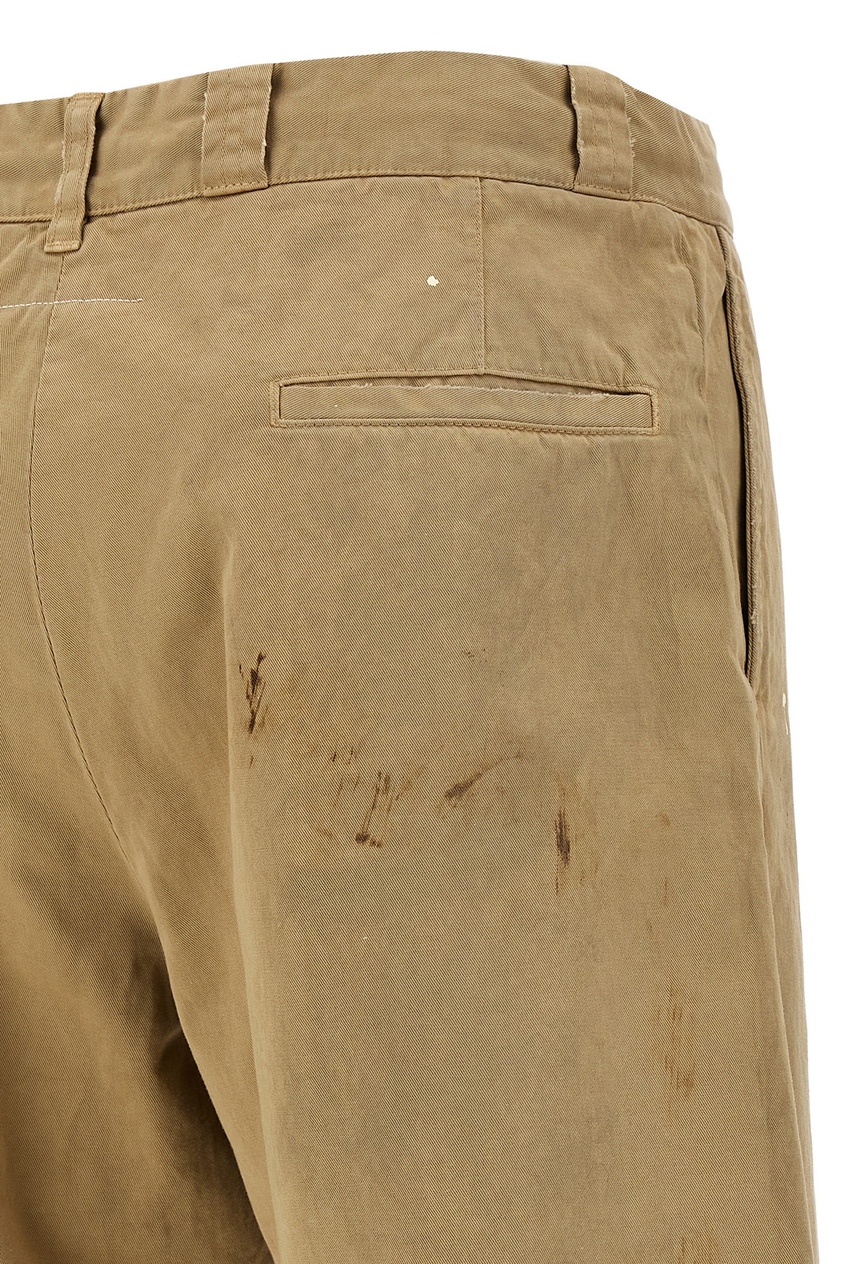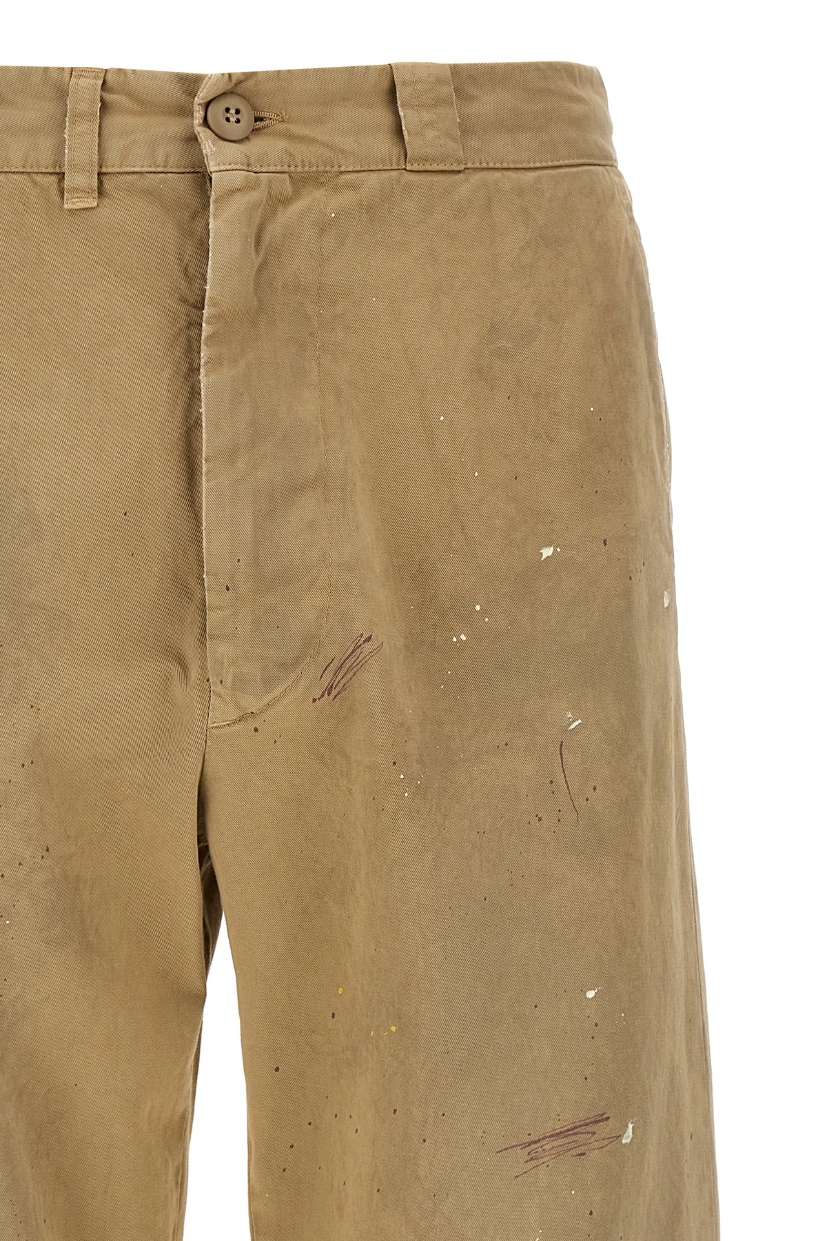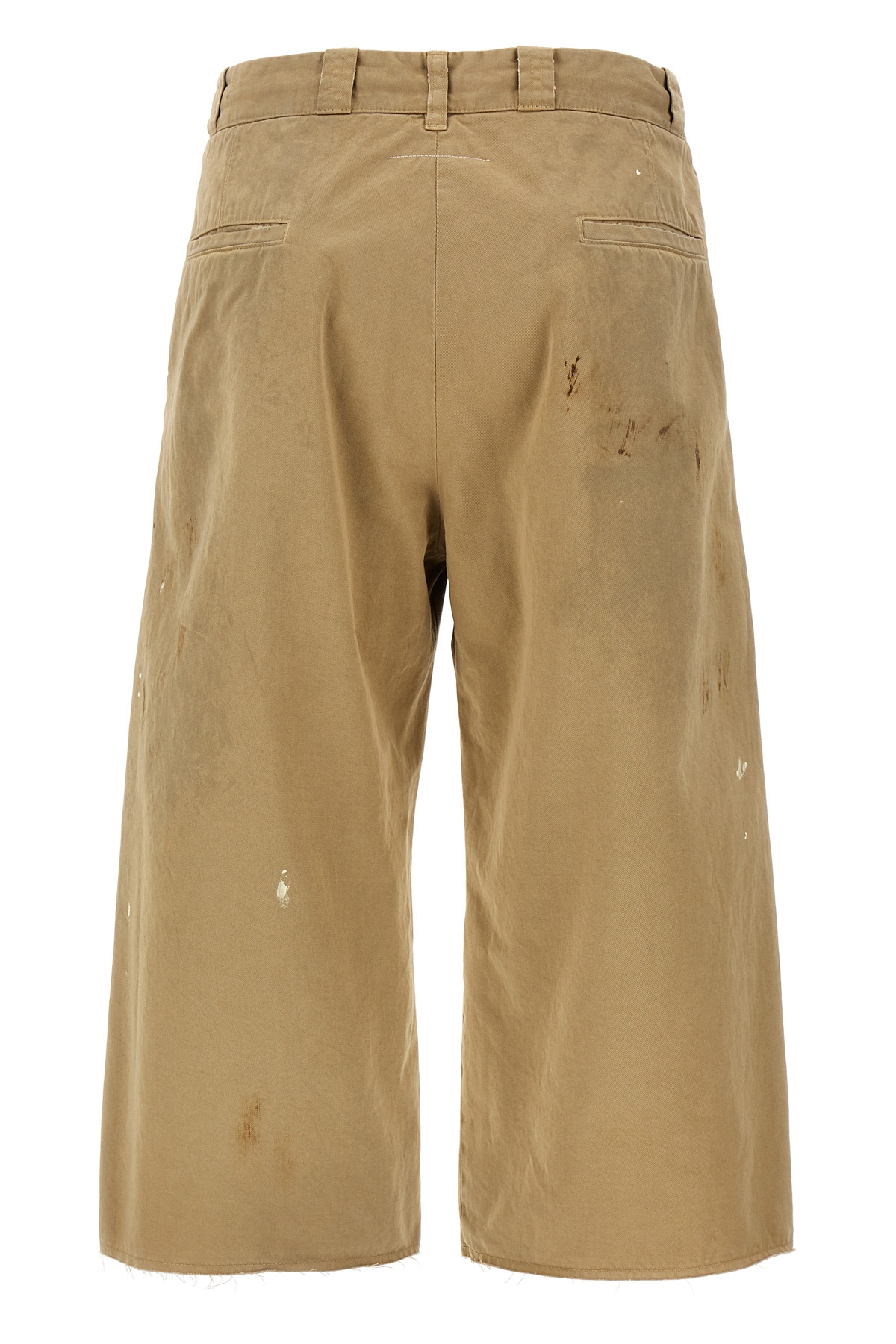 Used-effect cotton bermuda shorts with patent leather stains, front zip and button closure, pockets, raw cut hem leg bottoms, 'White stitch line' at the back.