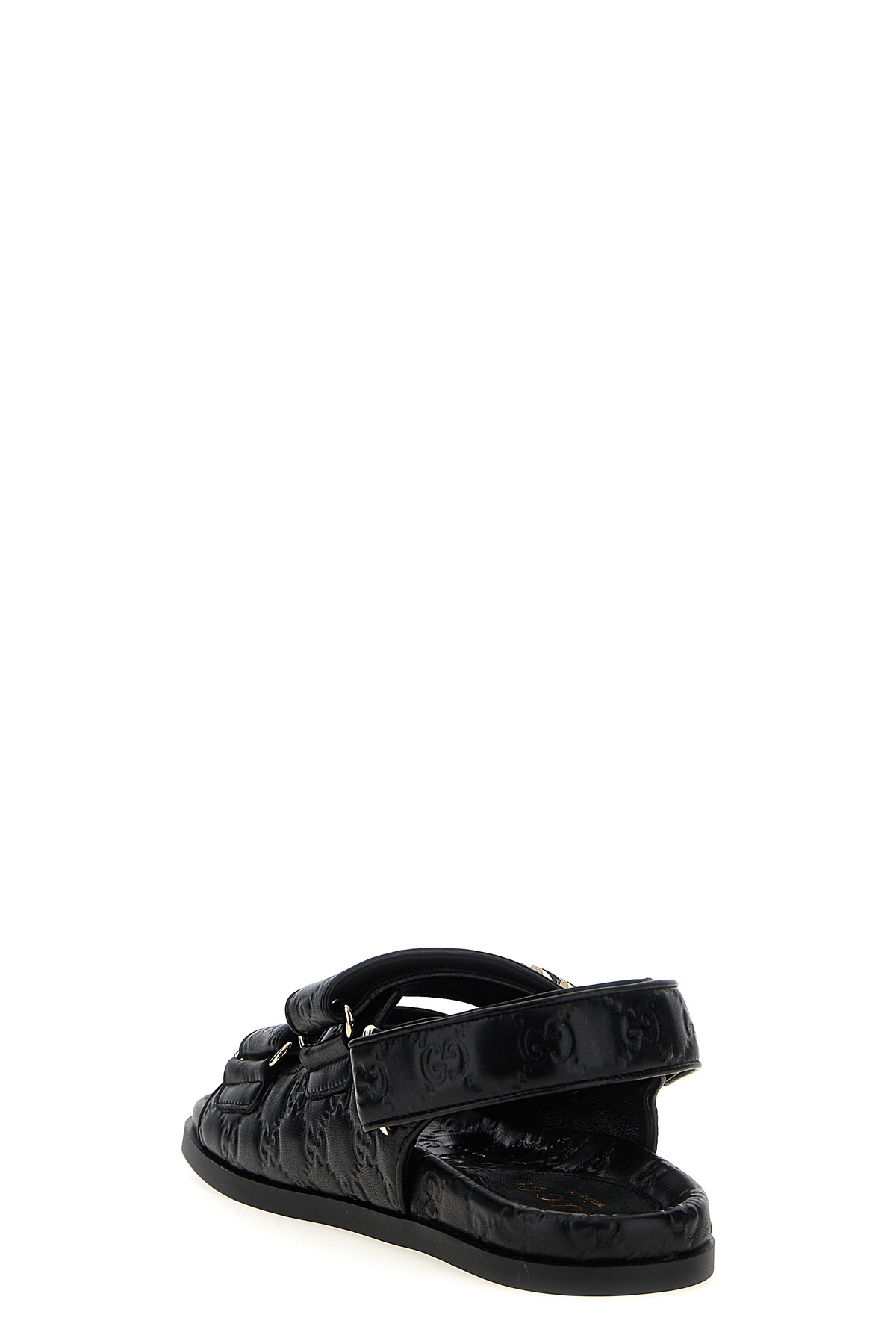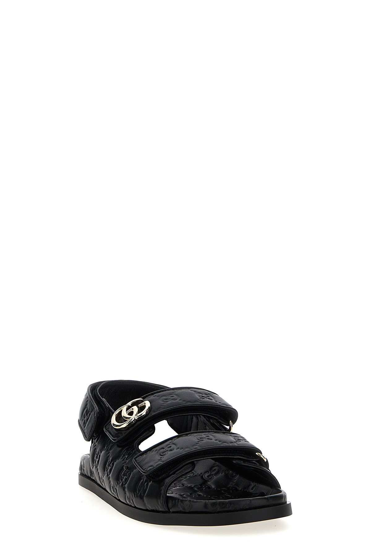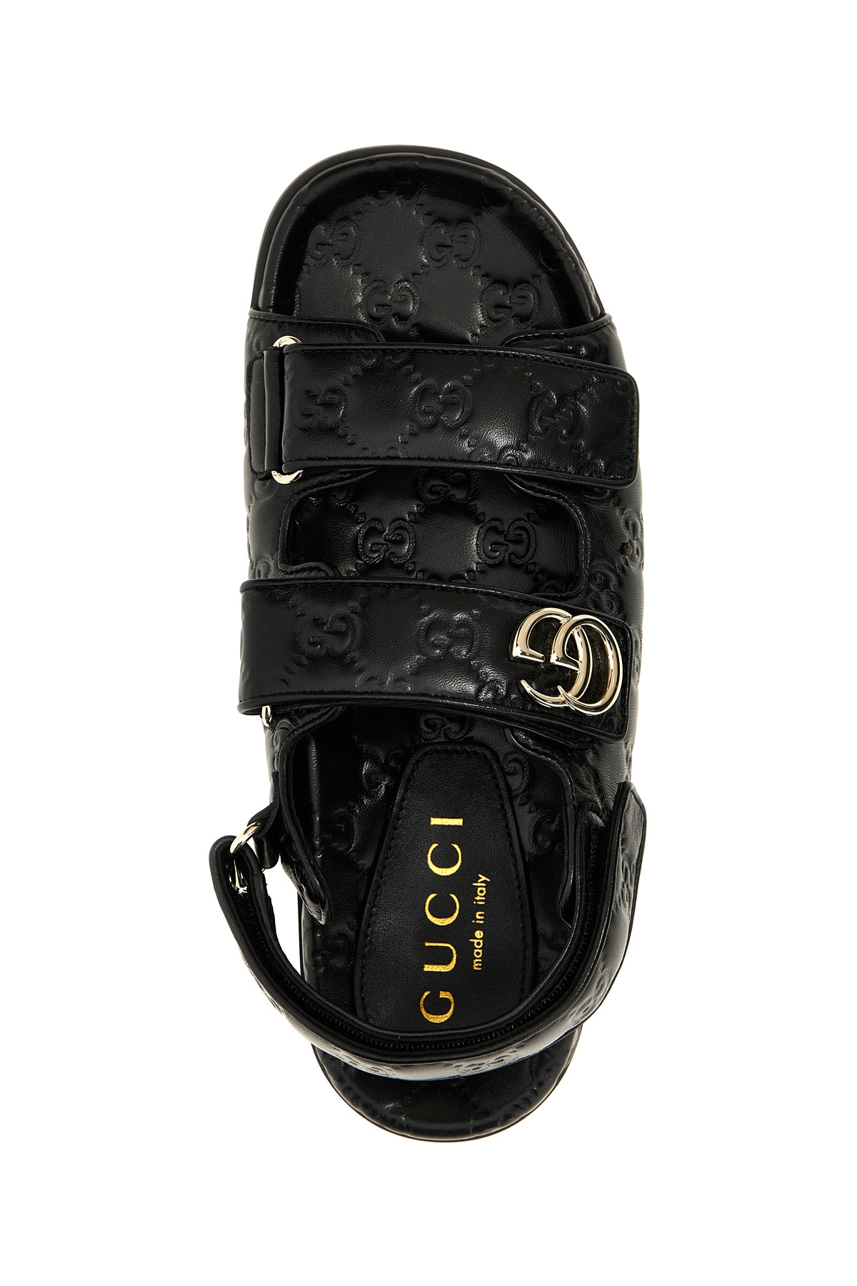Black leather sandals with embossed GG pattern, metal GG logo applied on the front, adjustable straps with Velcro closure.