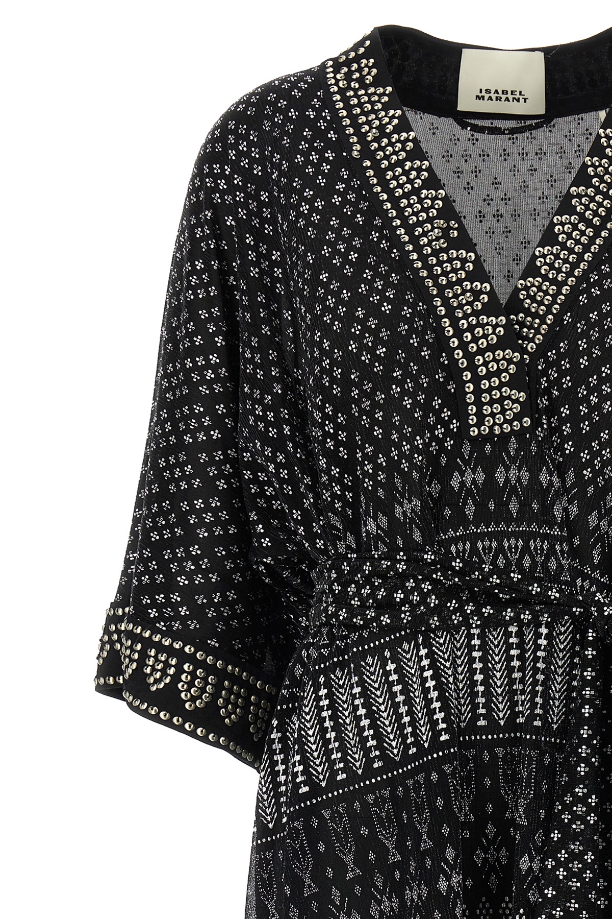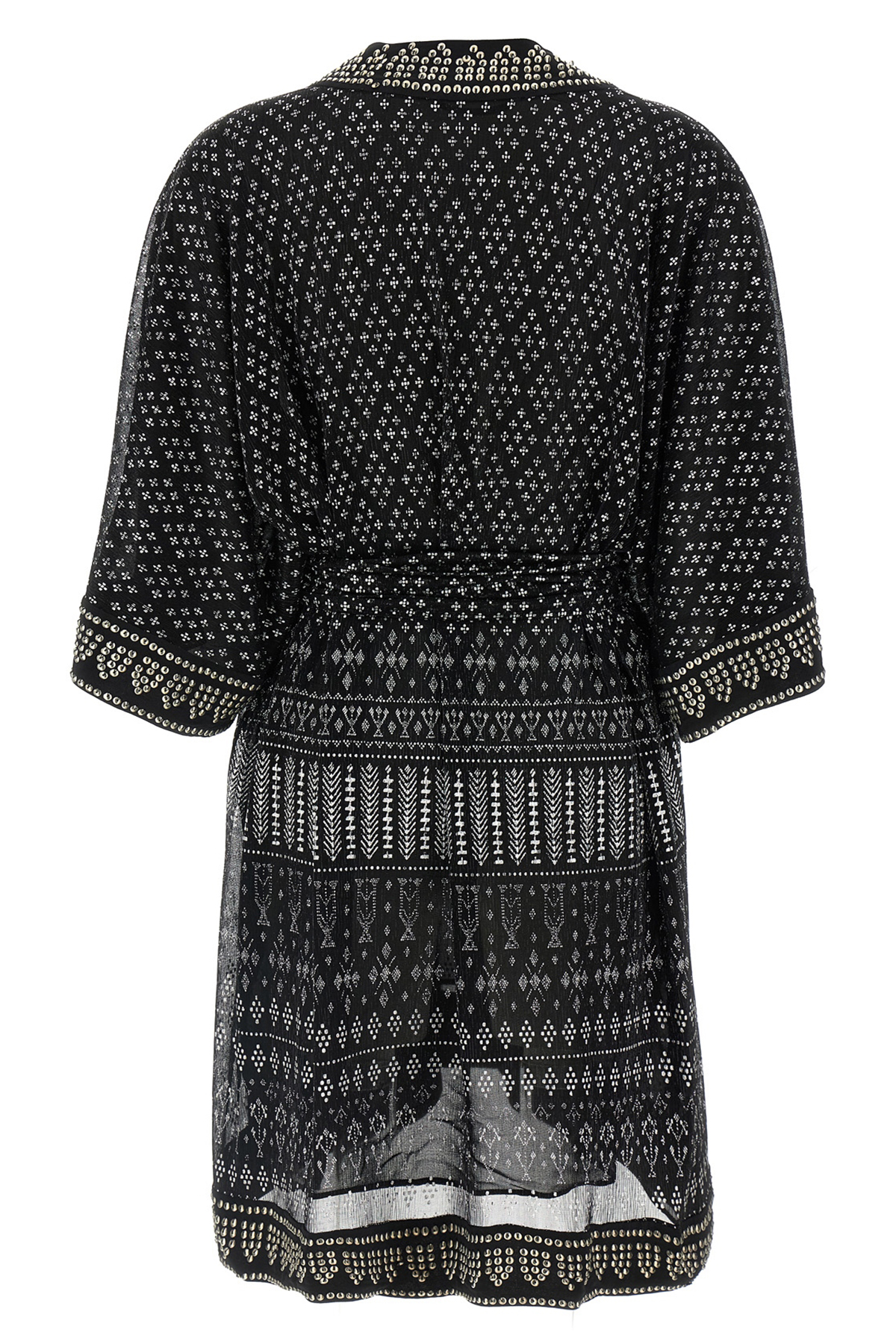 'Nawel' dress in semi-transparent fabric with silver print, V-neck with hook, 3/4 sleeves, metal embroidery detail, slightly loose fit with knotted belt at the waist.