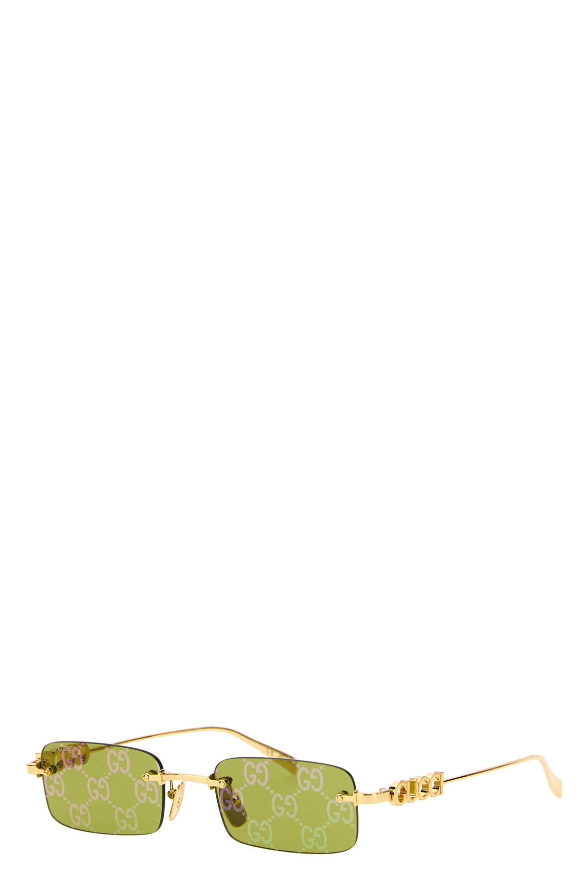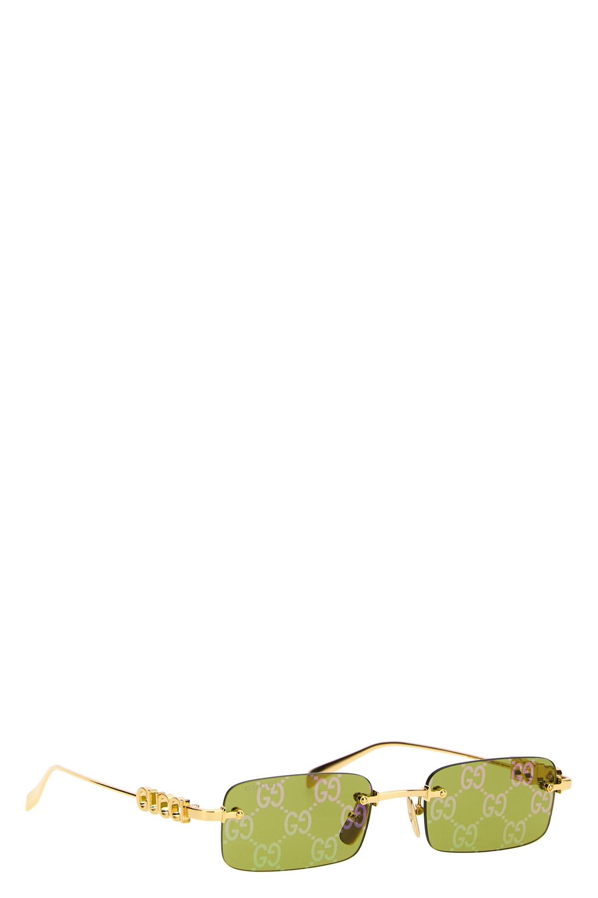 Metal sunglasses with cut-out logo on the temples, frameless silhouette and Guccissima mirrored lenses.