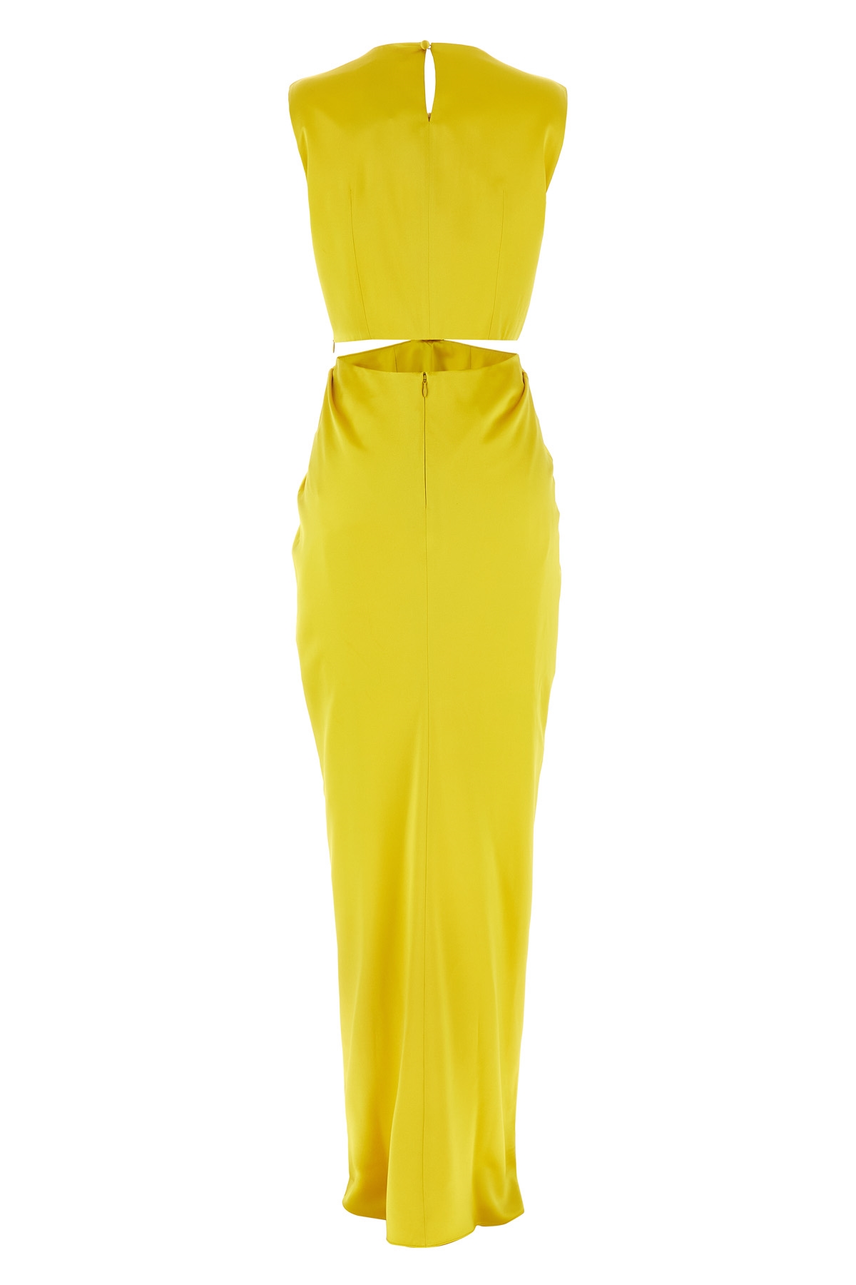 Panaro' sleeveless dress in silk satin with hourglass style, front draping with metal detail, cut-out on the sides, back zip and hook closure.