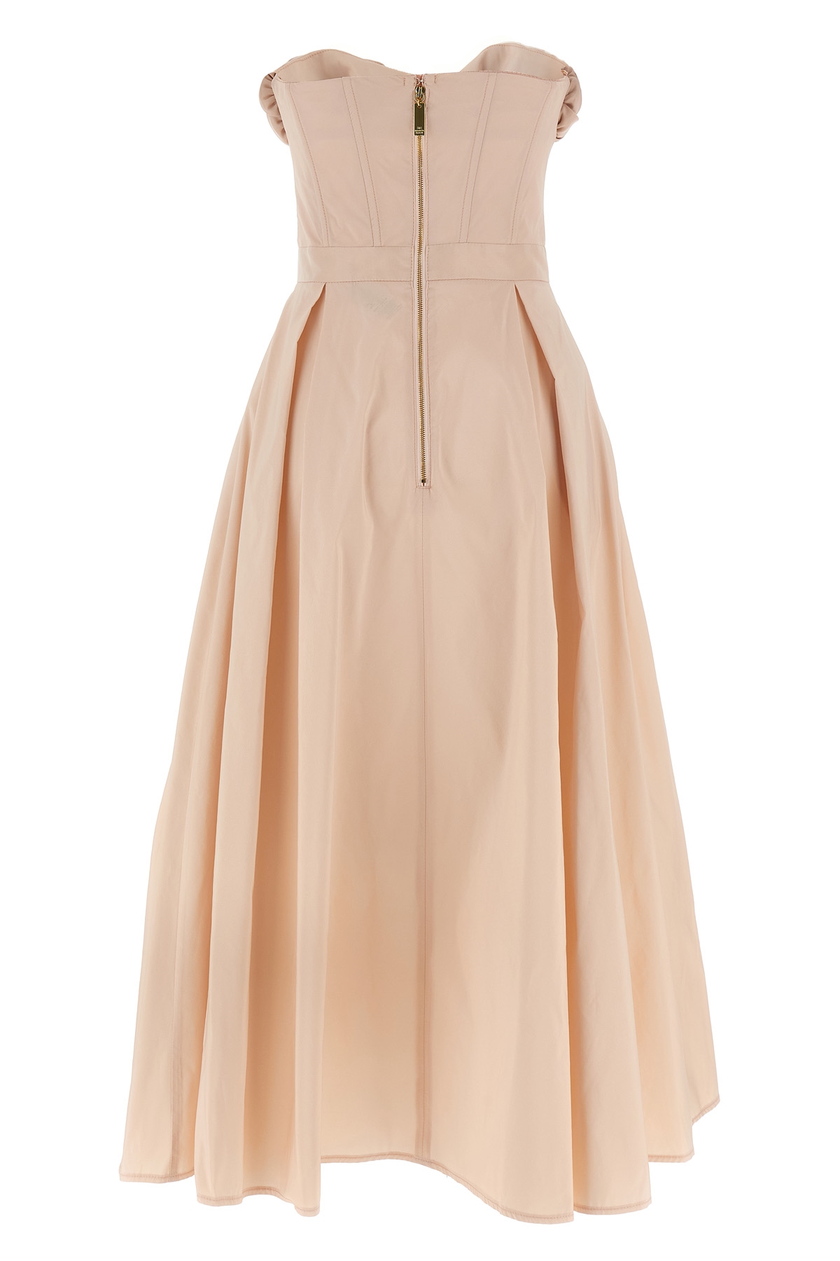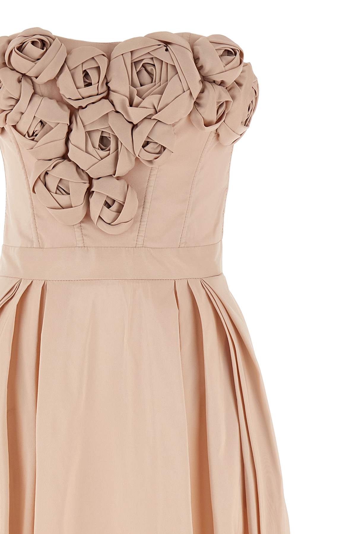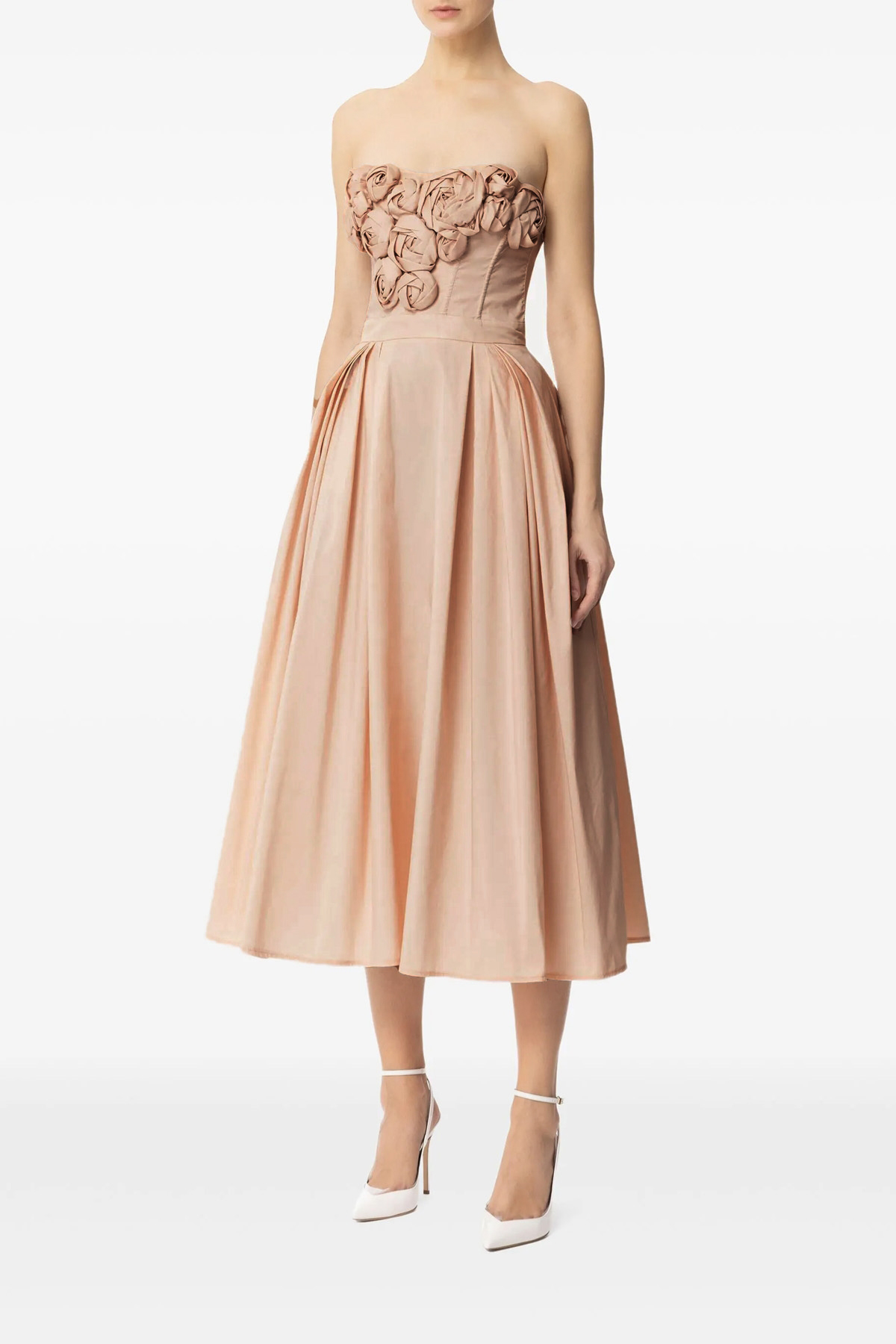 Long sleeveless dress, fenced corset style with inner bra, front floral applique, pleats at the waist, back zip closure, side pockets.