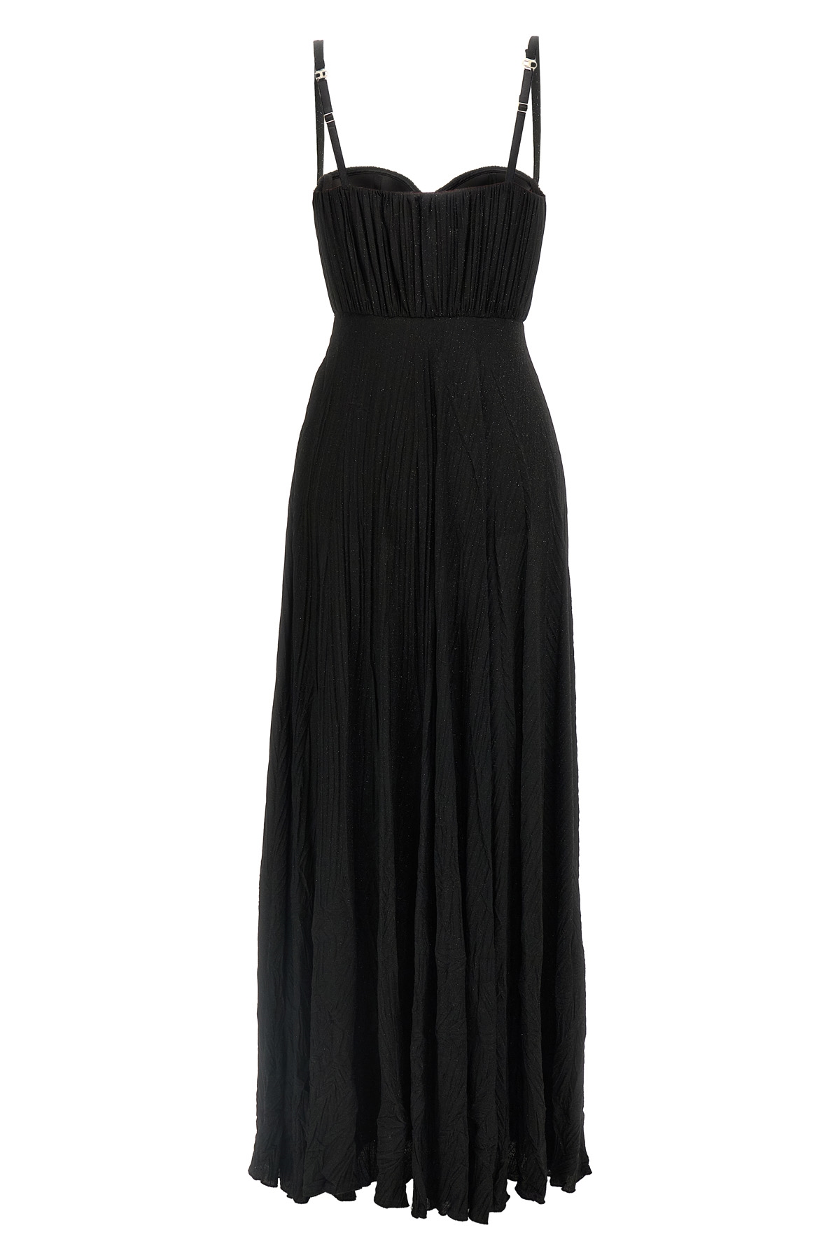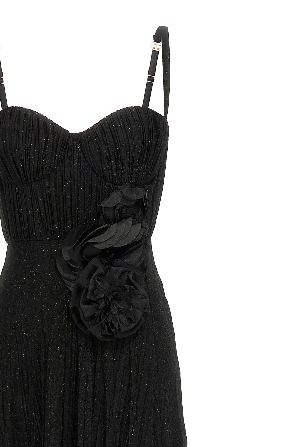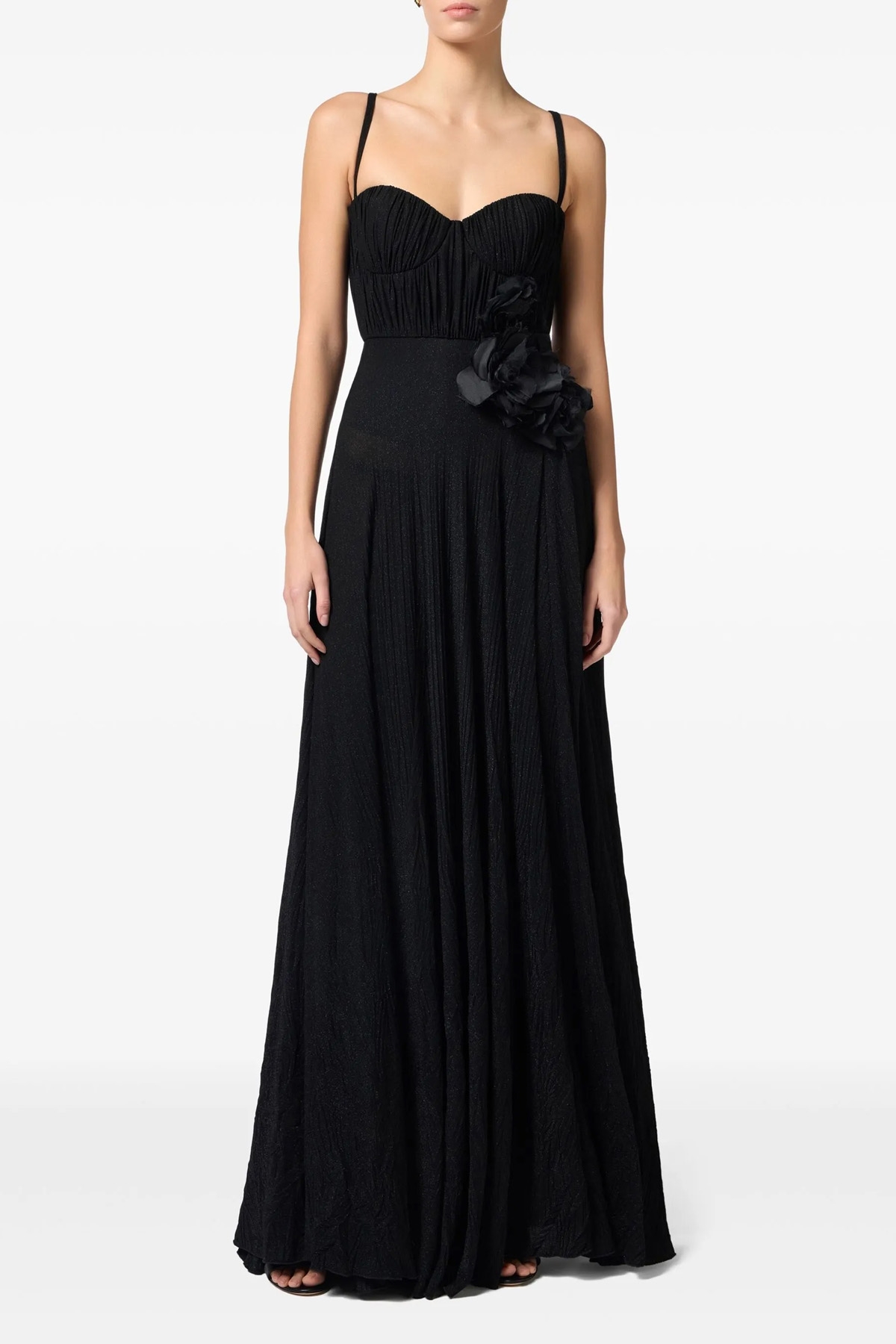 Long dress in lurex knit, pleats, front flower details, bustier style with slightly padded cups, thin straps, back zip and hook closure.