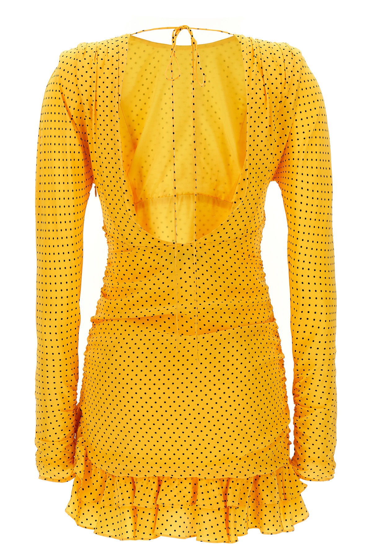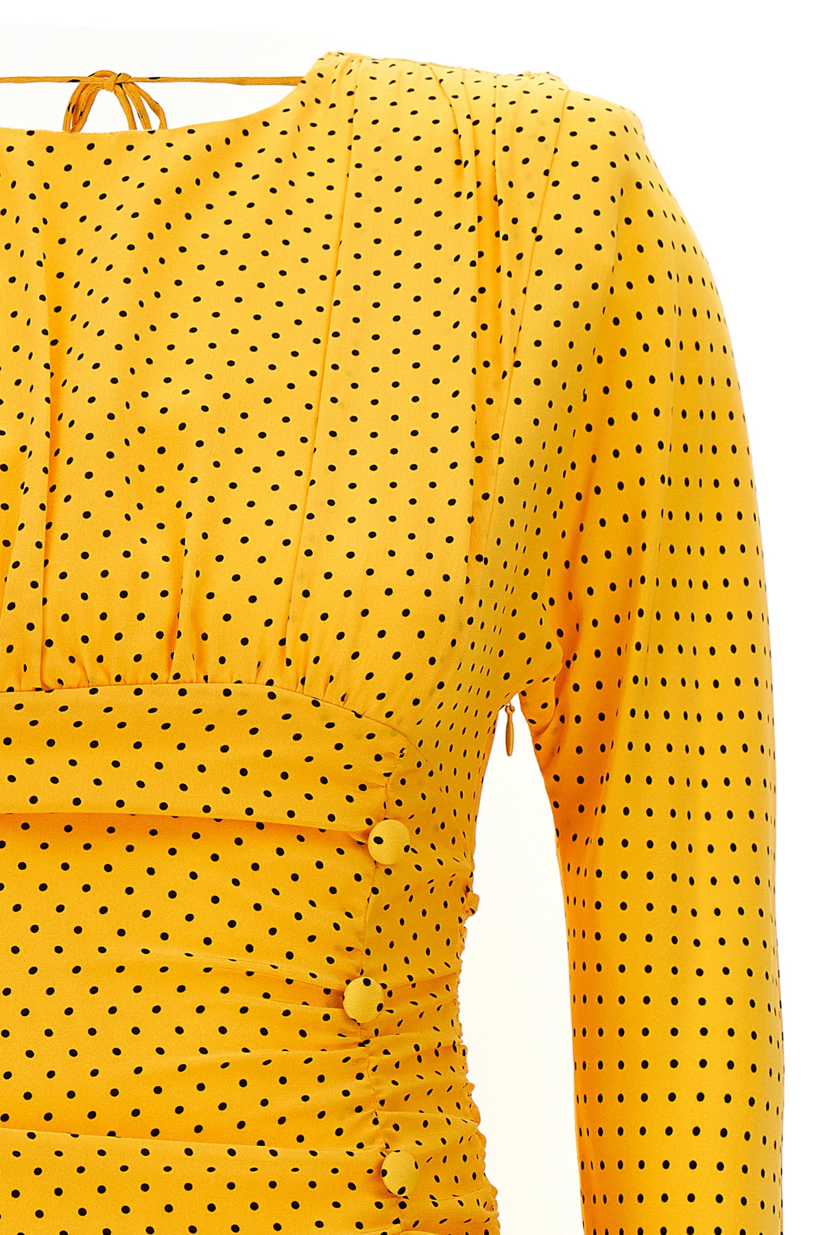 Silk mini dress with all-over polka dot print, long sleeves, crewneck with neckline on the back and a draped skirt.
