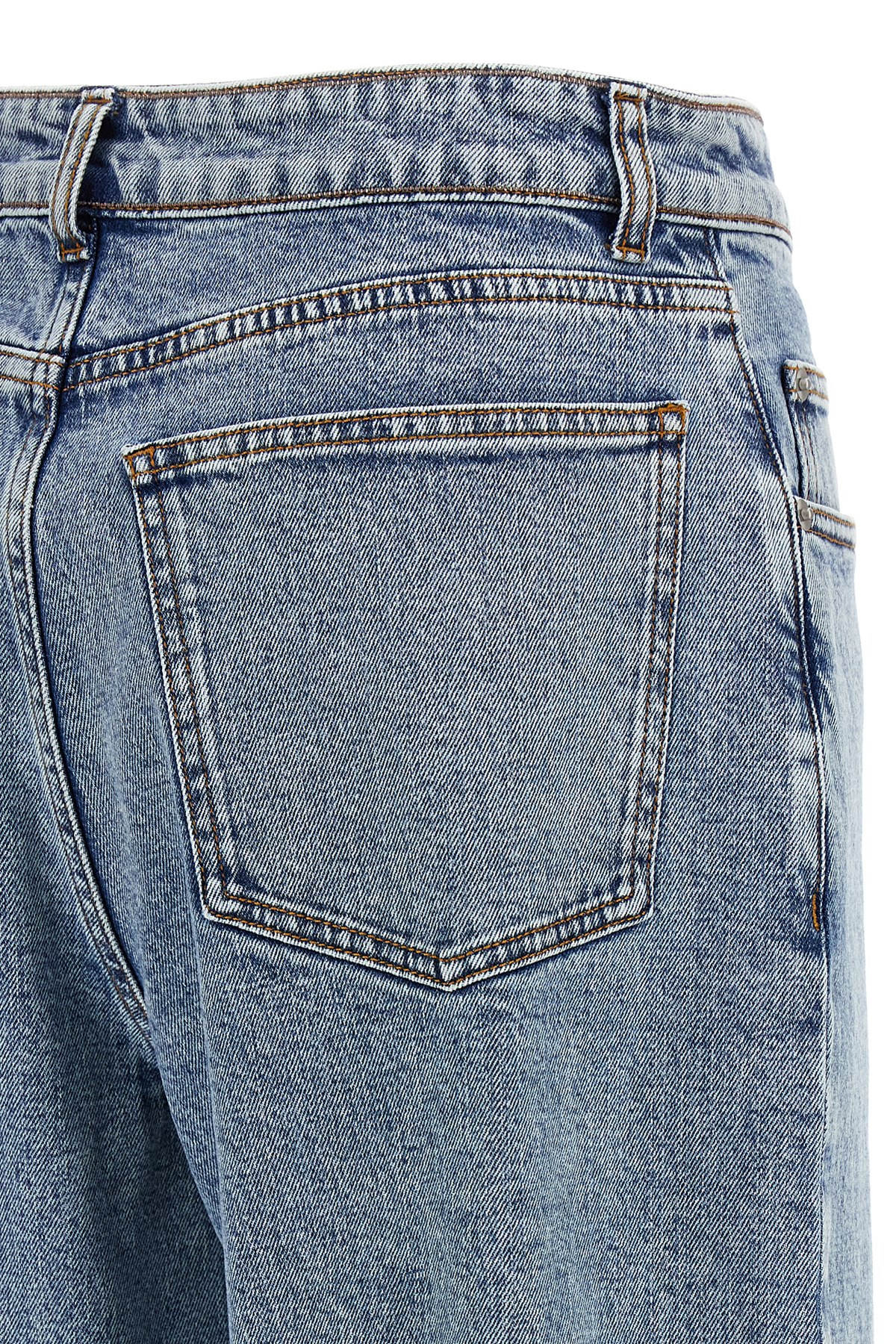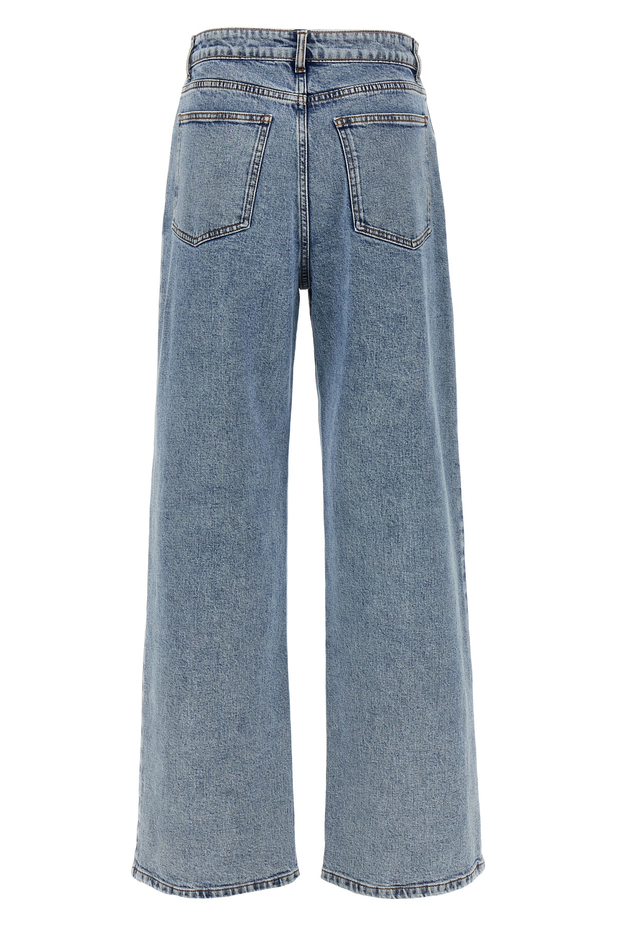 Cotton denim jeans with diamond thread detail at the waist, wide and straight leg, zip and button closure, five pockets.