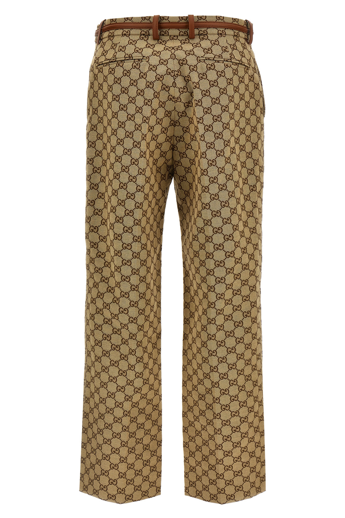 'GG' fabric trousers, leather belt with front clamp, leather trim, front stretched pleat, pockets.