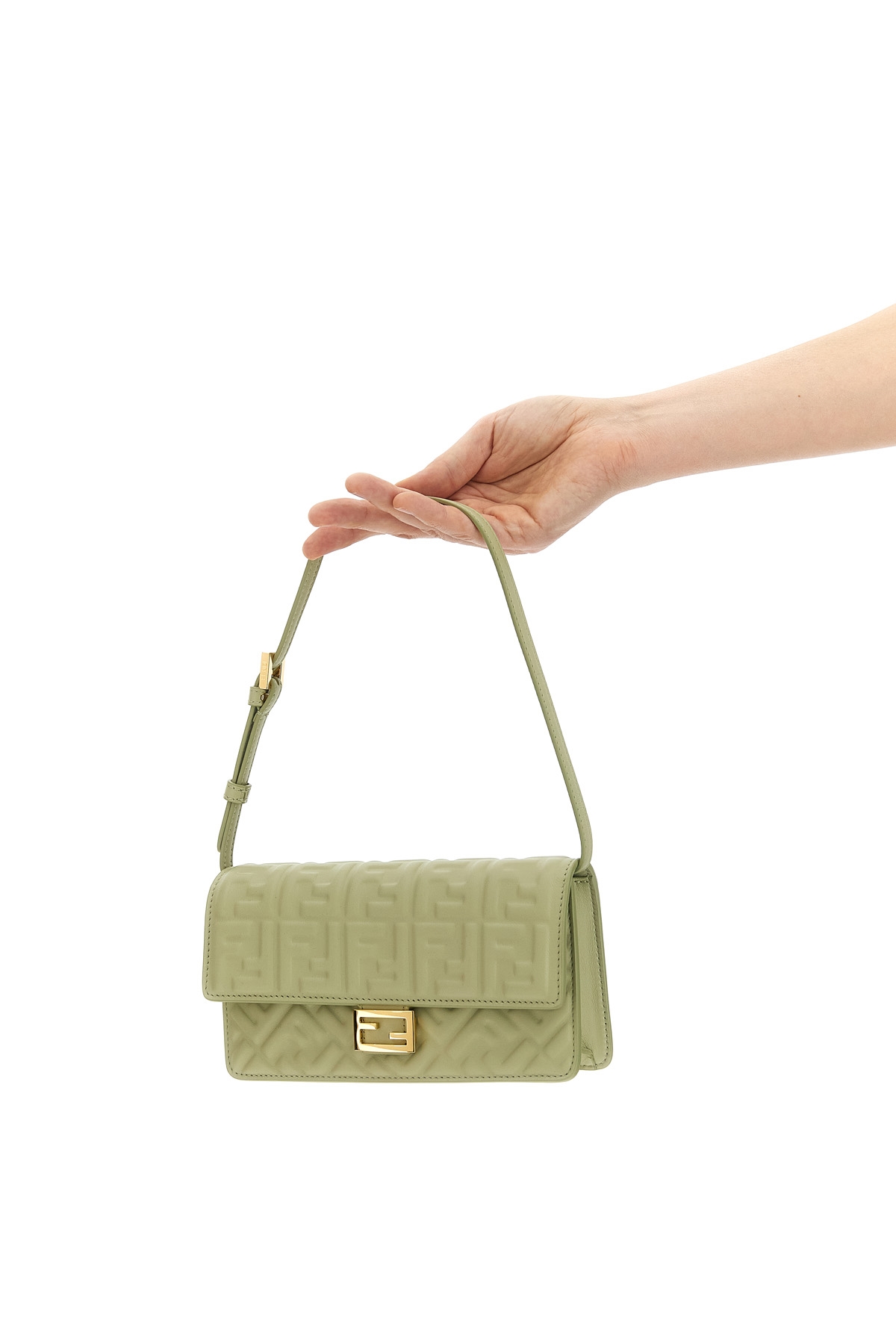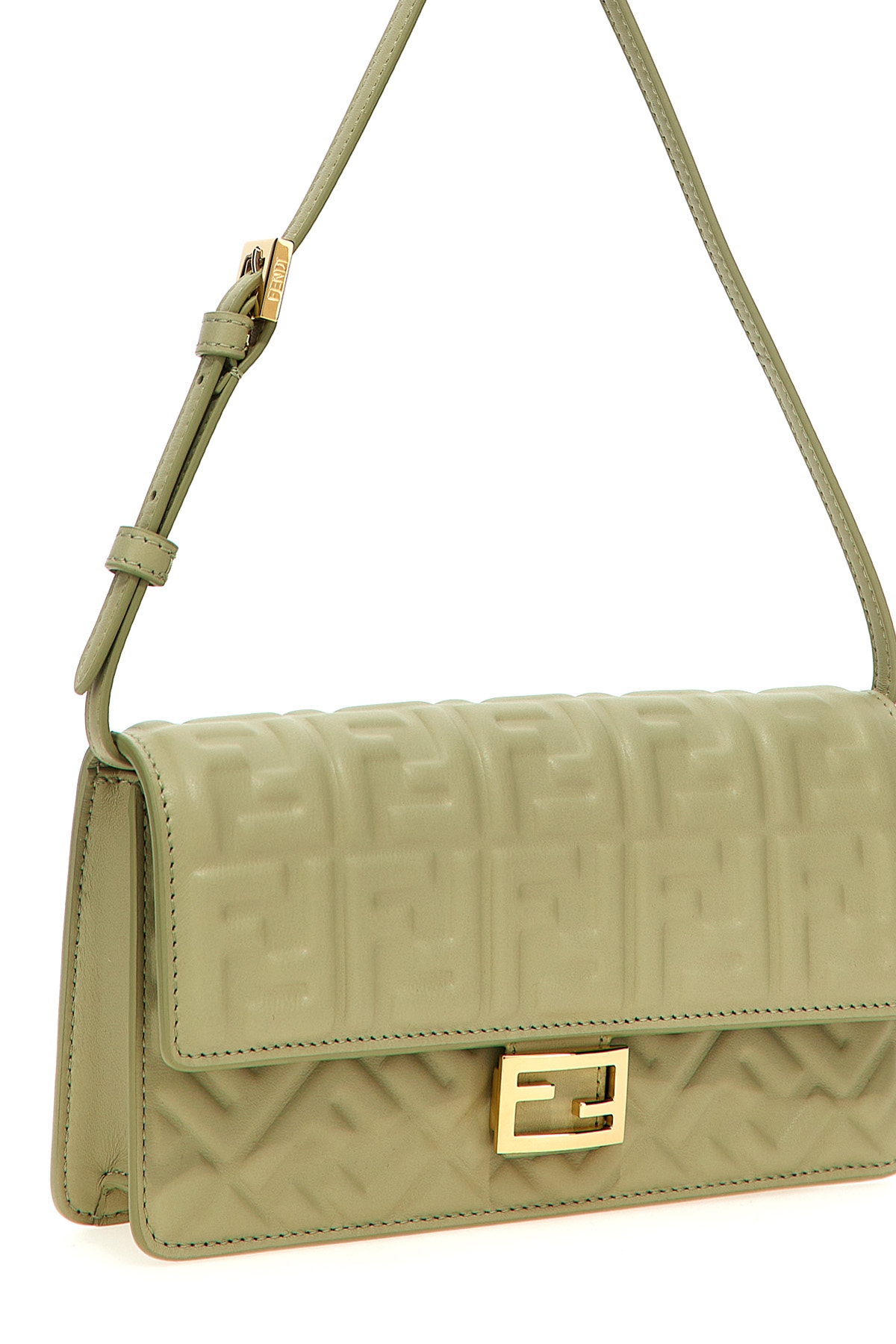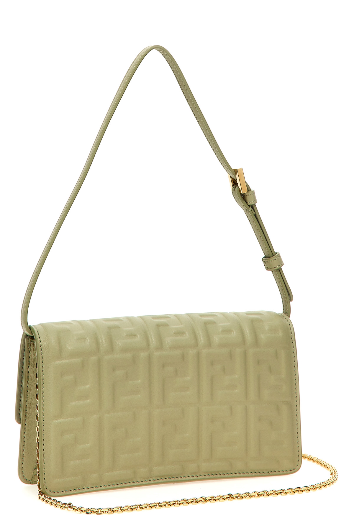'Baguette' nappa leather wallet on chain with iconic embossed FF pattern with a three-dimensional effect, flap closure with snap button and front metal logo, adjustable and removable handle, removable chain shoulder strap.