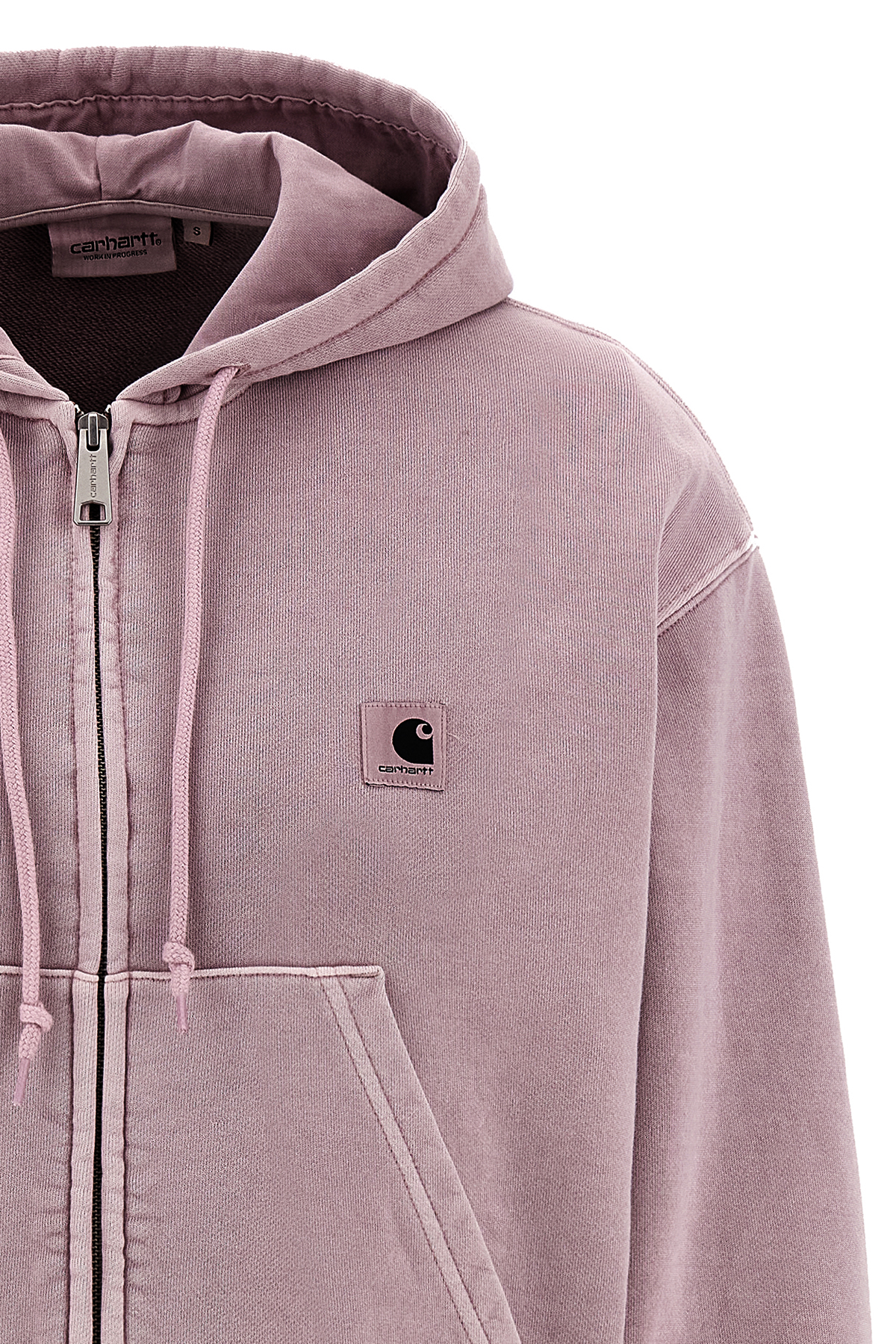 'Nelson' hoodie in heavy unbrushed cotton jersey dyed in a used-effect garment, tone-on-tone logo patch on the front, balloon cut, front zip closure, pockets, long sleeves with cuffs and dropped shoulders.