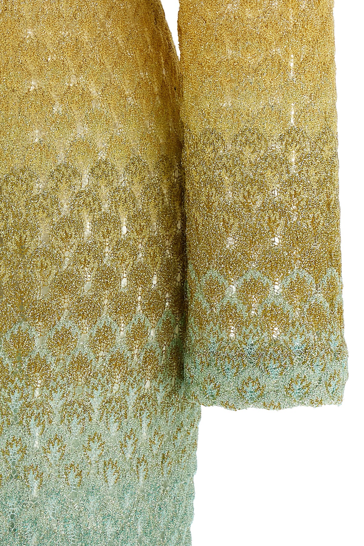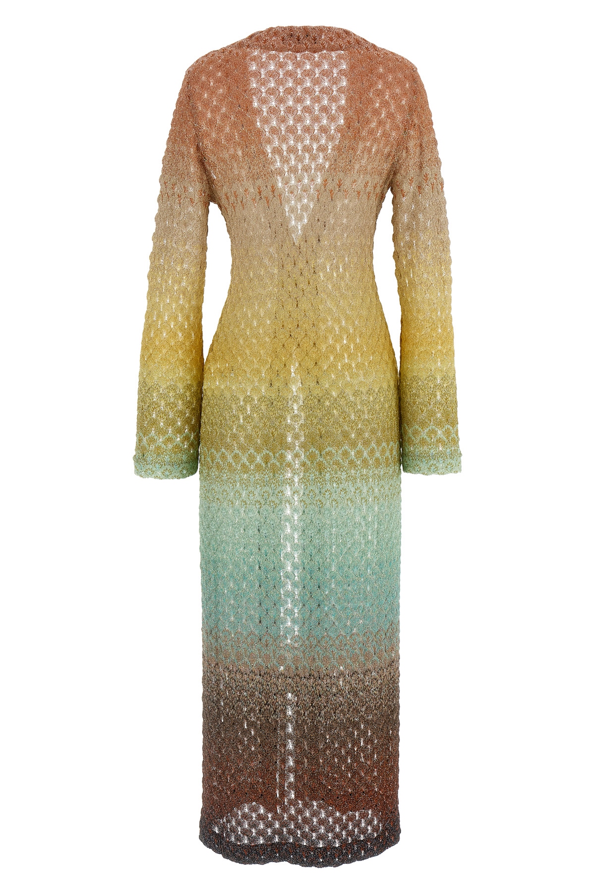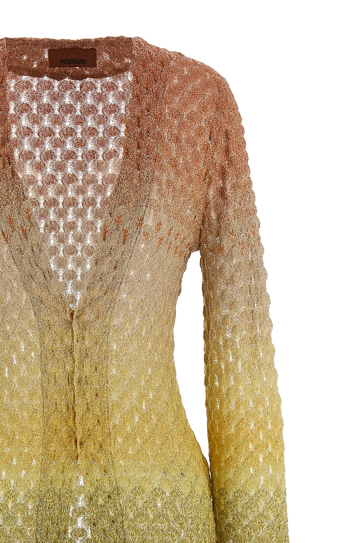 Long metalassee knit cardigan, openwork, V-neck, long sleeves, closure with three hidden buttons.