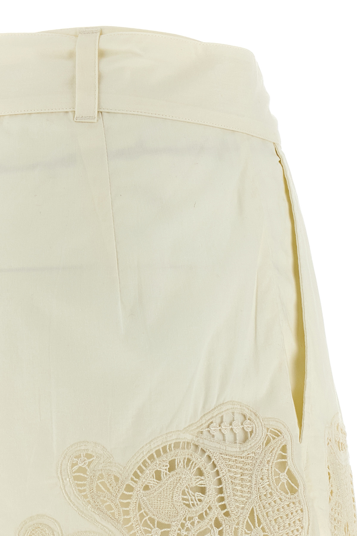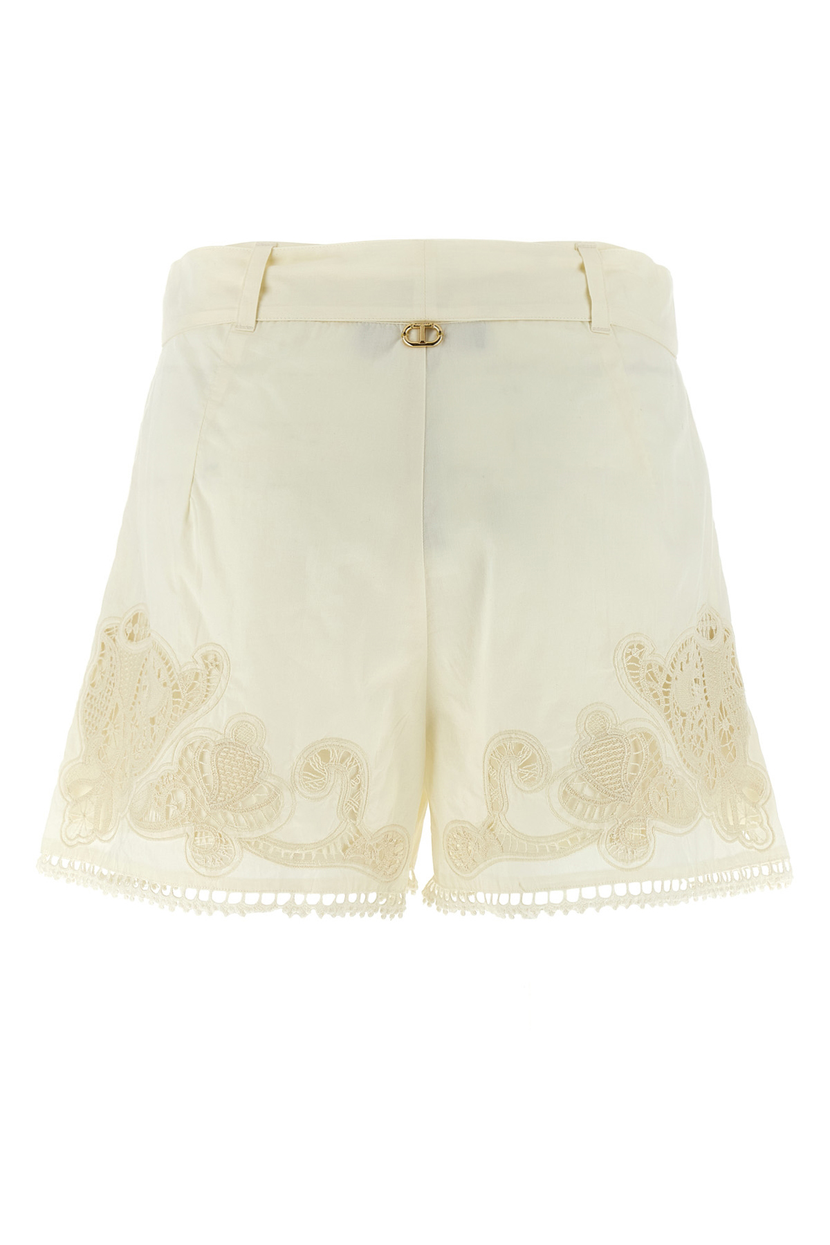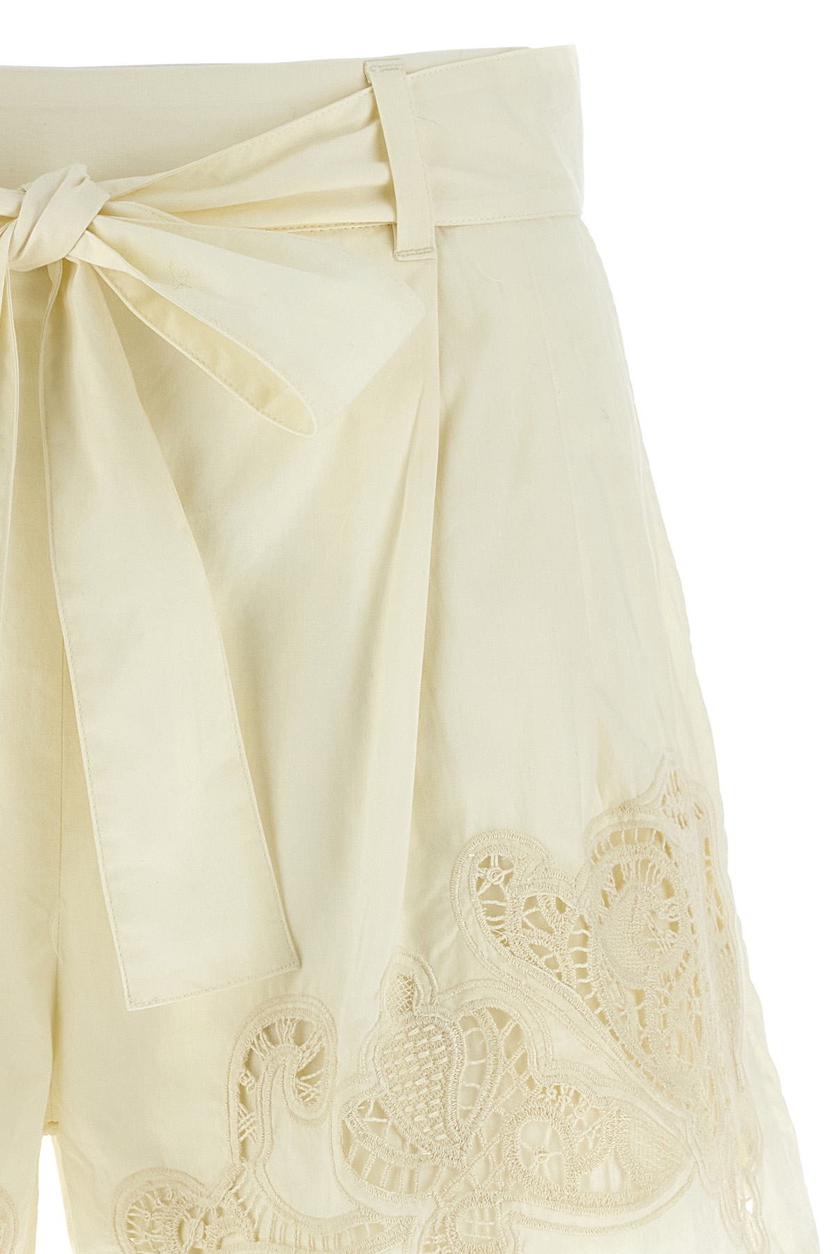 Cotton shorts with macrame insert, knotted belt at the waist, front pleats, side pockets, back metal logo detail, side zip closure.