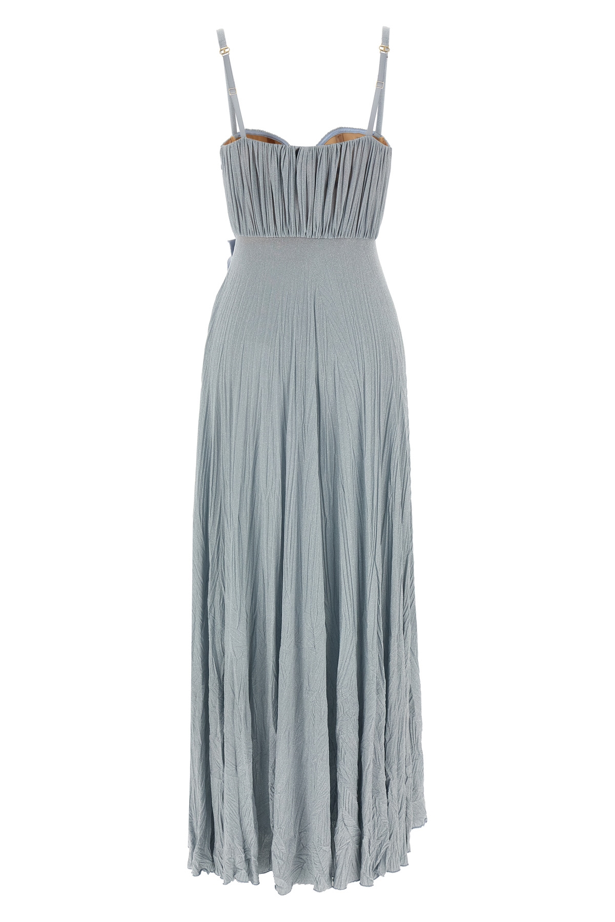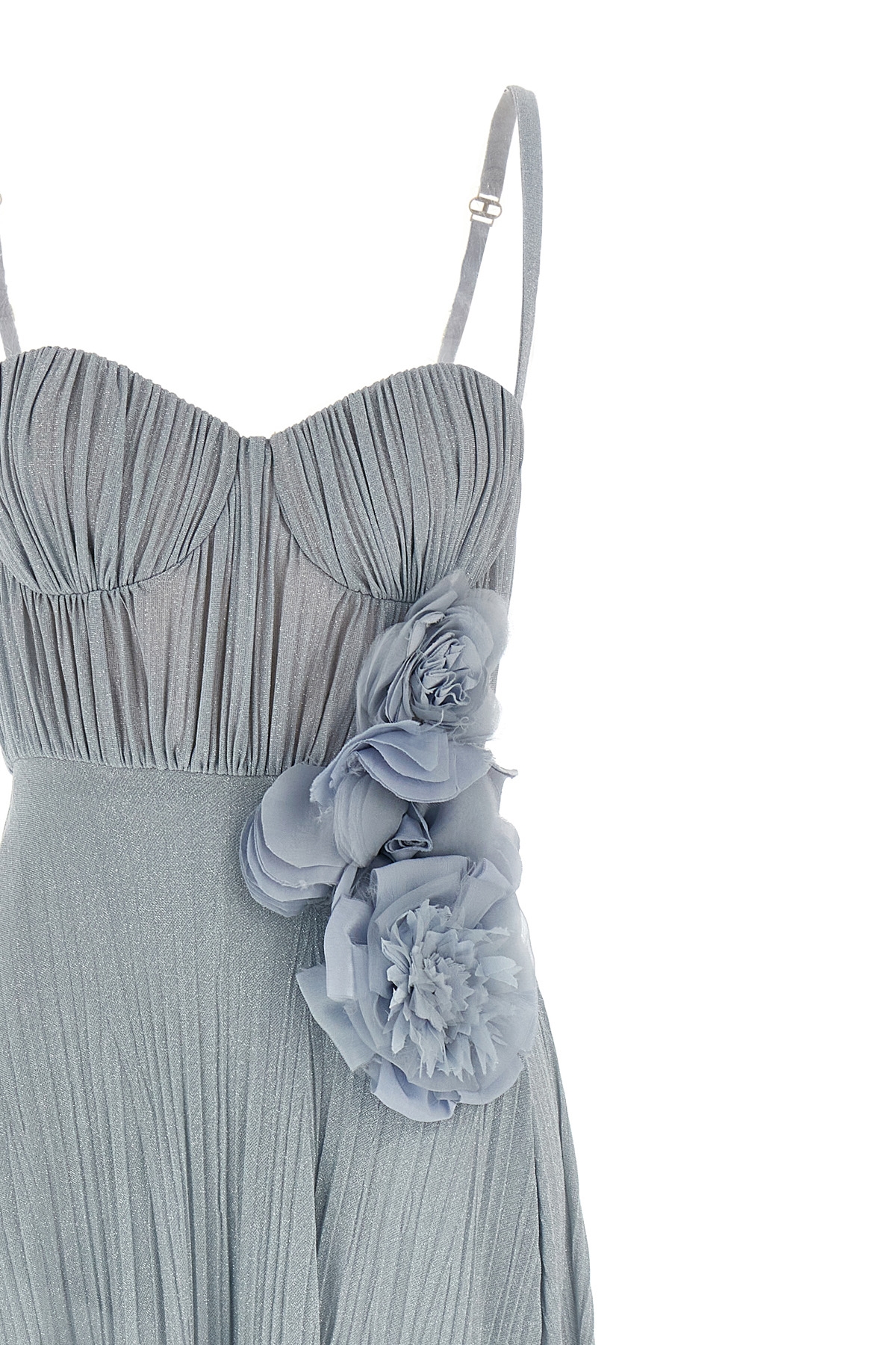 Long dress in lurex knit, pleats, front flower details, bustier style with slightly padded cups, thin straps, back zip and hook closure.