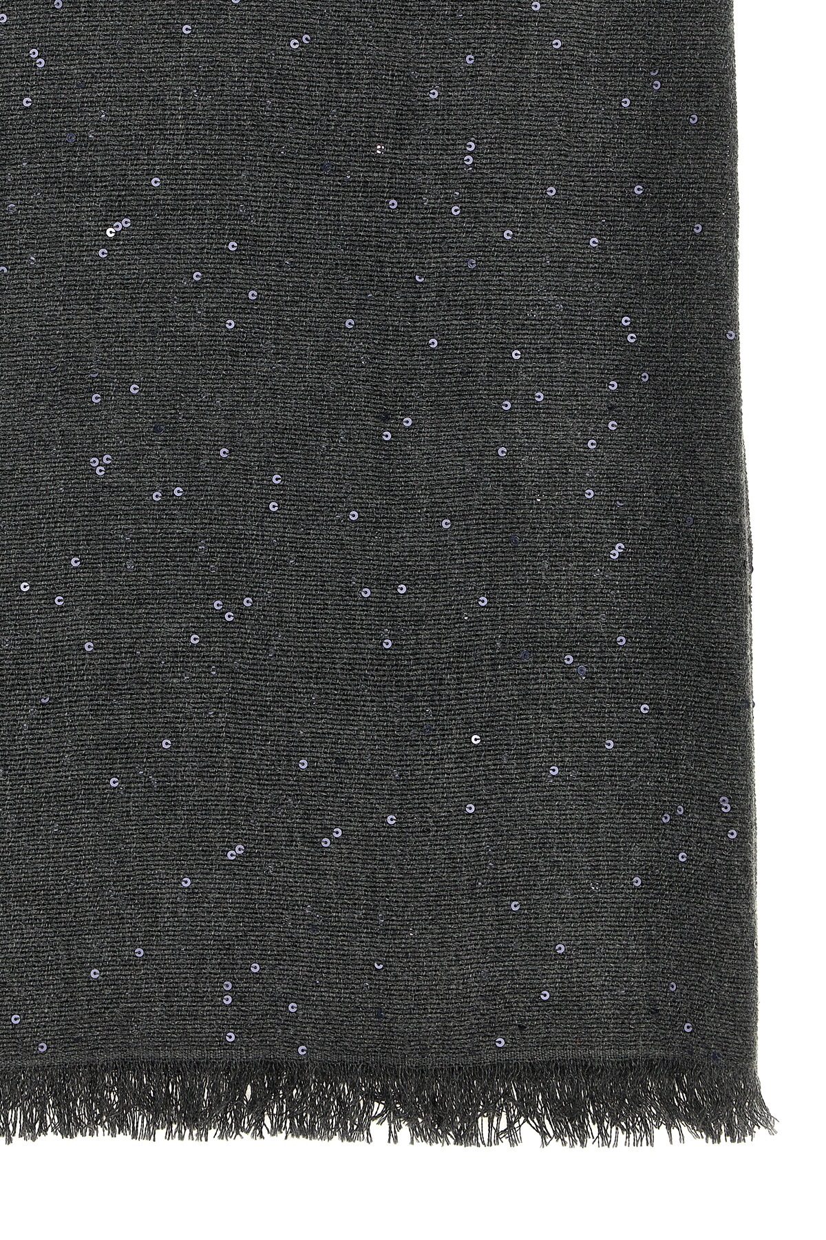 Cashmere and silk blend scarf, sequin applique, fringed edges.
