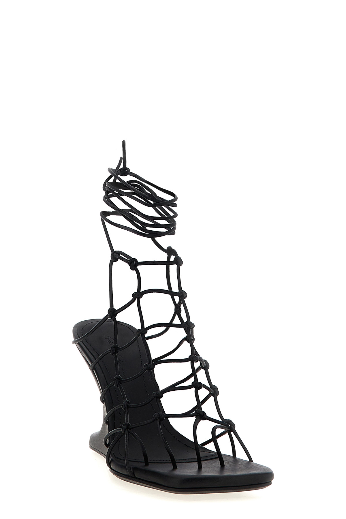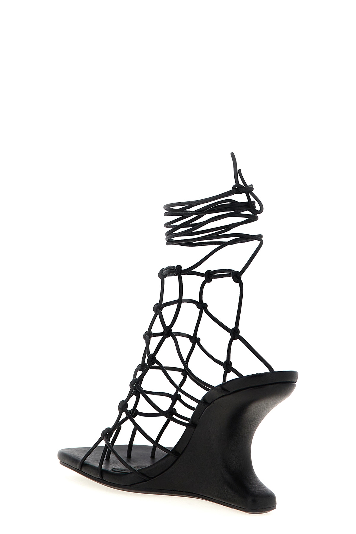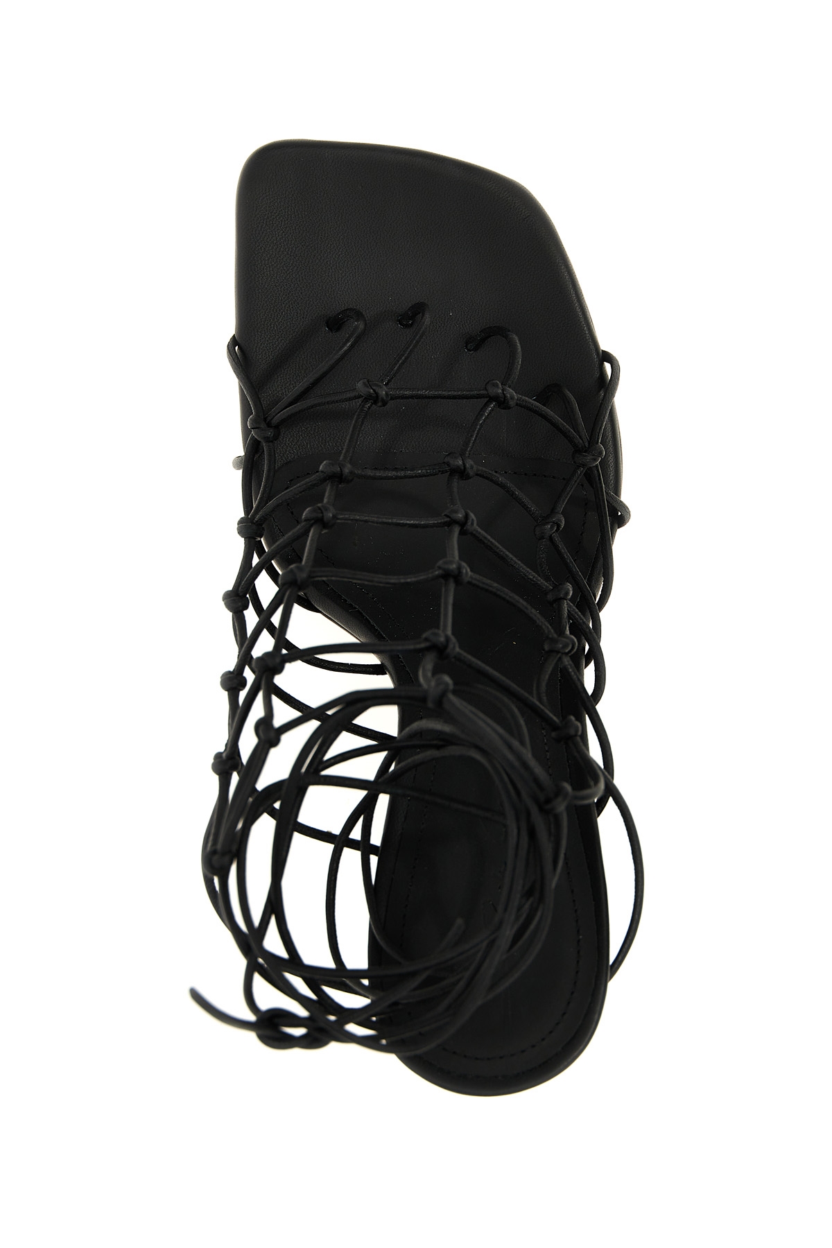 'Web Cantilever' braided leather sandals with square toe, ankle ties, cantilever heel, leather sole.