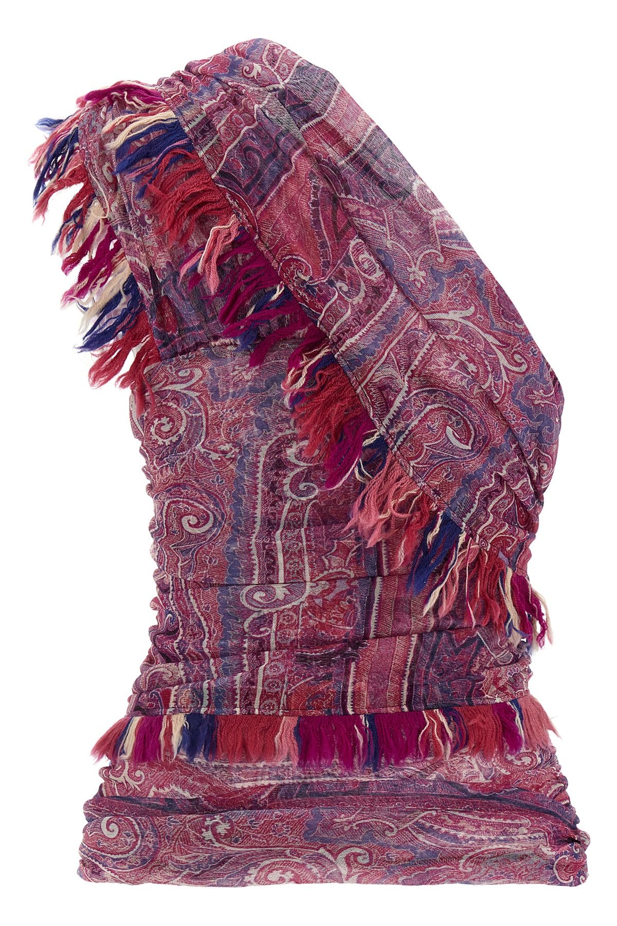 'Devona' top in draped stretch tulle with all-over print, asymmetric one-shoulder model with fringes, side zip closure.