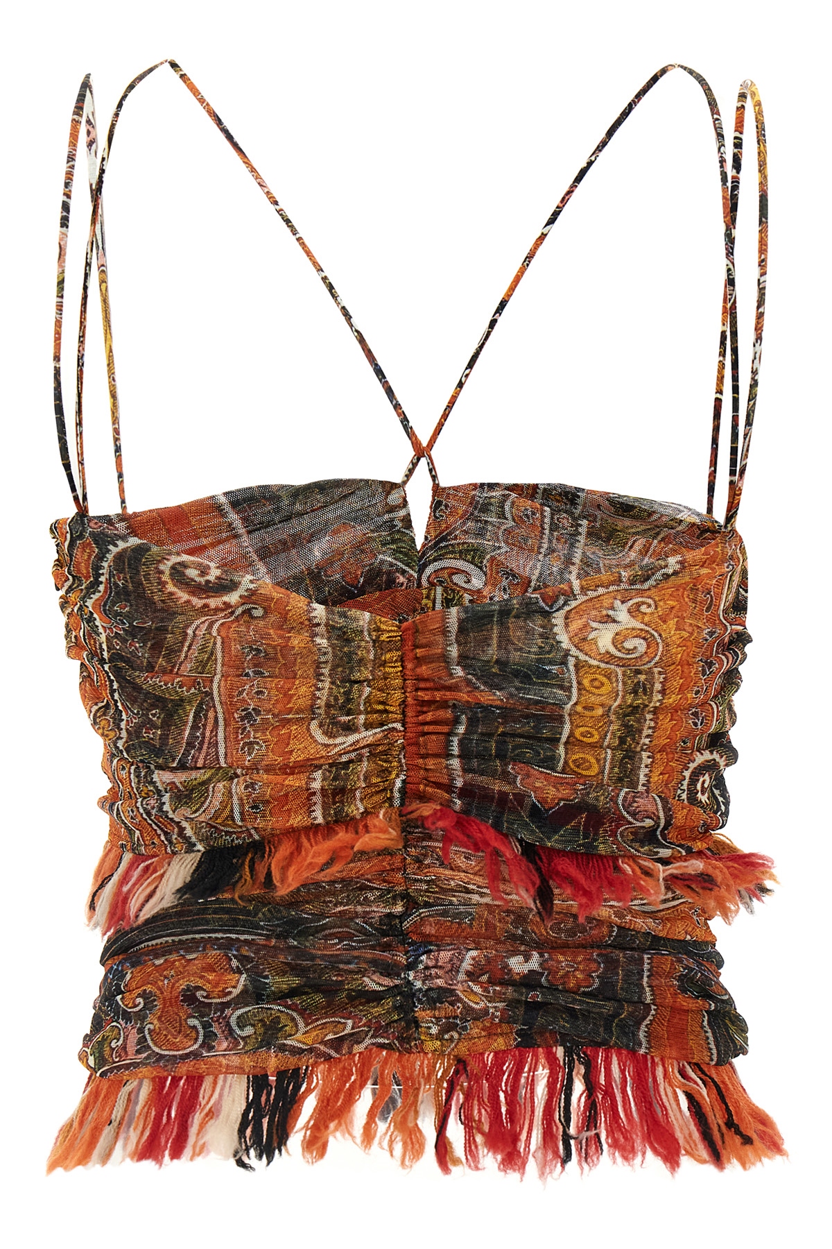 'Darlene' top in draped stretch tulle with all-over print with fringes, double thin shoulder strap, side zip closure.
