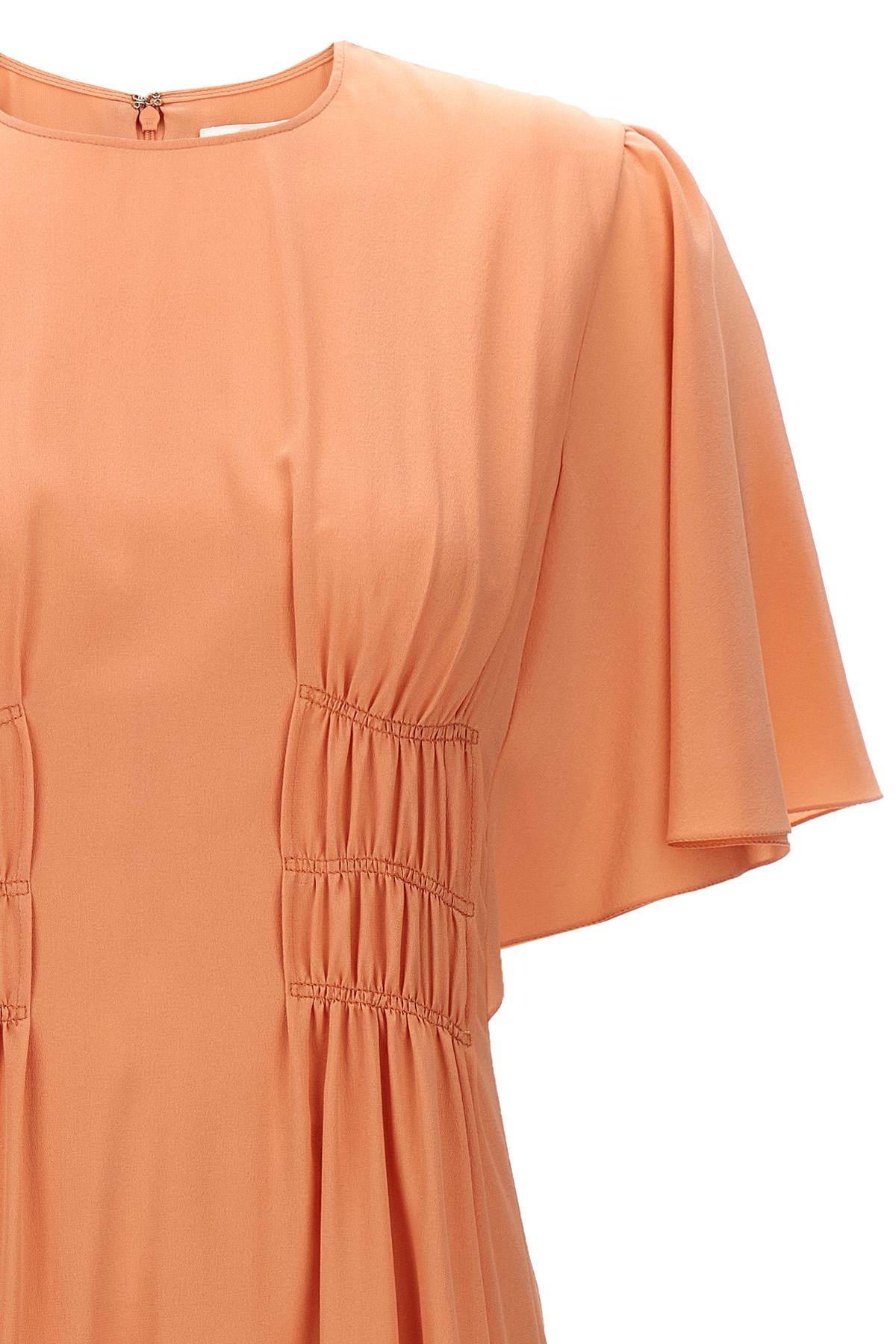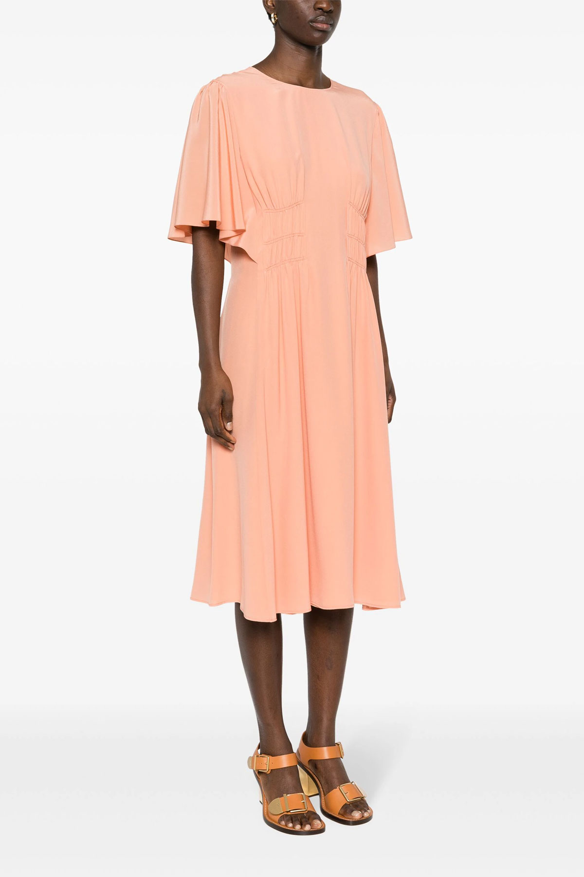 Midi silk dress with crinkled waist, short and wide sleeves, crew neck.