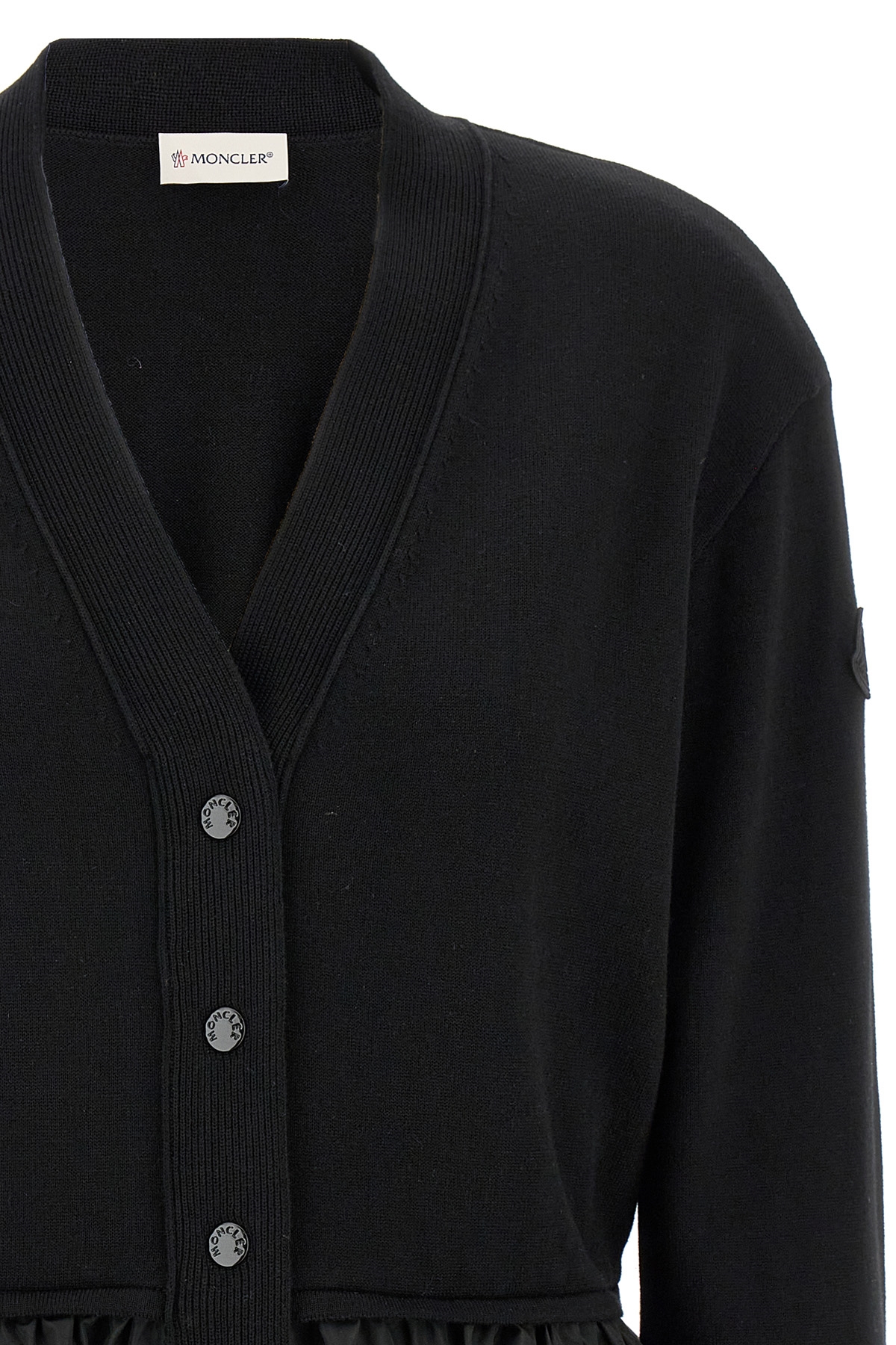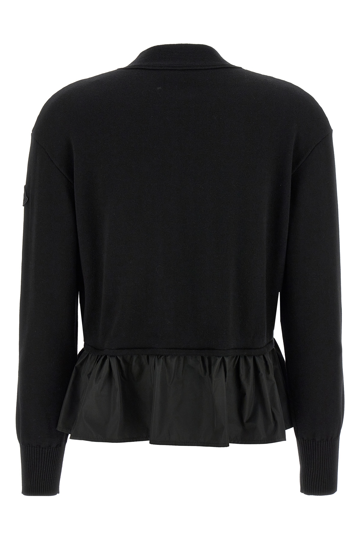 Cardigan in cashmere and cotton blend, peplums on the bottom in water-repellent technical fabric, snap button closure, V-neck, long sleeves with cuffs and tone-on-tone logo patch.