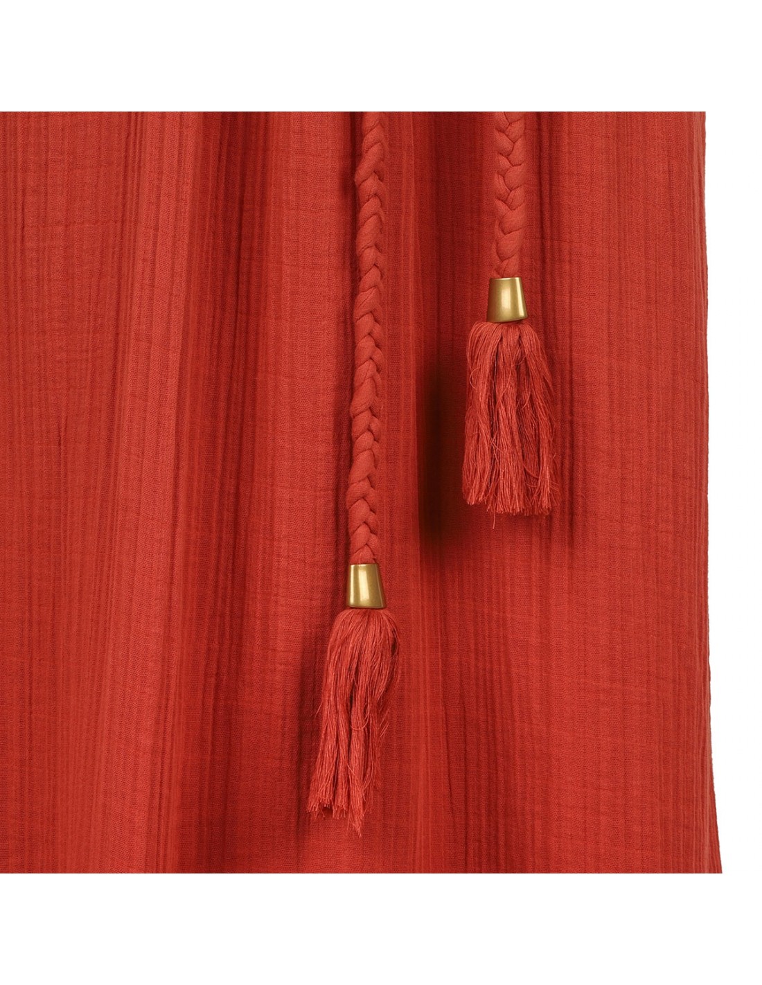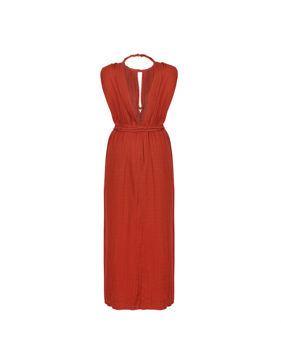Burnt orange gathered cotton Joya dress from Isabel Marant featuring flowing silhouette, open back, buttoned round neckline, openwork in front, short sleeves, braided trims, braided cotton belt with tassel ends, side pockets, hidden zip at back.