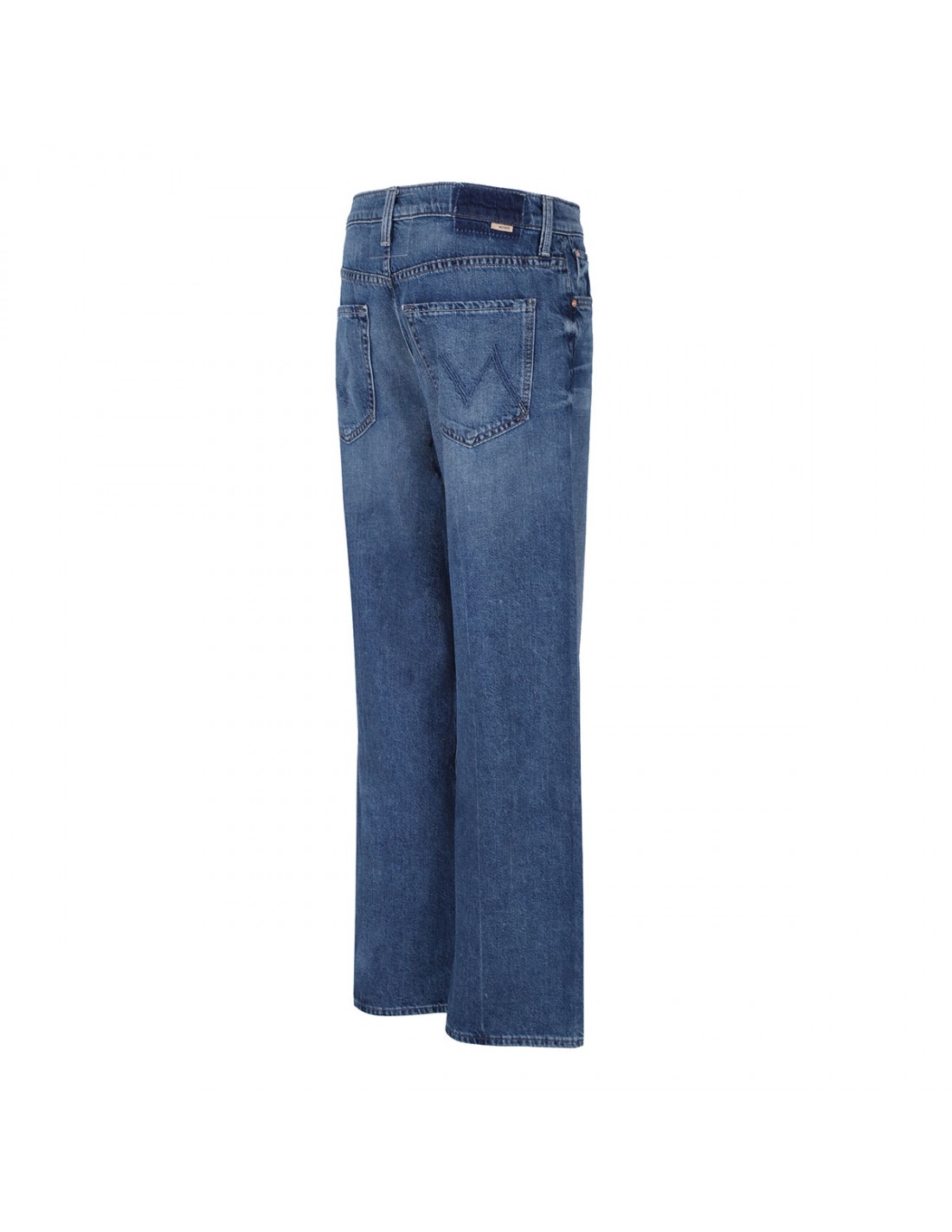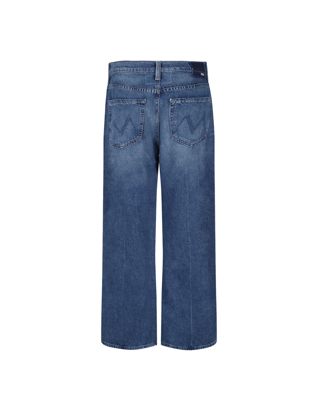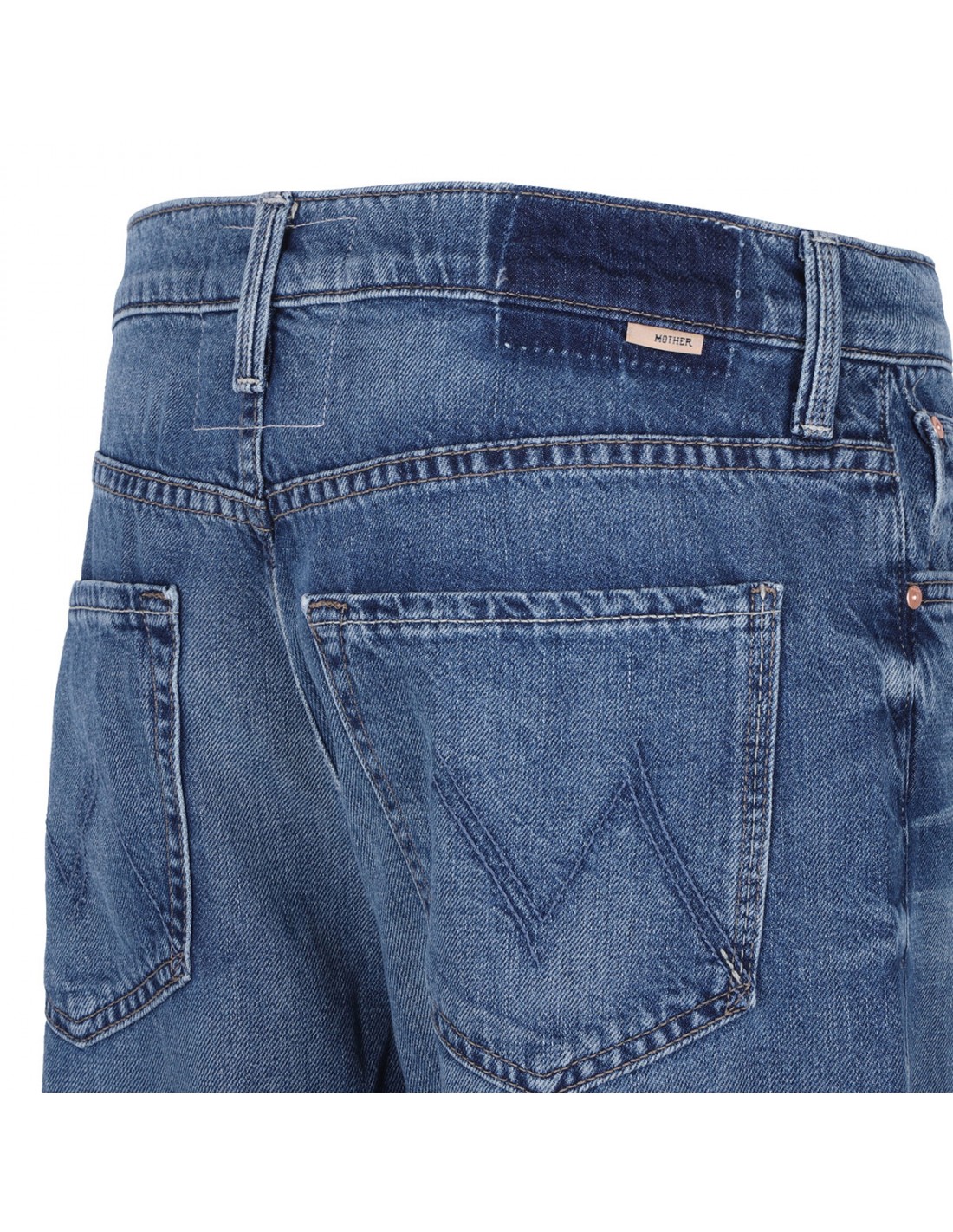 Mid-blue wash cotton denim The Dodger Ankle jeans from Mother featuring loose straight leg, whiskering and fading, ankle-length, button closure, zip fly, belt loops on the waistband, M logo embroidery on back.