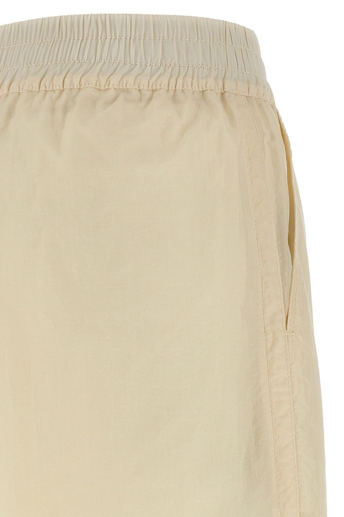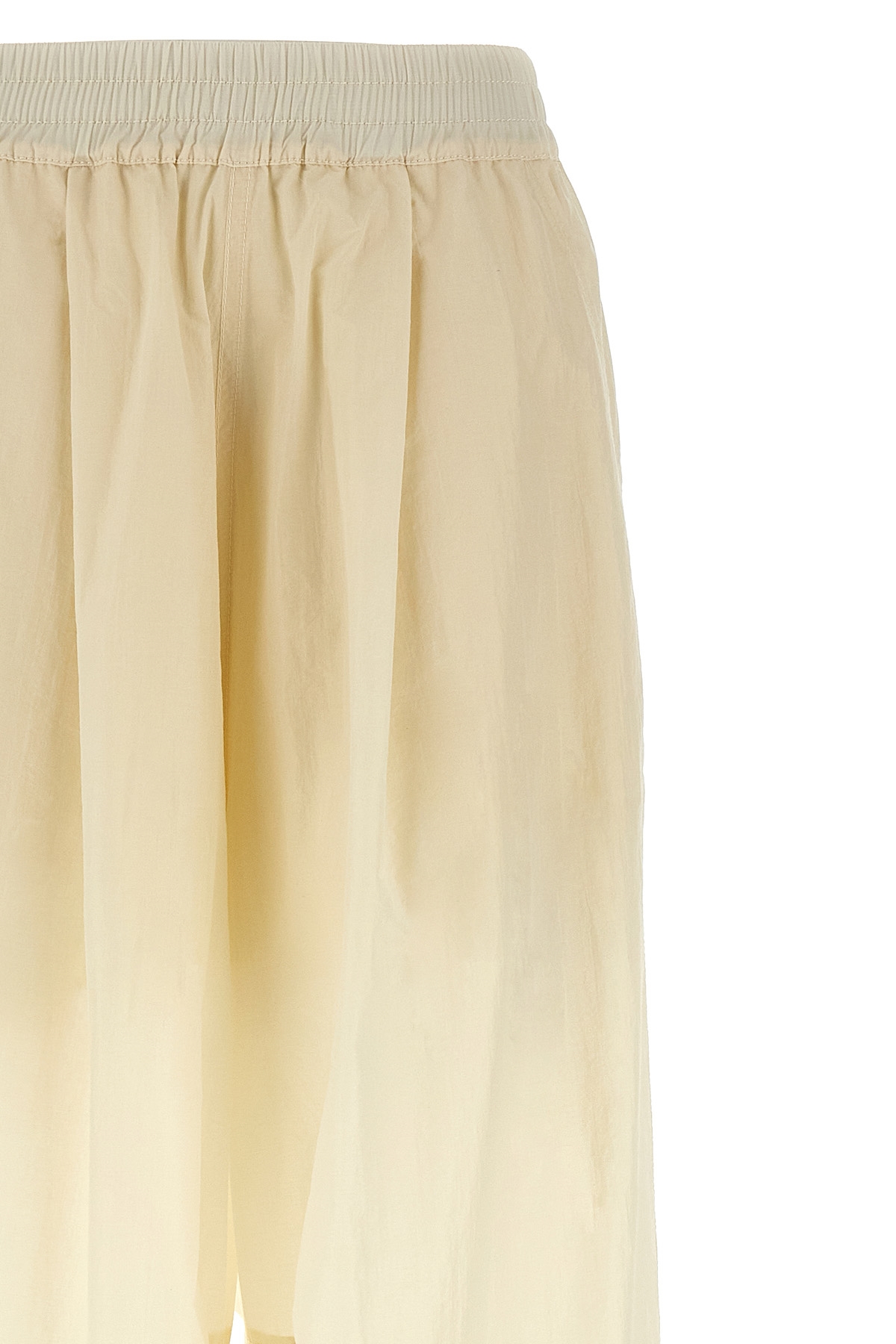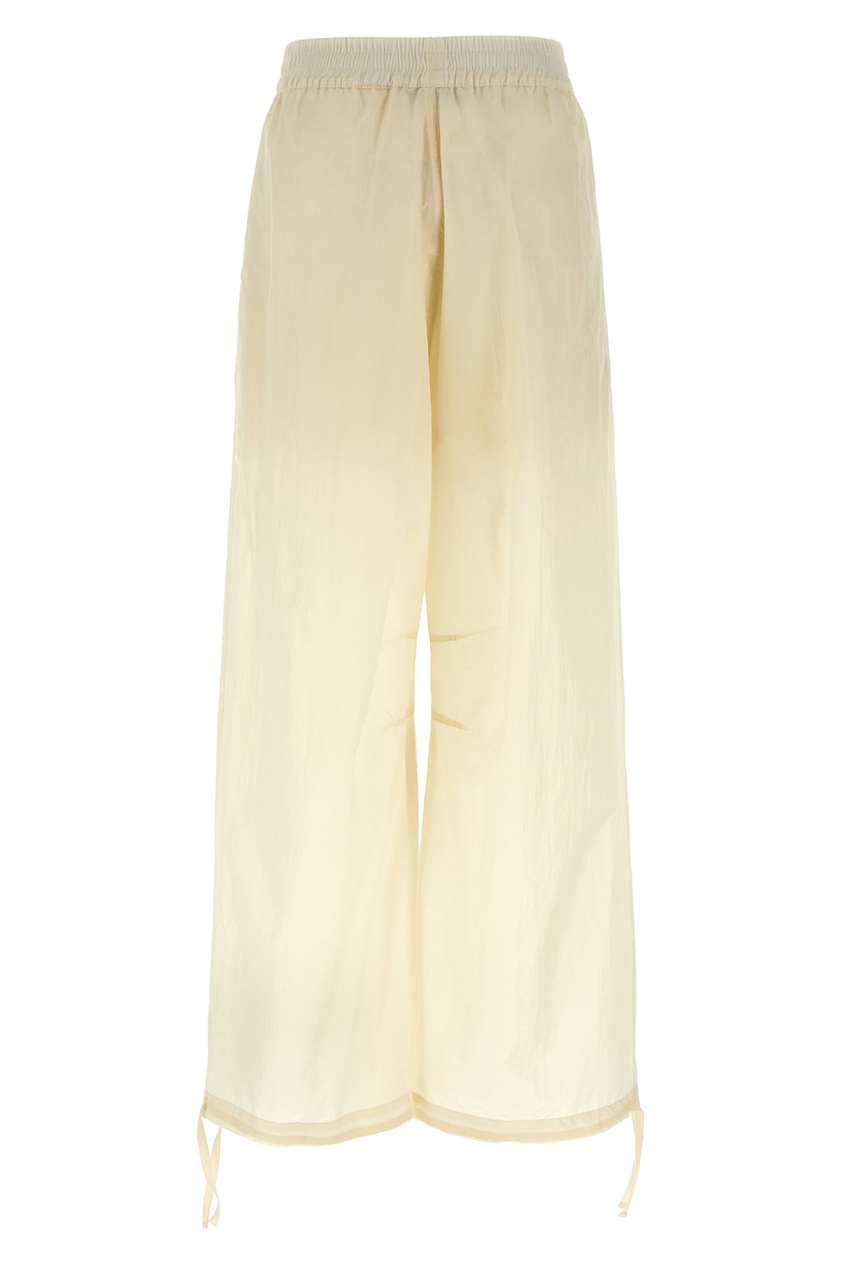 Cotton blend pants, double knee pleats, elastic waistband, pockets, wide leg with drawstring on the bottom of the leg.
