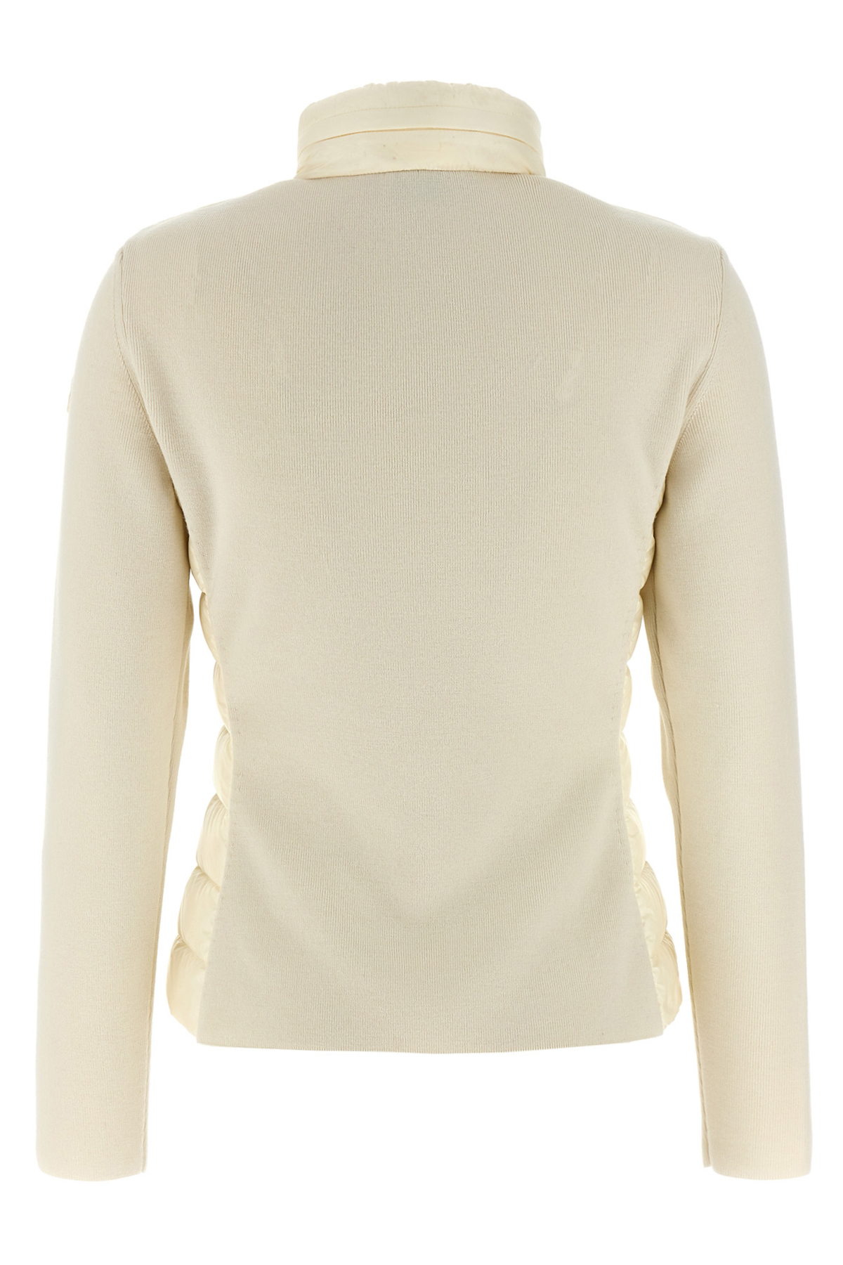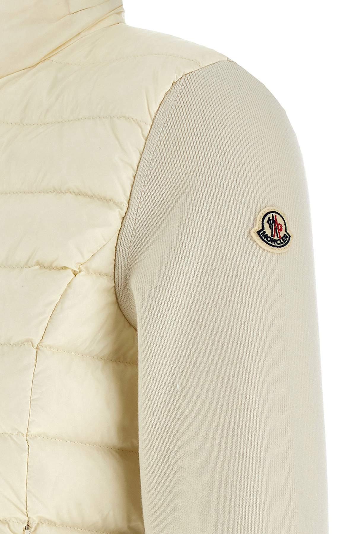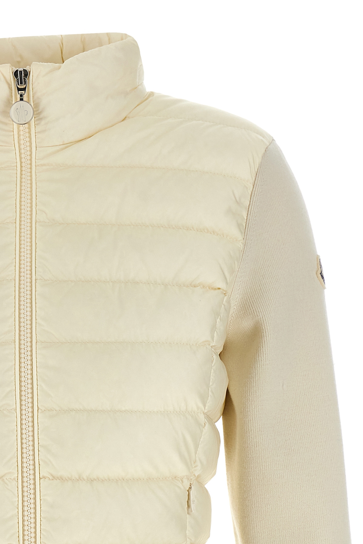 Two-material nylon cardigan padded with feather and extra fine stretch merino wool, zip closure, pockets, standing collar with removable hood in saison longue, long sleeves with logo patch.