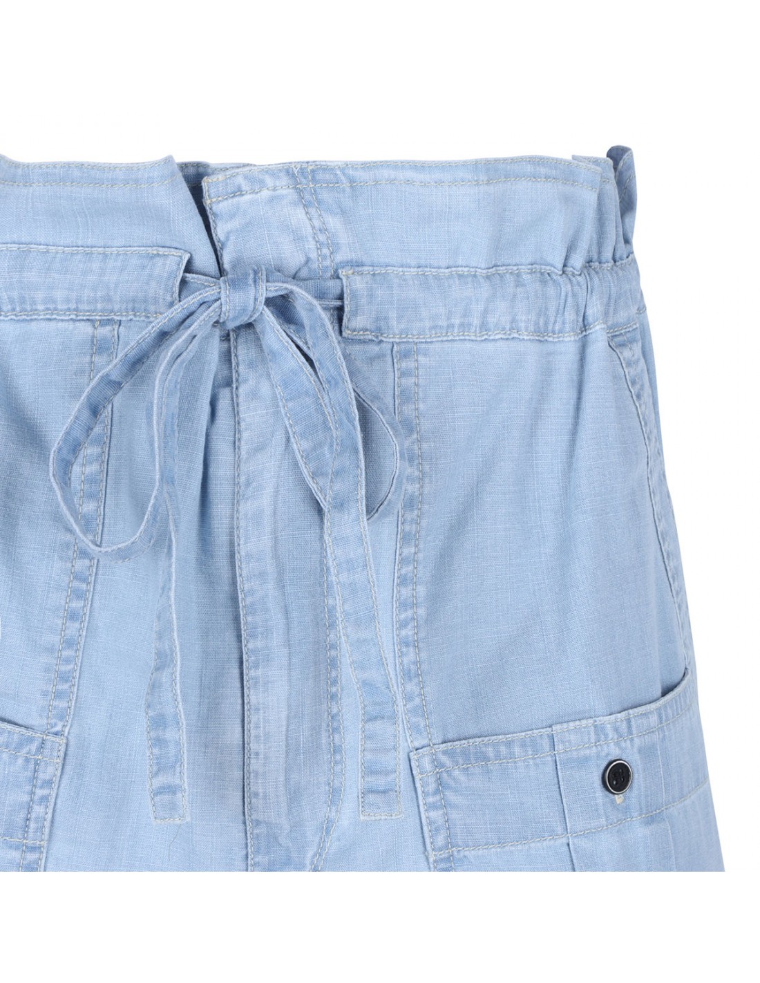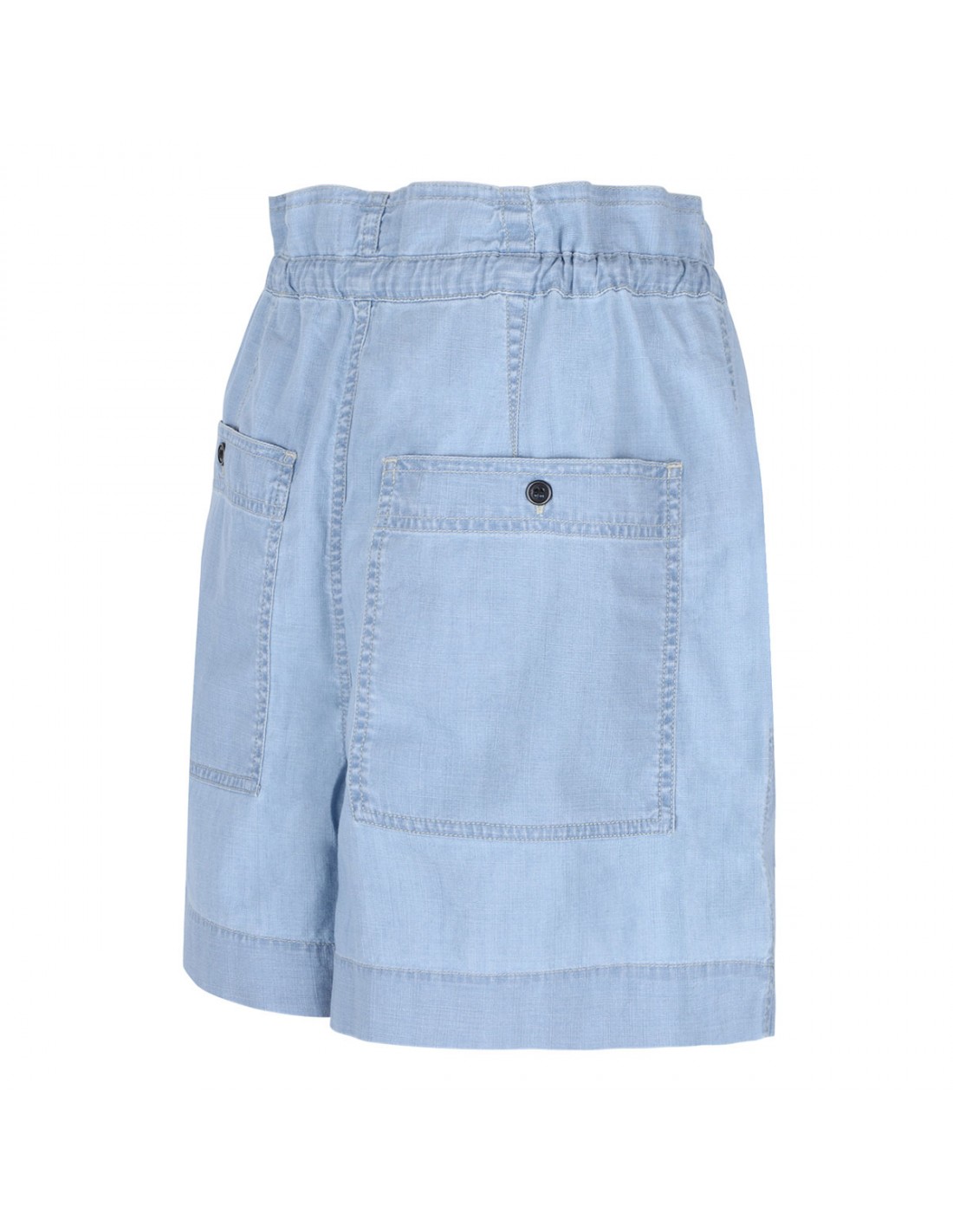 Light blue cotton-chambray Valdina shorts from Isabel Marant Etoile featuring roomy legs, pleated buttoned pockets at the thighs, high paperbag waist with drawstring, back buttoned patch pockets.